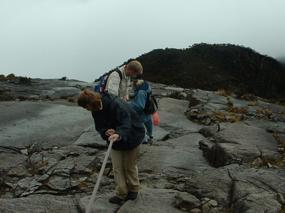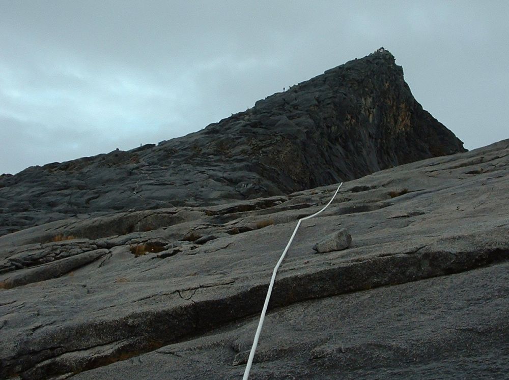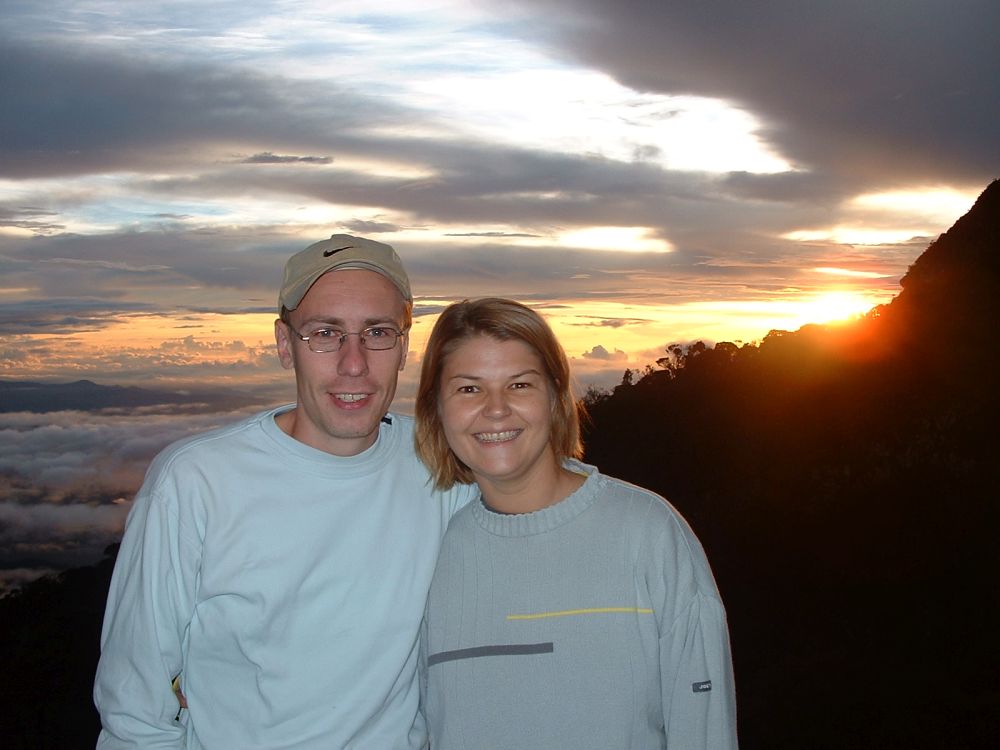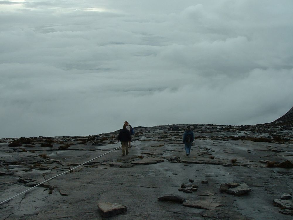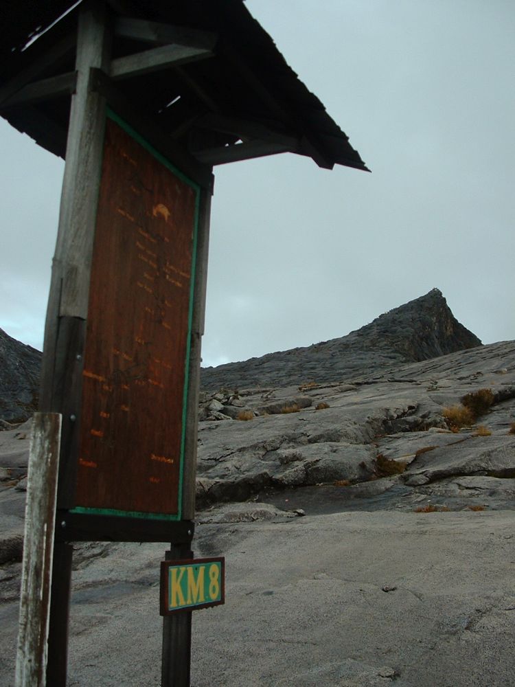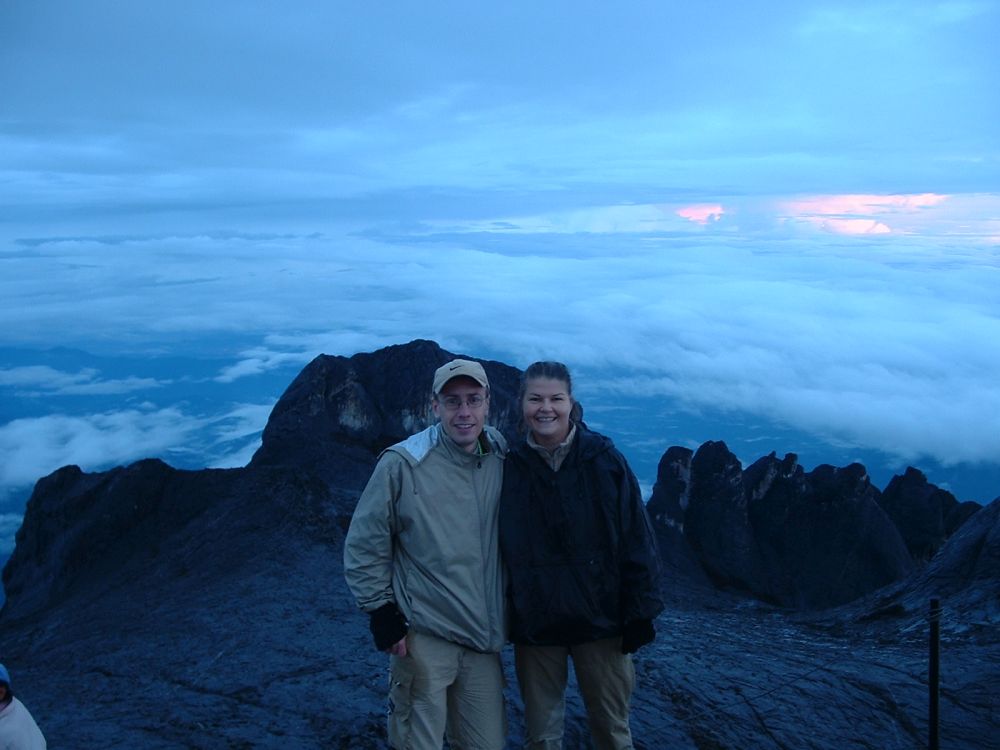 Vi landede med en god gang jetlag i Kota Kinabalu efter en laang flyvetur via både Bangkok og Brunei. Fandt et sløjt sted at bo på – men fik dog der arrangeret vores næste par dages tur til toppen Mt. Kota Kinabalu i næten 4.100 meters højde – Sydøst Asiens højeste bjerg. Allerede dagen efter begav vi os den korte tur til foden af bjerget, og tilbragte resten af dagen og natten der, i selve hovedcampen inden vi næste morgen med vores guide begav os opad. Det var en hård tur hvor det kun gik op og op. På trods af den frodige regnskov vi startede i så vi ikke mange dyr. Om eftermiddagen nåede Laban Rata restcamp i ca. 3.350 meters højde i silende regn. På et tidspunkt var der tale om at turen til toppen næste mogen ville aflyses pga. for meget regn. Her tilbragte vi så eftermiddagen med at spise og drikke inden vi gik tidligt i seng. Vi sov i små træhytter med køjesenge, og det var meget begrænset med søvn man fik da det var koldt til trods for vi sov med alt tøjet på. Kl. 02:00 var det op og på farten igen så vi kunne nå toppen inden solopgangen.
