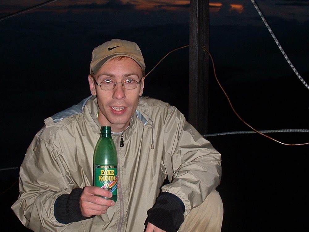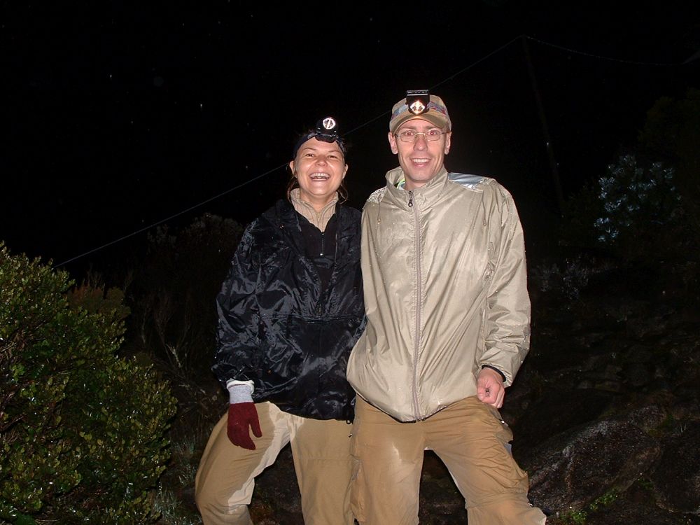 Det regnede stadig da vi begynde den sidste opstigning og Tina havde meget svært ved at se det sjove i at fortsætte – men hun valgte heldigvis at fortsætte (hvilket hun nok er glad for her bagefter). Kort før solopgang nåede vi endelig toppen – desværre var det ikke nogen fantastisk solopgang vi blev vidner til, da skyerne lå som en tung dyne under os. Men det var temmelig overskyet, men en fed fornemmelse at stå der, og utroligt så hurtigt man glemmer hvor hårdt det var at komme derop.