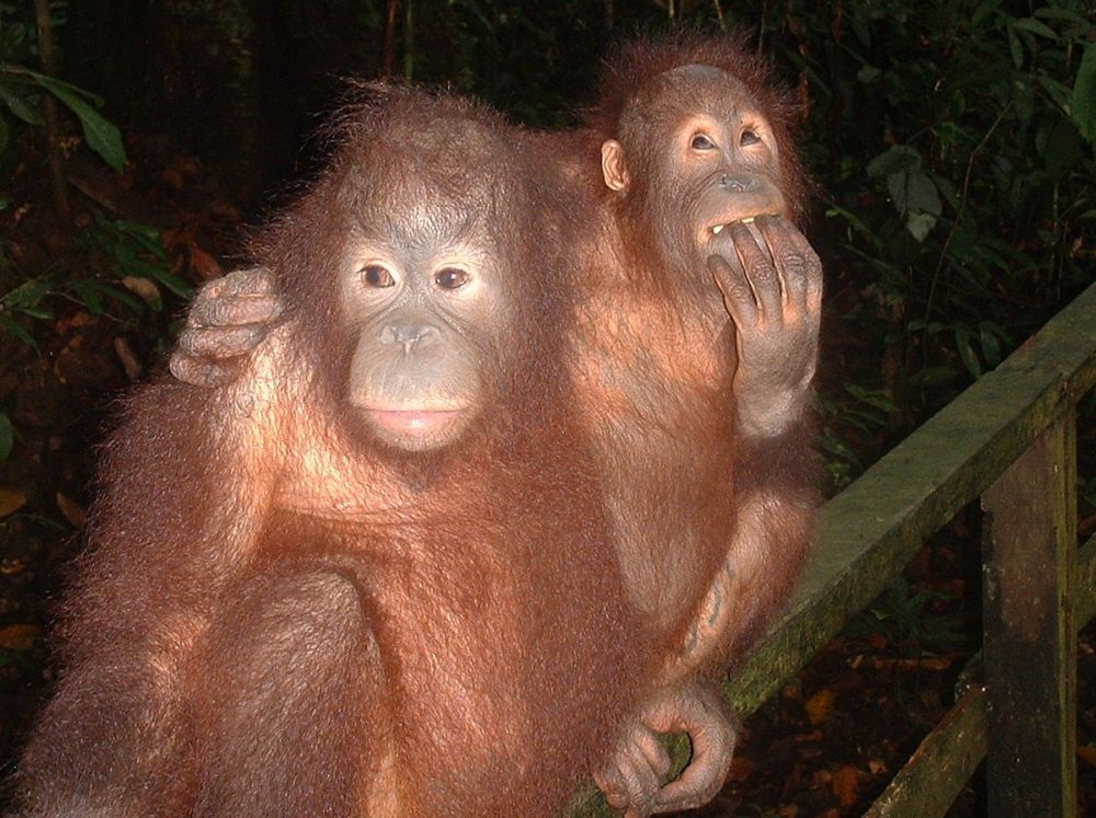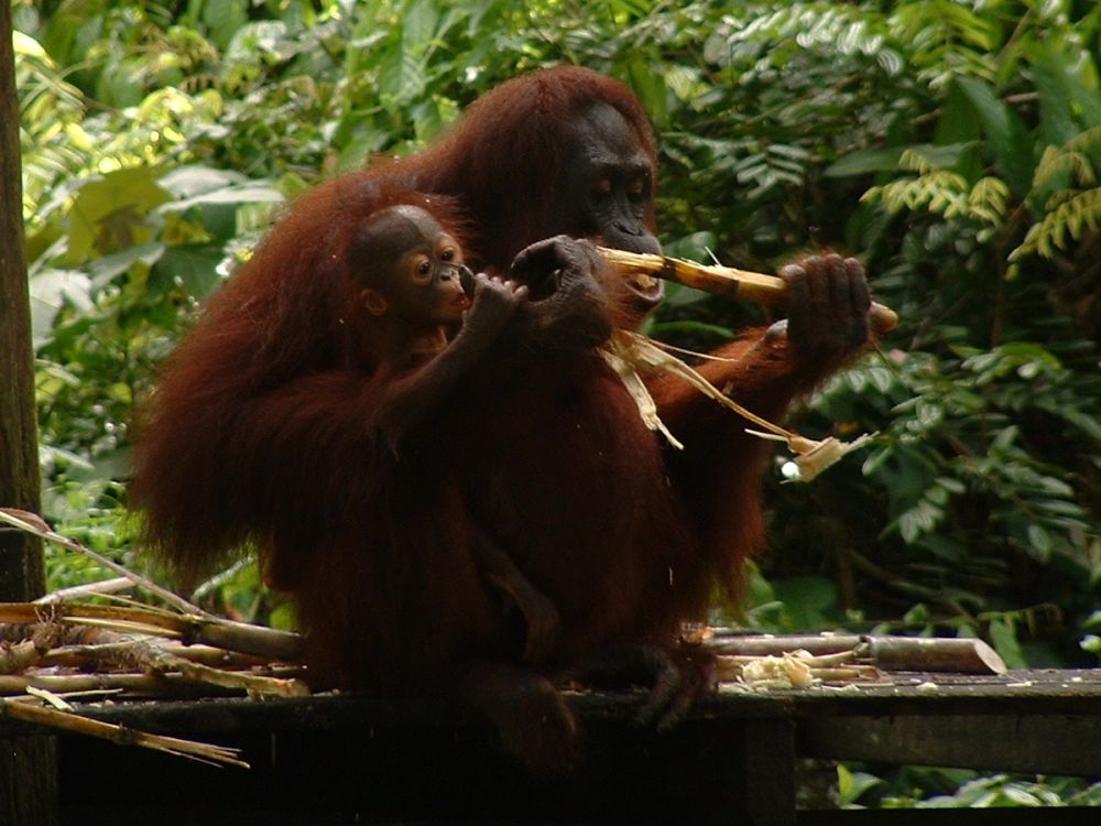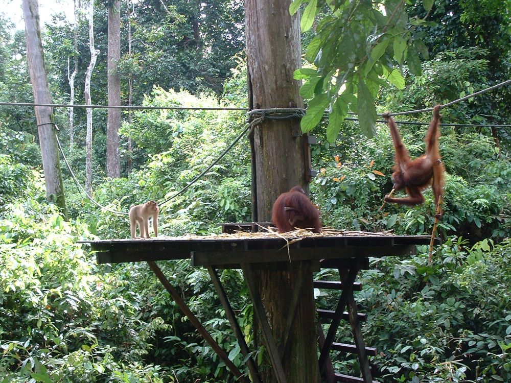 Formålet med stedet er at lære orangutangerne at klare sig selv i naturen. Orangutangerne er ikke i fangeskab – de kan bevæge sig så langt væk/ind i regnskoven som de vil, men hver dag ligger de frugter ud til dem, så de aber der ikke har været i stand til at finde mad selv, kan kommer tilbage for at spise der. For ikke undgå at de altid kommer tilbage, er det altid de samme slags frugter der bliver lagt ud, dermed prøver de at gøre det knap så attraktivt for orangutangerne. Derude så vi 2 små orangutanger der tilsyneladende lige var sluppet ud, for de følte sig vist mest trygge hos dyrepasseren… sødt! Vi så desuden et par andre orangutanger der lagde vejen forbi, samt nogle marakatte der også havde lært hvor der var ”gratis” mad et hente.