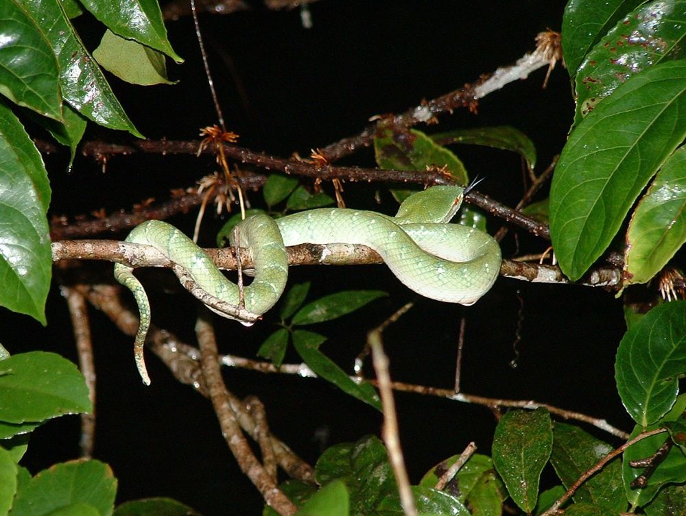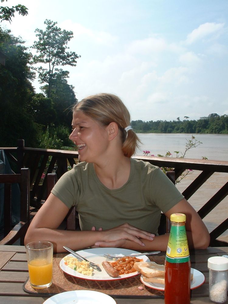 Da vi flyttede fra den ene til den anden hytte, fulgte der en ”privat vagthund” med. På samme på trappen op til vores hytte lå Olfert ofte. Olfert var en lille men meget farvestrålende slange som lå og solede sig foran hytten når vi kom hjem. Da vi så den sidste dag skulle op for at hente vores bagage, snakkede vi om at vi lige skulle nå at sige farvel til Olfert.. Vi blev temmelig forskrækket da vi kom op til trappen og så at Olfert var væk, og istedet lå en anden slange – magen til den farlige giftslange vores guide tidligere havde vist os i Sukau.. Shit tænkte vi – den der skal vi ikke lege med.. Men den blev bare liggende da vi forsigtigt nærmede os.. En lokal kom forbi, og inden han nåede at forstå hvad vi prøvede at advare ham imod, var han vadet lige forbi den! OK, hvis han kan, så kan vi også, så jeg måtte lege modig mand og træde henover slangen.. Det lykkedes og det lykkedes næsten også Tina at gå forsigtigt forbi.. Da vi skulle ned igen var den væk, så vi nåede aldrig at sige farvel til den eller Olfert.