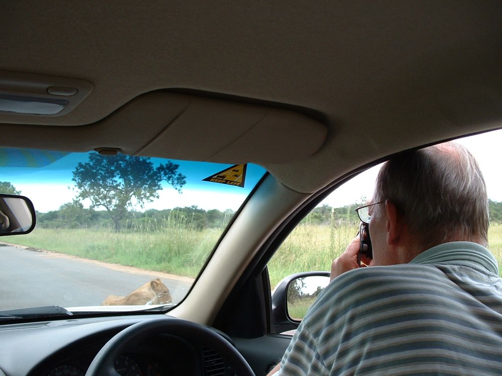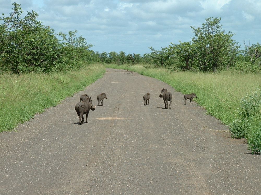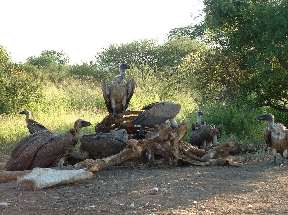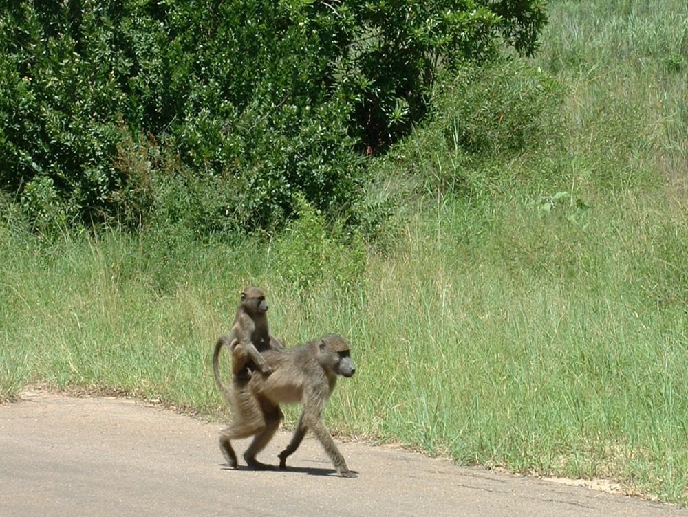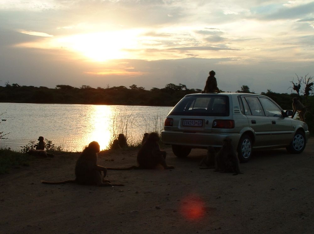 Morgenmad på en ‘resteplads’ i parken – det er ikke altid man når morgenmad når man skal være på farten kl. 6:00 for at spotte dyrene inden det bliver for varmtEn næsehornsfugl – ses også på mange campingpladser på jagt efter madrester.Impalaer er nok det dyr man ser flest af på en dag i Krüger – men de er nu flotte.Øhh hvis vi nu bare holder helt stille, er du så ikke sød at gå udenom?Nyder endnu en fantastisk solnedgang – til lyden af flodhestenes prusten! Her vælges bakke-løsningen i stedet.. Men meget godt billede af størrelseforholdet.Gribbene holder frokost på resterne af det der engang var en giraf!Solnedgang sammen med de lokale bavianer..