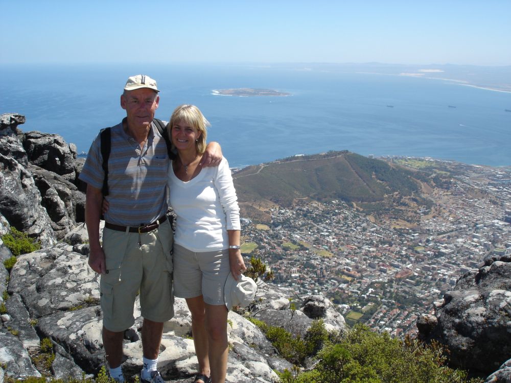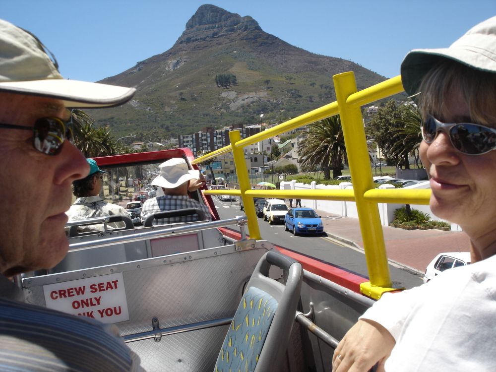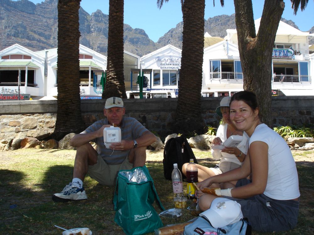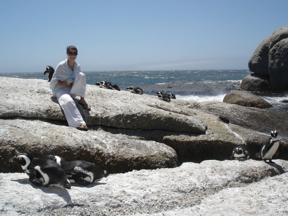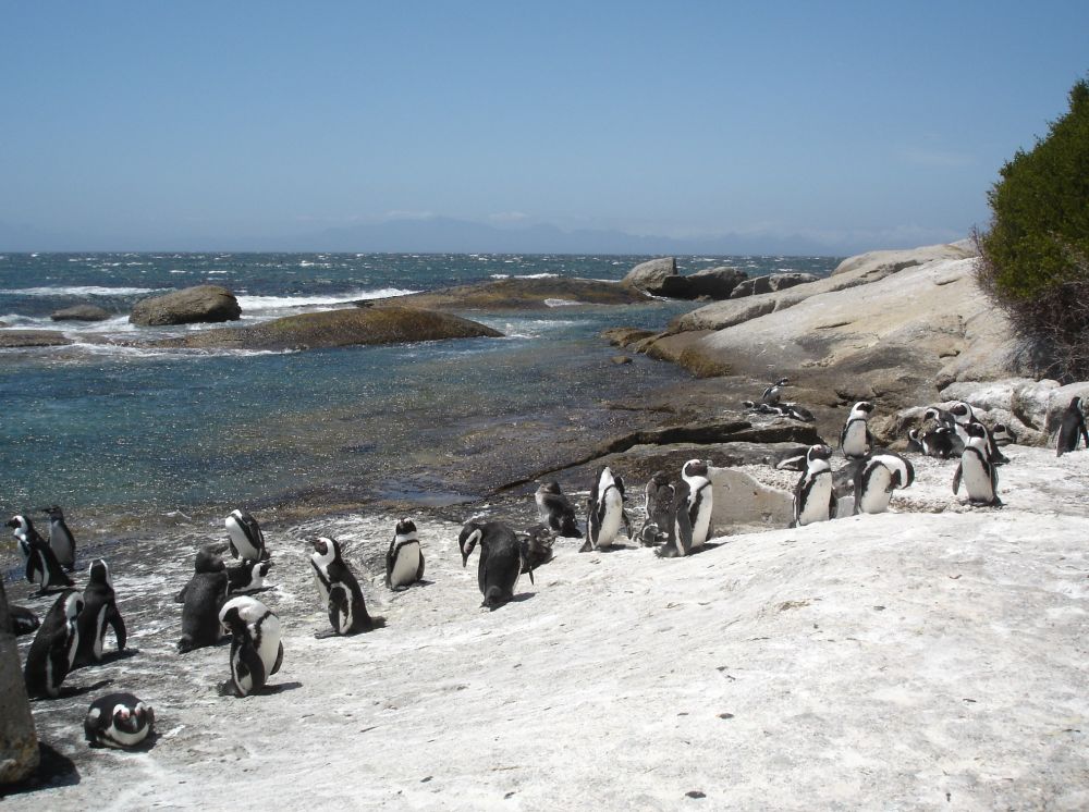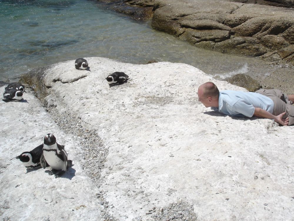 Vi startede rejsen i Cape Town.Her ved det såkaldte Waterfront, med Table Mountain i baggrunden.Vi valgte denne gang at tage kabelbanen op til toppen..Fra toppen af Table Mountain. I baggrunden ses Robben Island hvor Nelson Mandela sad fængslet fra 1964-1982. En af de lokale nyder også udsigten! Min far og Lise nyder byrundturen fra toppen af bussen.Picnic på en af Cape Towns nærliggende strande.Ikke det værste sted at tilbringe sådan en februar-dag..Er der noget Sydafrika (også) kan, så er det god mad og vin til yderst rimelige penge..Vi tog en dagsudflugt til bl.a. Boulders Beach små 40 km syd for Cape Town.Den smukke strand er det sted i verden, hvor du kan komme tæt på de små afrikanske pingviner. Brillepingvinerne lever langs Sydafrikas vestkyst og på mindre afrikanske øer. Det er den eneste pingvinart der yngler i Afrika.Er gået i pingvin-stilling.. ellers var jeg aldrig kommet så tæt på… (ps. det er mig længst til højre).