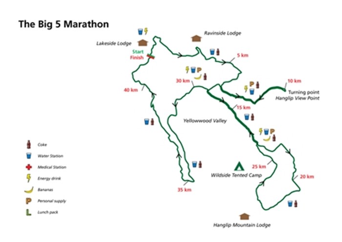 The Big Five Marathon foregår på savannen i det private Entabeni vildtreservat i Sydafrika. Navnet The Big Five hentyder til “de 5 store” dyr på savannen: elefant, næsehorn, bøffel, løve og leopard. Intet hegn, ingen flod, intet der adskiller løberne fra savannens dyr.