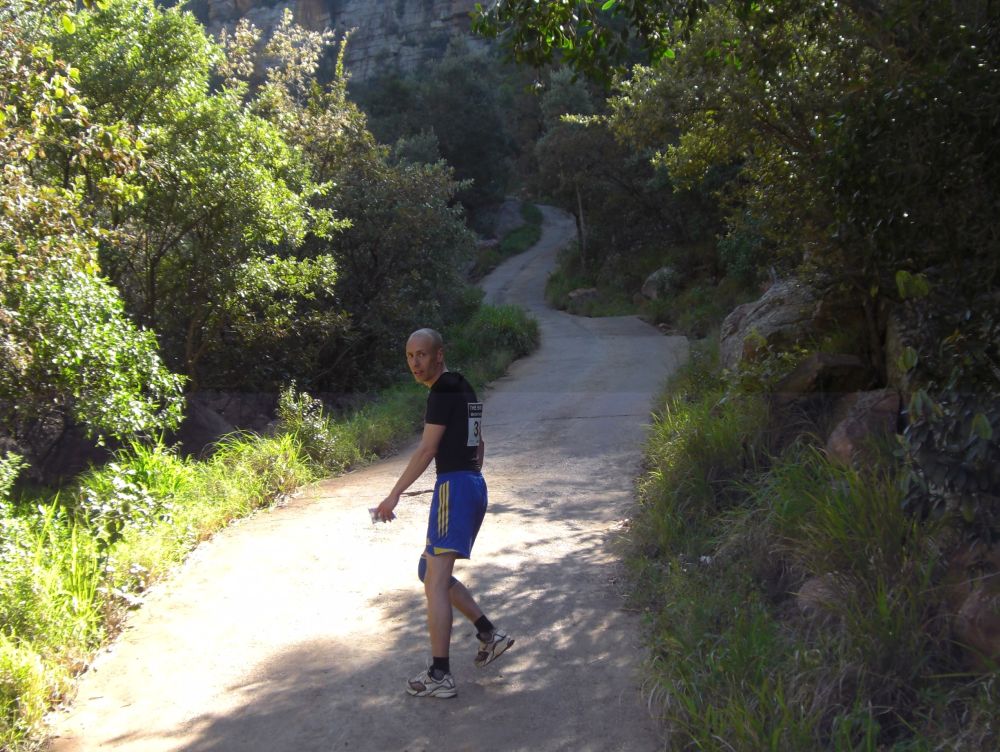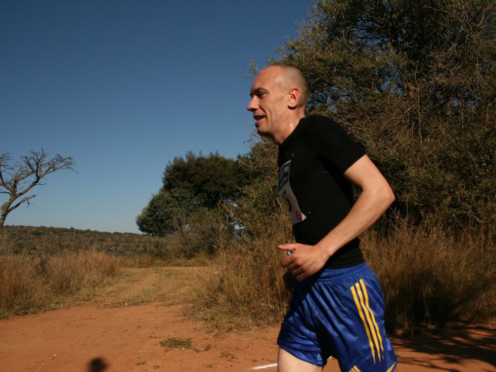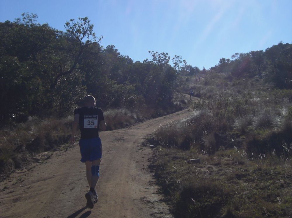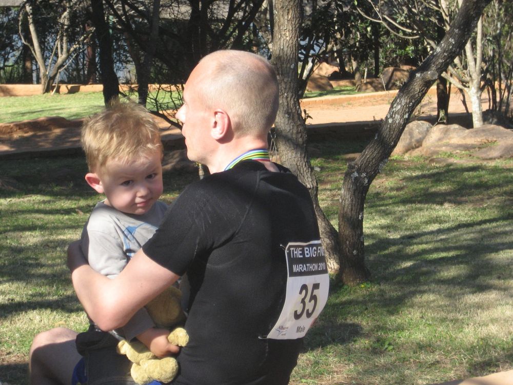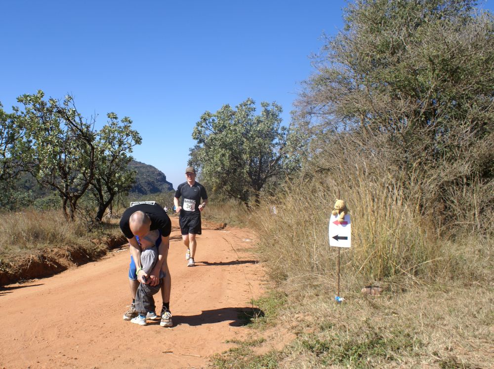 Morgenen inden løbsstart. Lisbeth skal løbe sin første 10 km og Lasse og jeg skal løbe vores første marathon! Klar til start med 68 andre løbere på marathondistancen (+70 løbere på halvmarathon og 21 på 10km).De fleste deltagere kom fra Sydafrika og Danmark, men der var løbere fra hele verden – USA, Canada, Australien, Tjekket, Sverige mm.Selve ruten! Der var jeeps stationeret hele vejen langs ruten, og for hver 4 km var der mulighed for at få vand mm. En kurve over løbets “Elavation”. På de første 10 km gik det jævnt op ad hele vejen! Heldigvis fulgte 8 km ned ad bakke, inden man nåede den frygtede Yellowwood Gorge…Starten er gået og vi lagde ud i et stille tempo som ikke voldte os de store problemer – trods det faktum at de første 10 km var op ad bakke!! Vi startede kl. 8 om morgenen og temperaturen var behagelig. (juni er jo vinter i Sydafrika).Lasse, efter at vi har rundet 10km mærket og det begynder at gå ned ad. Det stenede underlag var heller ikke med til at gøre løbet lettere..Her efter ca. 18 km var jeg stadig flyvende og løbslægen kommer med opmuntrende tilråb.Kort inden vi rammer den frygtede Yellowwood Gorge.Lasse kigger ned af bakken hvor løberne på halvmarathon kommer gående op. I baggrunden kan man skimte den sø som vi skal ned og runde – og op igen! Slugten er så stejl at man heller ikke kan løbe ned af den! Temmelig hårde 3 km for lår-mullerne at gå/lunte ned ad omkring midtvejs i løbet.Nede på det nedre plateau hvor rutens hårdeste strækning ventede – 6 km i SAND! Da man allerede havde løbet 20 km og varmen så småt havde meldt sin ankomst, sp var disse 6 km for mig rutens hårdeste strækning.Efter 26 km gik turen de 3 km op ad slugten. På 3 km stiger man 700 højdemeter hvilket svarer til en gennemsnitlig stigningspocent på ca. 23,3% !!! (Til sammenligning har Col du Tourmalet, kendt fra Tour de France en gennemsnitlig stigningsprocent på 7,4% – stejlest 10,2!)Mens vi kæmpede os op ad Yellowwood legede Ebbe-Emil i det høje græs! Ebbe-Emil kigger efter sin far!Endelig! Vi var 40 minutter om at gå de 3 km op ad Yellowwood. Den første kilometer alene, var vi mere end 16 minutter om.Tid til en krammer inden turens sidste 12 km på det øvre plateau ventede..De sidste 12 km på det øvre plateau var hårde. Klokken var blevet omkring 12, og solen bagte ned i hovederne på os – ingen skygge overhovedet!Efter ca. 34 km skiltes Lasse og jeg. Lasse frygtede at han måtte gå resten og vejen og da jeg stadig havde nogle kilometer i benene, besluttede vi at jeg bare skulle løbe videre. Befriende skilt – 1 km til målet. Havde kun én seriøs krise da jeg 6 km før mål var løbet tør for vand. Jeg havde 2 km hen til næste og vandpost – de længste 2 km nogensinde. Kommer i mål til lyden af We Are The Champions som jeg hørte via min lille medbragte mp3 spiller..!Medalje og håndtryk fra DAFs (Dansk Atletik Forbund) repræsentant som sørgede for at alt foregik efter reglerne. Lasse kommer i mål ca. 10 minutter senere. Han endte med kun at gå 2 km efter vi skiltes og løb så resten af vejen.Godt gået min ven – og tak for kampen! Det var sgu en fantastisk oplevelse som vi altid vil kunne dele.