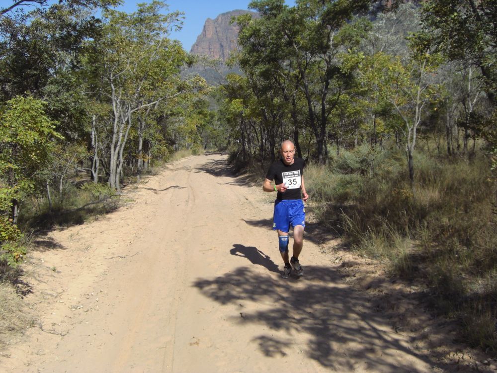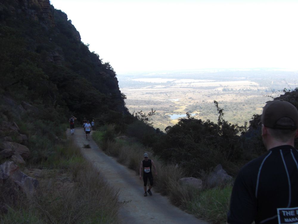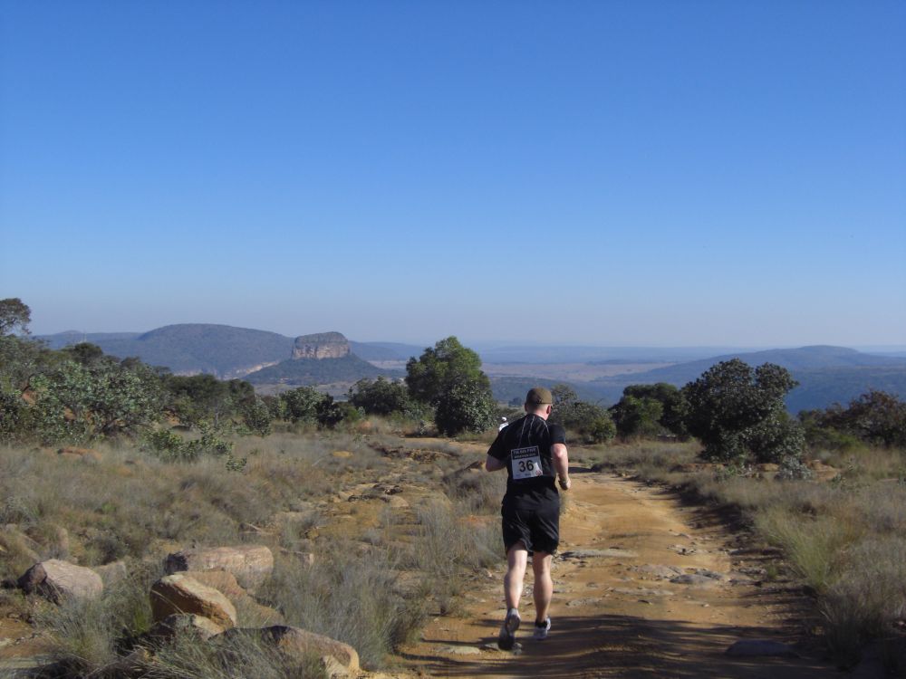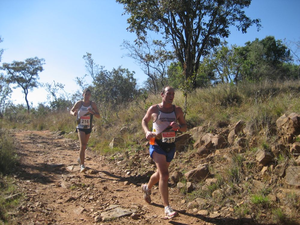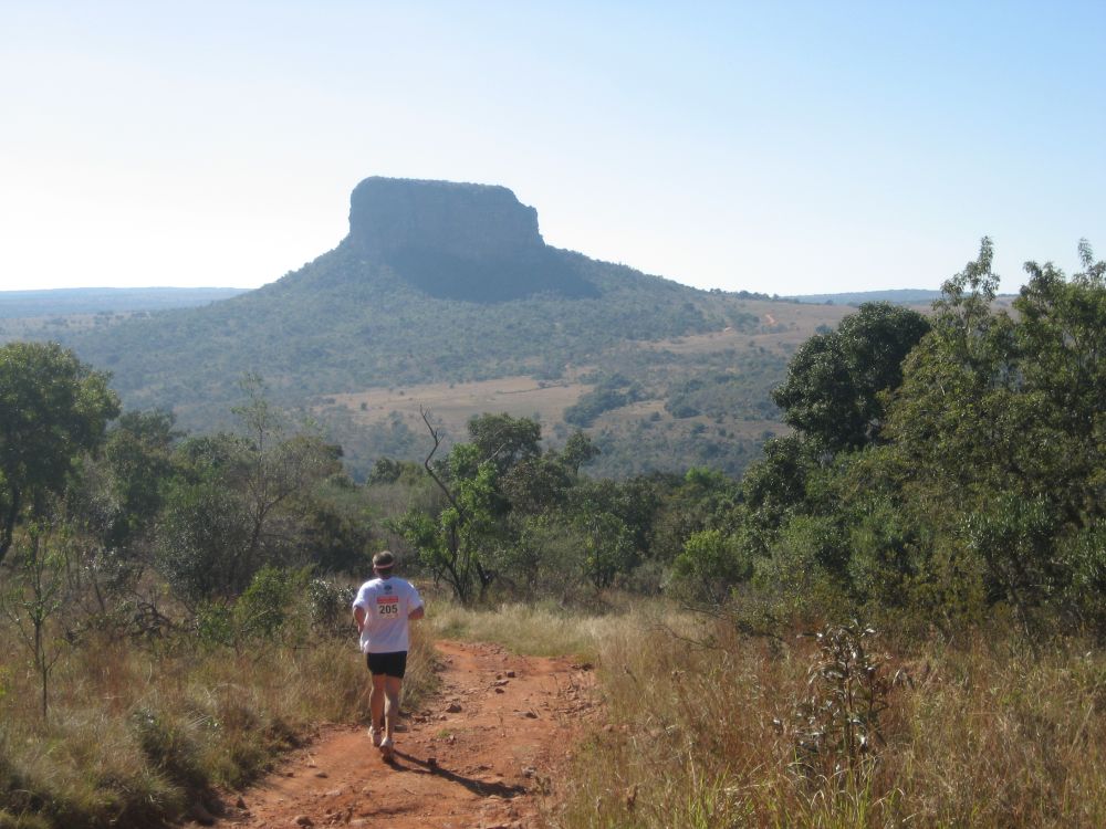 Morgenen inden løbsstart. Lisbeth skal løbe sin første 10 km og Lasse og jeg skal løbe vores første marathon! Klar til start med 68 andre løbere på marathondistancen (+70 løbere på halvmarathon og 21 på 10km).De fleste deltagere kom fra Sydafrika og Danmark, men der var løbere fra hele verden – USA, Canada, Australien, Tjekket, Sverige mm.Selve ruten! Der var jeeps stationeret hele vejen langs ruten, og for hver 4 km var der mulighed for at få vand mm. En kurve over løbets “Elavation”. På de første 10 km gik det jævnt op ad hele vejen! Heldigvis fulgte 8 km ned ad bakke, inden man nåede den frygtede Yellowwood Gorge…Starten er gået og vi lagde ud i et stille tempo som ikke voldte os de store problemer – trods det faktum at de første 10 km var op ad bakke!! Vi startede kl. 8 om morgenen og temperaturen var behagelig. (juni er jo vinter i Sydafrika).Lasse, efter at vi har rundet 10km mærket og det begynder at gå ned ad. Det stenede underlag var heller ikke med til at gøre løbet lettere..Her efter ca. 18 km var jeg stadig flyvende og løbslægen kommer med opmuntrende tilråb.Kort inden vi rammer den frygtede Yellowwood Gorge.Lasse kigger ned af bakken hvor løberne på halvmarathon kommer gående op. I baggrunden kan man skimte den sø som vi skal ned og runde – og op igen! Slugten er så stejl at man heller ikke kan løbe ned af den! Temmelig hårde 3 km for lår-mullerne at gå/lunte ned ad omkring midtvejs i løbet.Nede på det nedre plateau hvor rutens hårdeste strækning ventede – 6 km i SAND! Da man allerede havde løbet 20 km og varmen så småt havde meldt sin ankomst, sp var disse 6 km for mig rutens hårdeste strækning.Efter 26 km gik turen de 3 km op ad slugten. På 3 km stiger man 700 højdemeter hvilket svarer til en gennemsnitlig stigningspocent på ca. 23,3% !!! (Til sammenligning har Col du Tourmalet, kendt fra Tour de France en gennemsnitlig stigningsprocent på 7,4% – stejlest 10,2!)Mens vi kæmpede os op ad Yellowwood legede Ebbe-Emil i det høje græs! Ebbe-Emil kigger efter sin far!Endelig! Vi var 40 minutter om at gå de 3 km op ad Yellowwood. Den første kilometer alene, var vi mere end 16 minutter om.Tid til en krammer inden turens sidste 12 km på det øvre plateau ventede..De sidste 12 km på det øvre plateau var hårde. Klokken var blevet omkring 12, og solen bagte ned i hovederne på os – ingen skygge overhovedet!Efter ca. 34 km skiltes Lasse og jeg. Lasse frygtede at han måtte gå resten og vejen og da jeg stadig havde nogle kilometer i benene, besluttede vi at jeg bare skulle løbe videre. Befriende skilt – 1 km til målet. Havde kun én seriøs krise da jeg 6 km før mål var løbet tør for vand. Jeg havde 2 km hen til næste og vandpost – de længste 2 km nogensinde. Kommer i mål til lyden af We Are The Champions som jeg hørte via min lille medbragte mp3 spiller..!Medalje og håndtryk fra DAFs (Dansk Atletik Forbund) repræsentant som sørgede for at alt foregik efter reglerne. Lasse kommer i mål ca. 10 minutter senere. Han endte med kun at gå 2 km efter vi skiltes og løb så resten af vejen.Godt gået min ven – og tak for kampen! Det var sgu en fantastisk oplevelse som vi altid vil kunne dele.