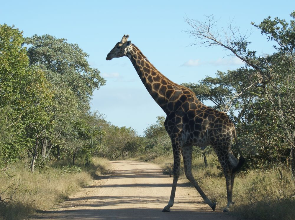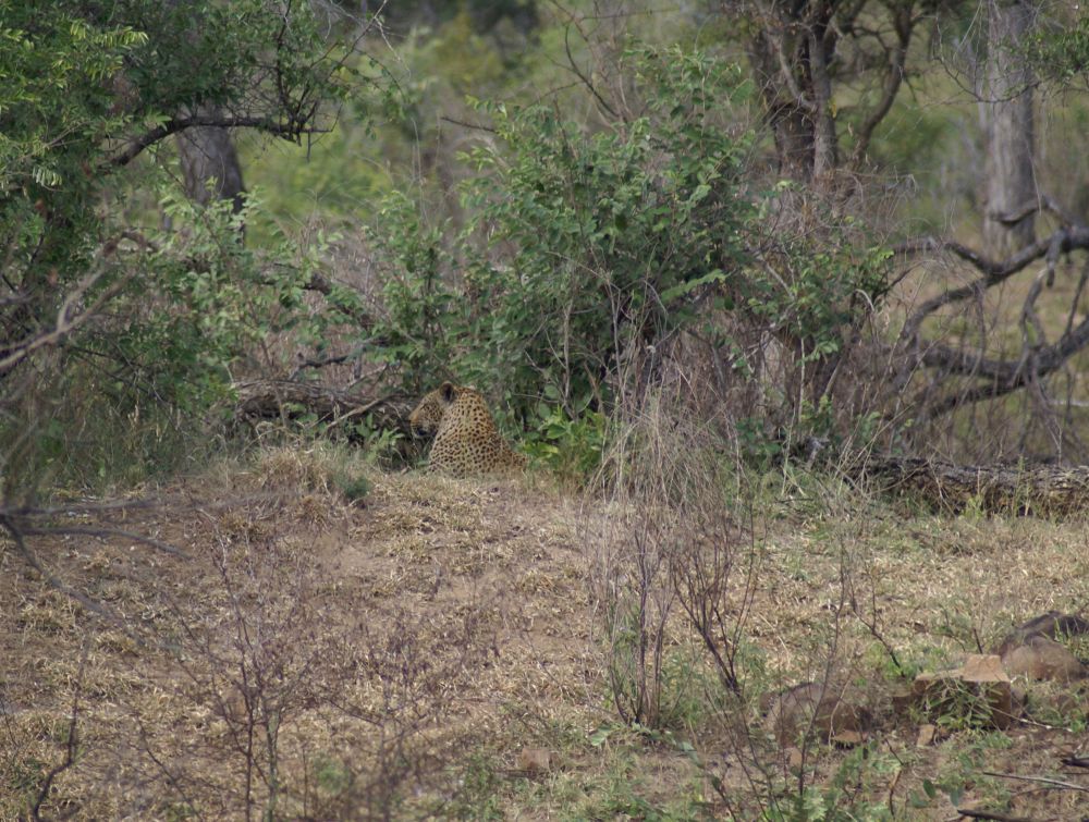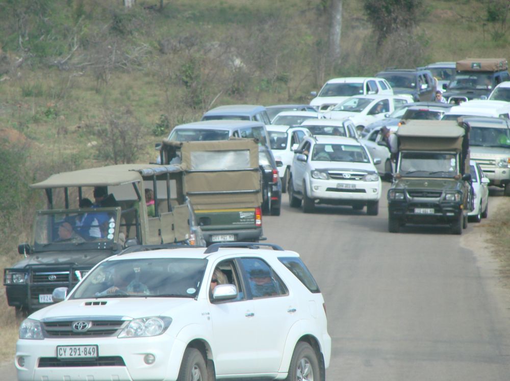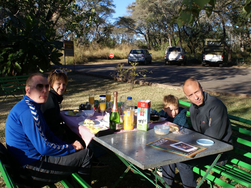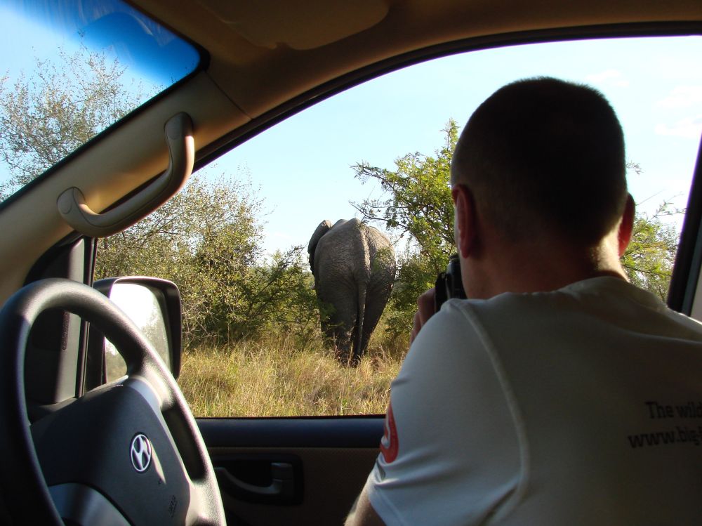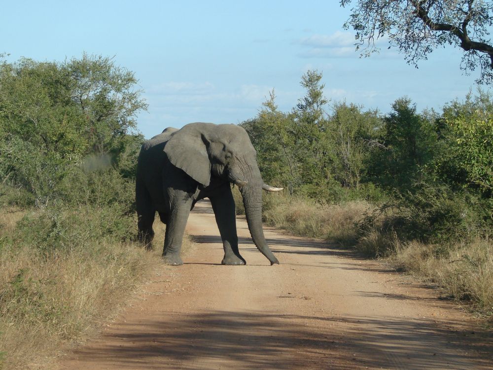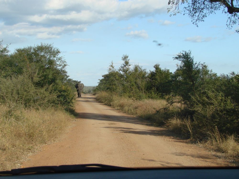 Ebbe-Emil klar til oplevelser i Krüger National Park.Vores værtsdame havde pakket en lækker morgenmad som vi nød ved indgangen.Så lykkdes det endeligt at se en leopard! (2 for at være mere præcis).Historien til episoden med leoparderne var at vi kom kørende i bilen og pludselig holder en masse biler stille lidt længere fremme. Så ved man at der er noget “ud over det sædvanlige”, så vi skynder os derher og kan skimte 2 dyr ude i bush´en. Vi er alle sammen enige om at det er 2 hunløver der går derinde. Pludselig træder de frem i en lysning og vi råber nærmest i kor: De har pletter – det er ikke løver. DET SGU 2 LEOPARDER.. og så var vi for alvor helt oppe og ringe..Og sådan efterlader 2 leoparder trafikken i Krüger…En stor flot giraf træder ud lige foran vores bil. Det er den fedeste oplevelse, når dyrene bare sådan dukker op ud af ingenting.Senere på eftermiddagen udfordre denne elefant os til at lege “chicken”!?Vi måtte lige bakke nogle meter inden elefanten valgte at forlade vejen og gå ud i busken.Alting har en ende – og en elefant har en stor en..