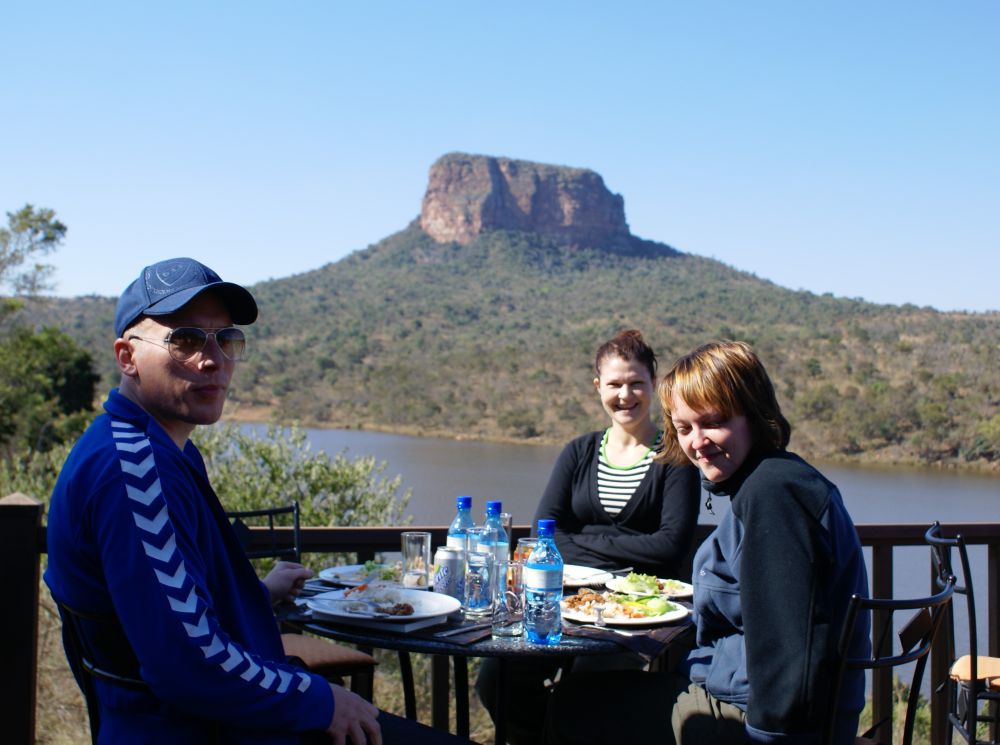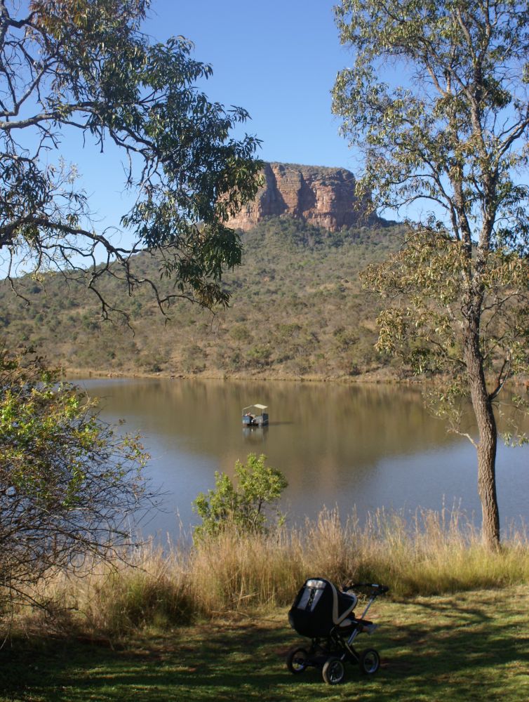Nyder en frokost på vores lodge i Entabeni, med skøn udsigt ud over søen.Fantastisk naturscener. Her fra en morning drive i det nedre plateau. Senere samme dag. “Bakken/kløften” i baggrunden skulle jeg senere lære godt at kende, da man på marathon-ruten både skulle ned og op ad den….Næsehorn med sin unge. En flok giraffer slentrer hen over savannen. Lisbeth i en close encounter med et andet næsehorn (altså end det der var billede af før!).Ebbe-Emil får sig lige en middagslur i sin klapvogn foran vores hytteEntabeni Lake Side, vores hjem i 6 dage før, under og efter marathonløbet – her set fra søsiden.To høfflæste (Ebbe-Emils ord for Flodhest) som kigger op. En eftermiddag mens Ebbe-Emil blev passet tog vi på en game walk. Af dyr så vi dog kun en kuduEn af dagene fik vi lavet en privat safaritur hvor Ebbe-Emil kunne komme med! Der var fokus på planteædere og dyr der vejer under 1 ton. Alle andre dyr undgik vi. De andre dage var Tina og jeg skiftesvis blevet hjemme med ham mens den andet tog på safari. Så det var rat at være sammen – og med ham!