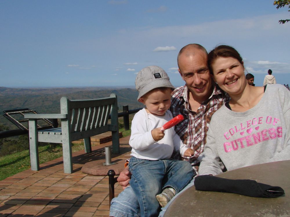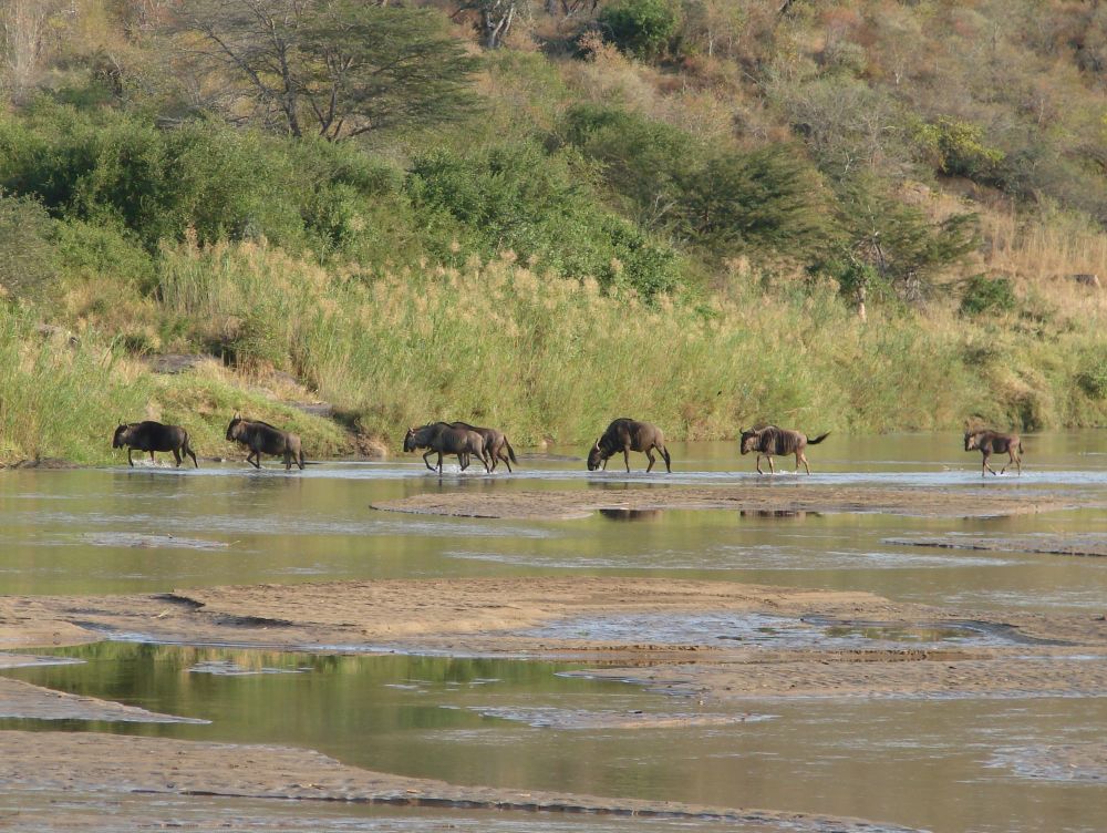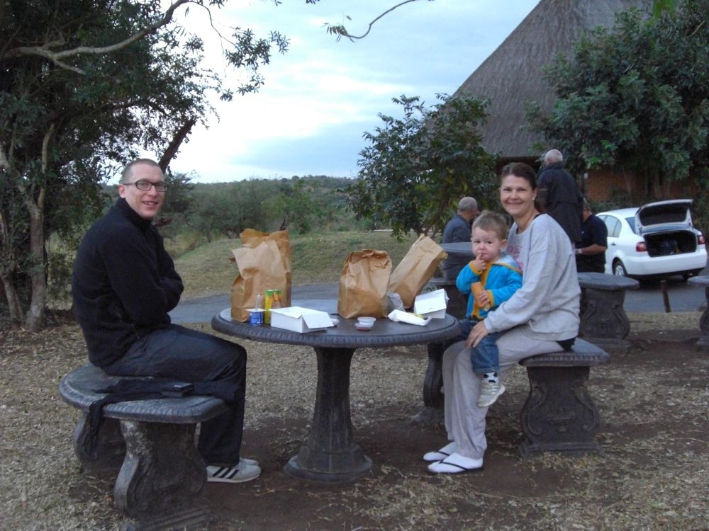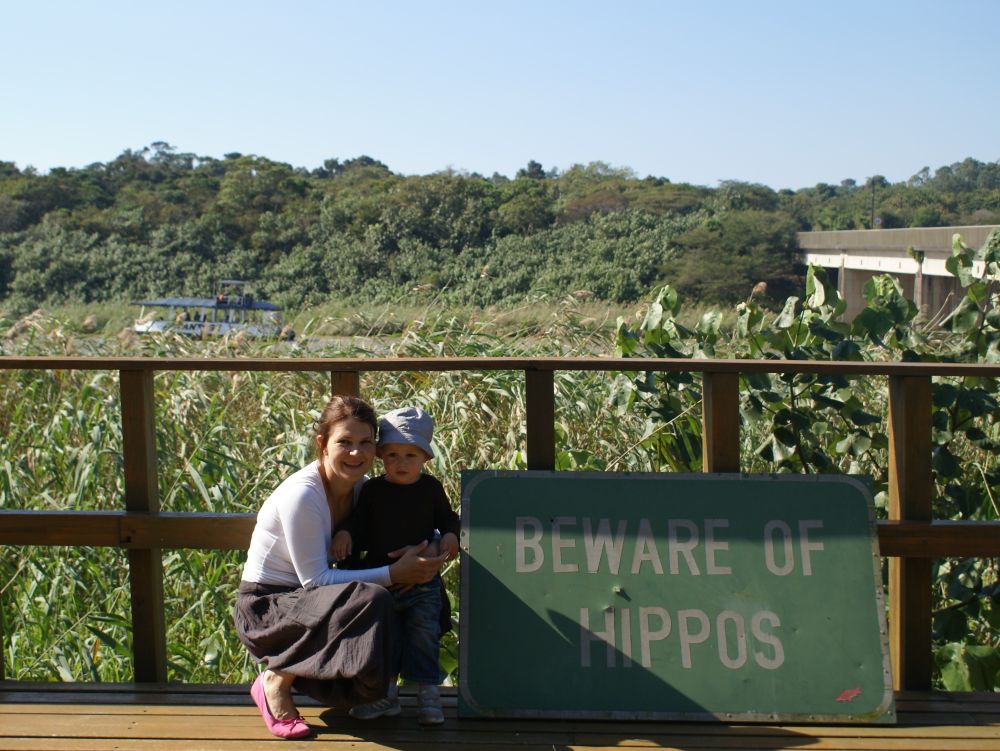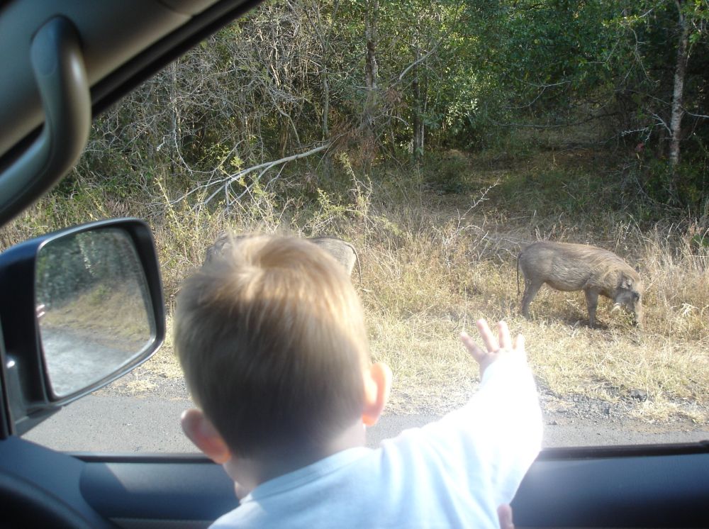 Vi drog tidligt afsted og spiste vores medbragte morgenmad ved indgangen til parken.En flok gnuer krydser floden!Der findes flere steder man kan overnatte i selve parken. Vi nøjedes dog med at lave en dagsudflugt ud af det. Her nyder vi den fantastiske udsigt (og en is) på parkens eneste spisested.Hluhluwe-Imfolozi er kendt for deres næsehorn som de (næsten) alene bærer æren for stadig eksisterer!! I 1950 var parken startskuddet for “Operation Rhino” for bevaringen af næsehornene som dengang var tæt på udryddelse. Takket være parkens arbejde med næsehorn findes der i dag ca. 10.000 næsehorn i Afrika. Det menes at da der var færrest næsehorn i Afrika lå tallet på blot 20!!! Ebbe-Emil vinker bye bye til Pumba og tak for endnu en oplevelsesrig tur til Hluhluwe-Imfolozi.