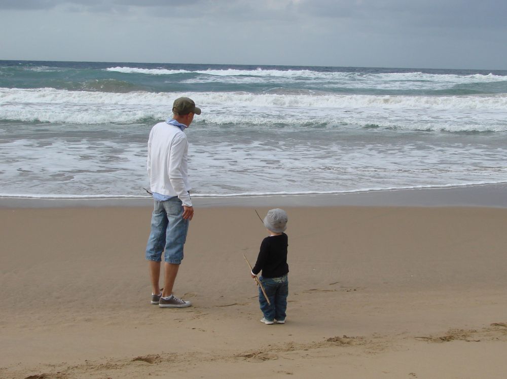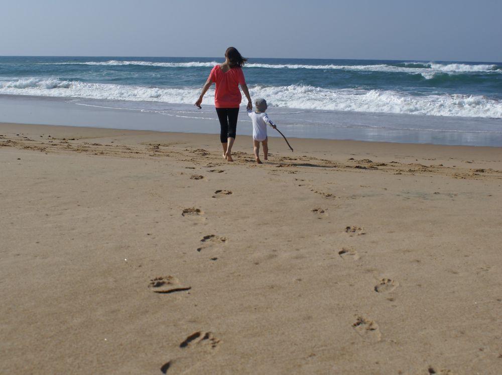 Med 25 grader og skyfri himmel var det jo oplagt at smutte forbi stranden igen, så det gjorde vi.Fodspor i sandet.Vi havde meget sjov med ikke at blive taget af bølgerne..