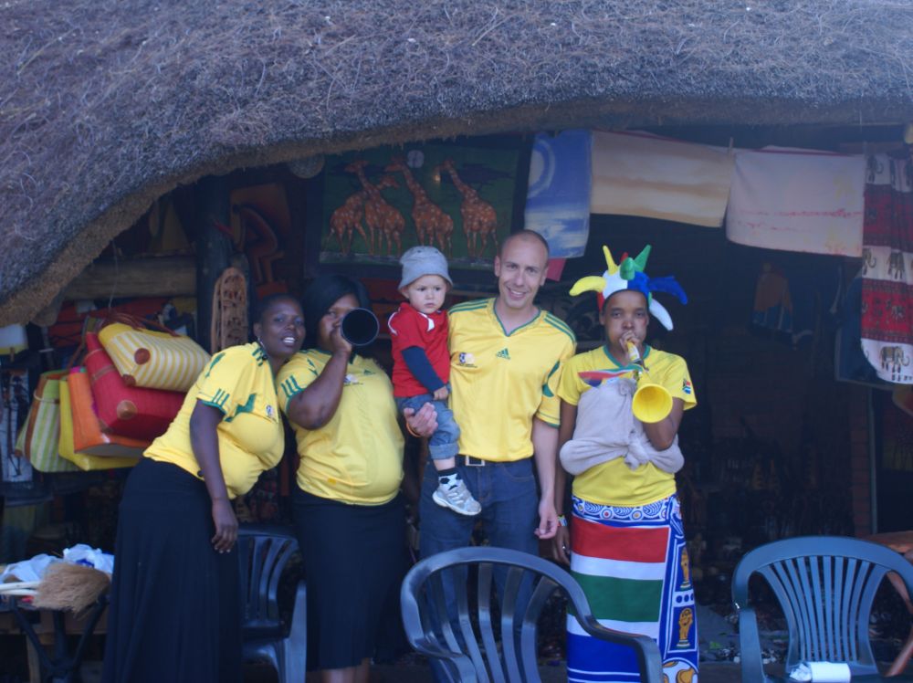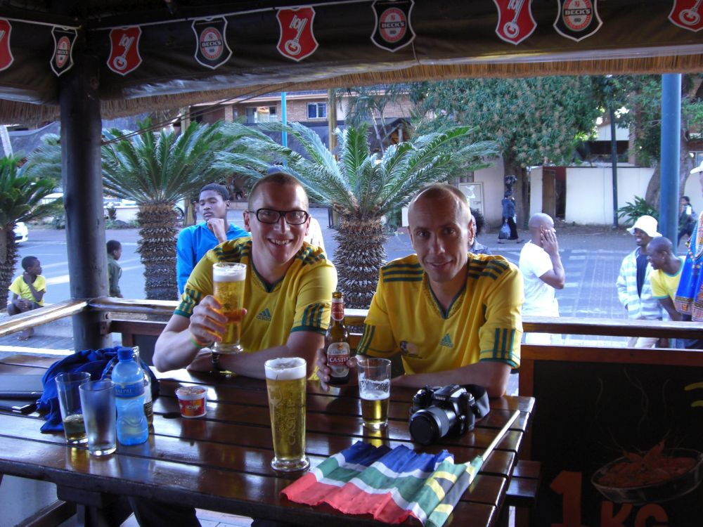 Ebbe-Emil og jeg på vej til fodbold i hver vores nationaldragt.Her kommer vi forbi det lokale marked hvor vi for første gang bliver præsenteret for Vuvuzelaen, som senere skabte en del debat.Klar til kamp med fodboldtrøje og Castle Beer! Inden på baren sad næsten kun udenlandske turister som os, men hele vejen rundt om baren var der fyldt med lokale, primært unge drenge, som ville se med over skulderen.