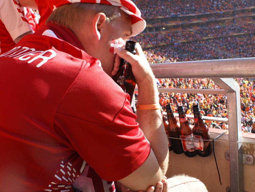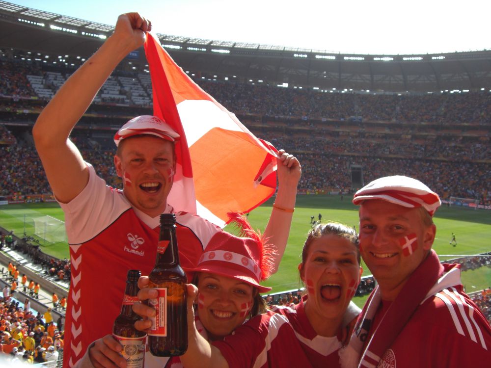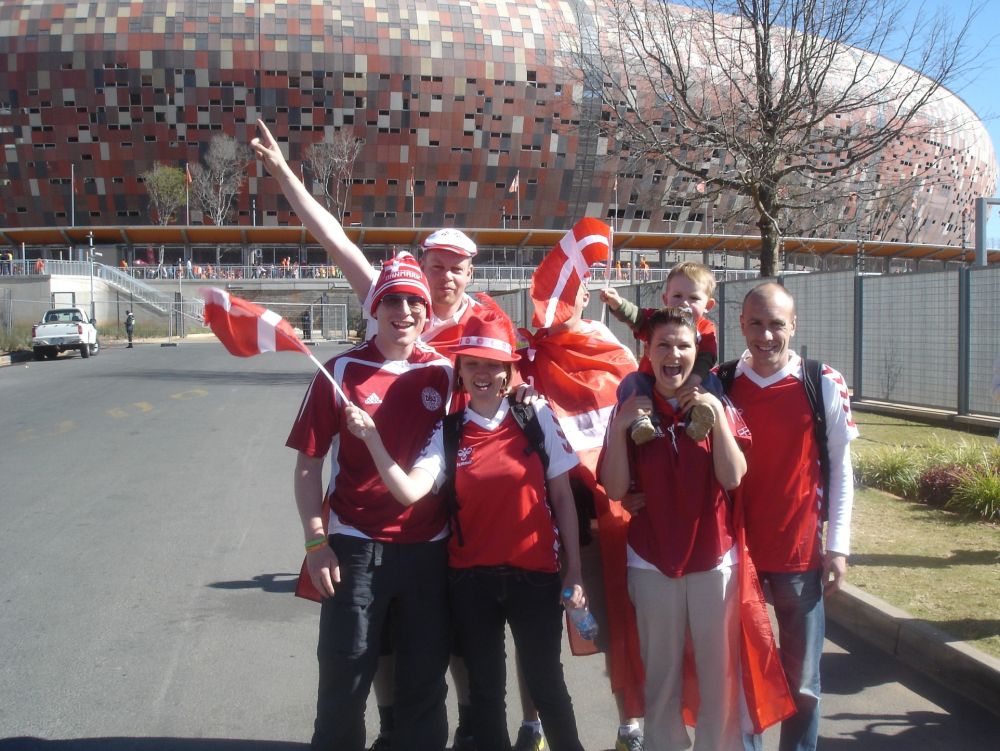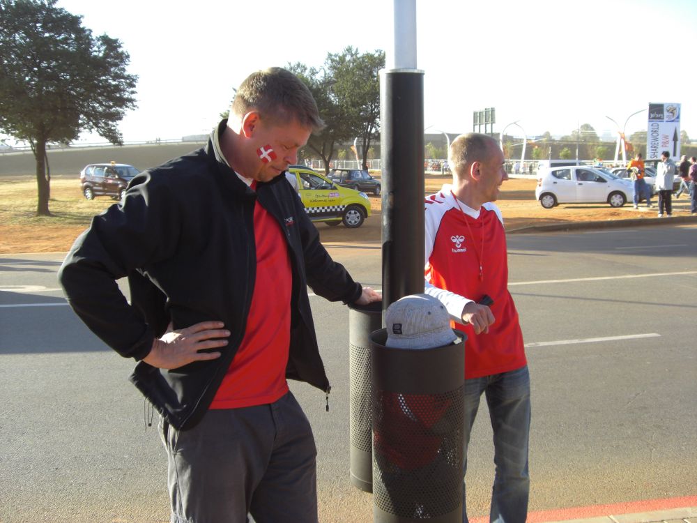 Vi havde valgt at bo i denne camp da det skulle være en decideret VM camp med festlige arrangementer, storskærm mm. Vi blev alle slemt skuffede. Sådan så campen ud ved ankomsten – ikke meget VM-fest og stemning over det!Lasse viser stolt vores knap så “heated-tents” frem.. Her kunne vi stadig grine af det, men efter én nat med frysegrader var der ikke meget sjov over det! Så vi upgradede os til en hytte som gjorde vi overlevede opholdet..!!Vores hold foran det spritnye Soccer City Stadium hvor Danmark skulle spille deres første kamp ved VM mod Holland. Det var iøvrigt også her VM-finalen senere skulle spilles.Danmarksflag males på ansigterne inden kampen!Min kollega Lars og Lisbeth før kampen. Af de mange stadions jeg efterhånden har set, er dette et de flotteste, mest gennem-tænkte og moderne stadion jeg har oplevet. Og med sol og 25 grader var alle ingredienserne der til en god oplevelse.Ebbe-Emil var i starten ikke helt tilfreds med 86.000 larmende tilskurer og vuvuzelaer. Men et par ørepropper og ikke mindst en is hjalp på det! Familien Toft-Olsen er ved at være kampklar…Nogle Budweisere senere var vi i hvert fald..De to hold kommer på banen – kampen sluttede 2-0 til Holland.Humøret fald nogle grader i takt med at øllene og de hollandske mål simultant blev flere og flere.Med 86.000 tilskurer der skal hjem fra fodbold kan det være svært at holde styr på en 2½-årig. Så vi smed ham ned i denne skraldespand – så vidste vi hvor han var!