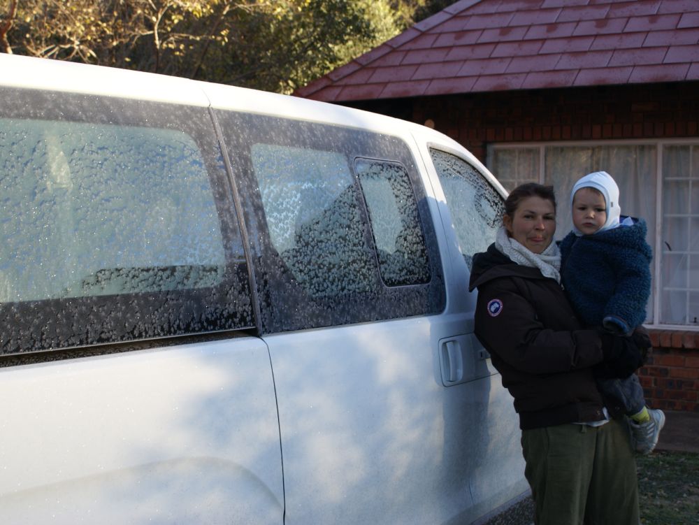 Tina og Ebbe-Emil om morgenen inden afgang. Vi havde en flaske vand liggende inde i bilen – der var is i flasken denne morgen da vi fandt den!!! Frostgrader rimer ikke på camping!!