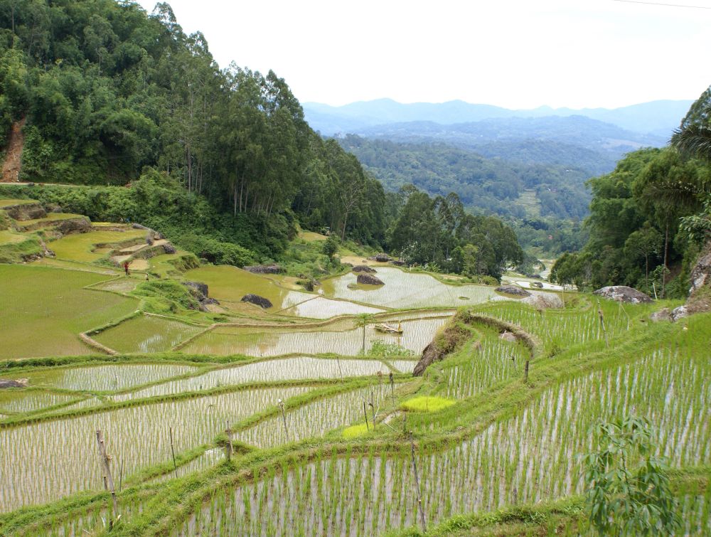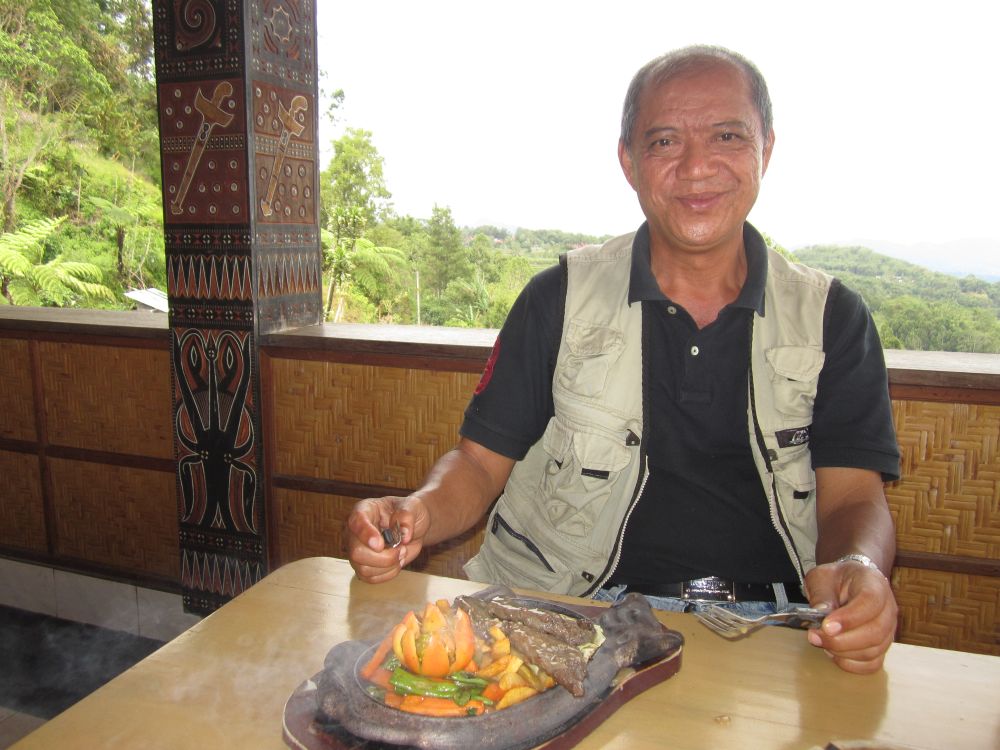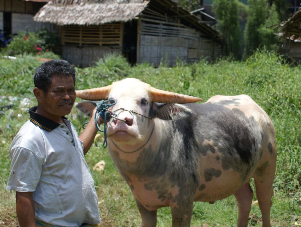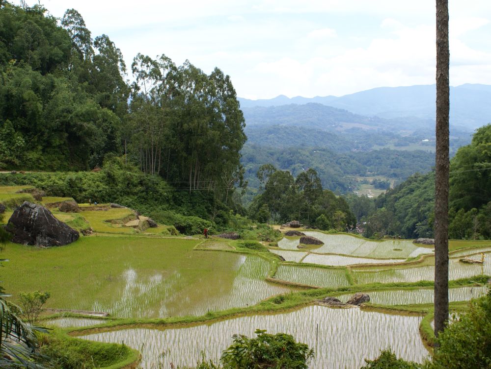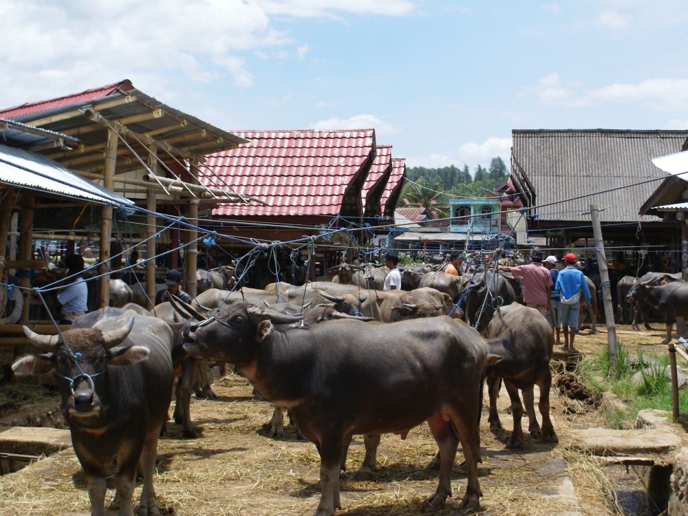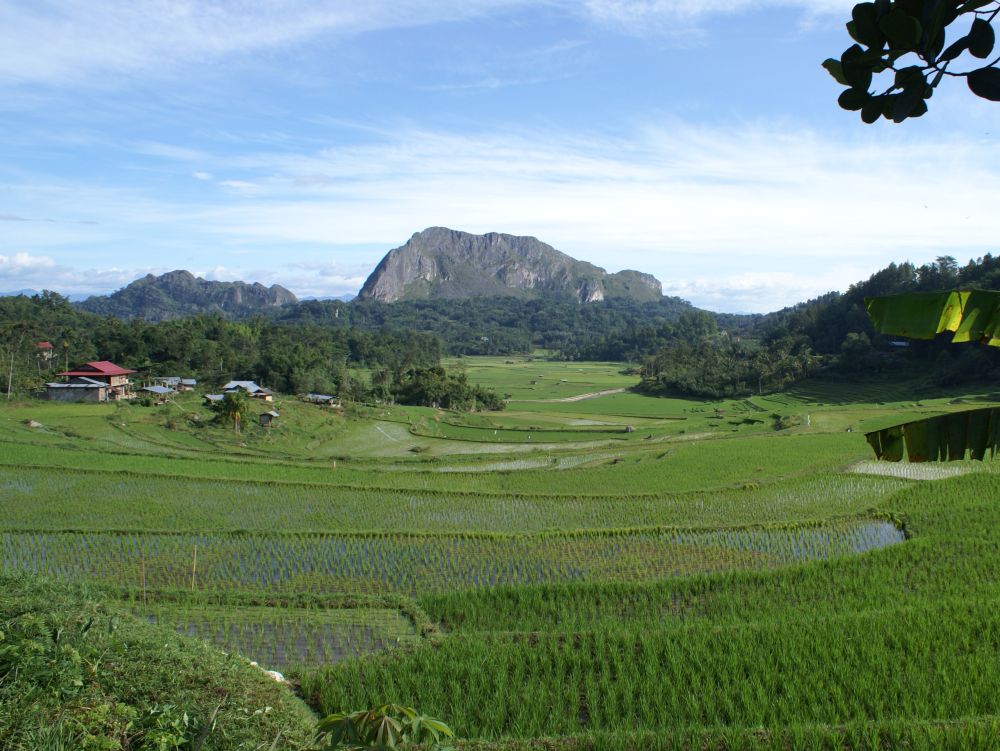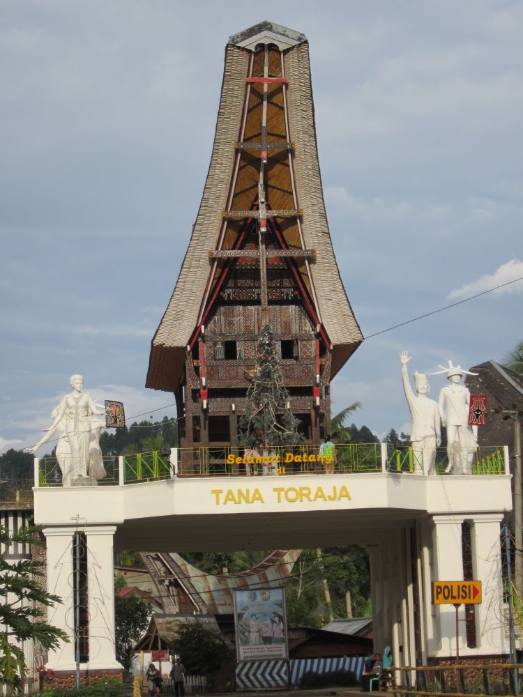 Børnene i vejkanten byder mig velkommen til Sulawesi og kaster disse håndtegn! Vi begiver os op i højlandet til Toraja-Land hvor “MaleMountain” rejser sig foran os!Kort efter gør vi kaffe-pause på denne vejside-café hvor vi har en flot udsigt til “Female Mountain”.. (navnene er ikke nogen jeg har fundet på!).Velkommen til Tana Toraja (Tana betyder Land på det lokale sprog!).Indkvarteringen behøver ikke fejle noget. Boede i disse fine bygninger i noget der minder om deres traditionelle byggestil i smukke smukke omgivelser.En bøffel som er en af Toraja-folkets mest værdifulde ejendomme. Jeg skulle snart opleve hvordan en del bøfler ender deres liv på disse kanter…Typisk landskabsbillede fra Toraja med grønne rismarker – 90% af folket lever af landbrug.