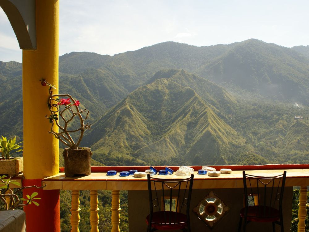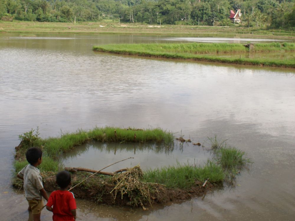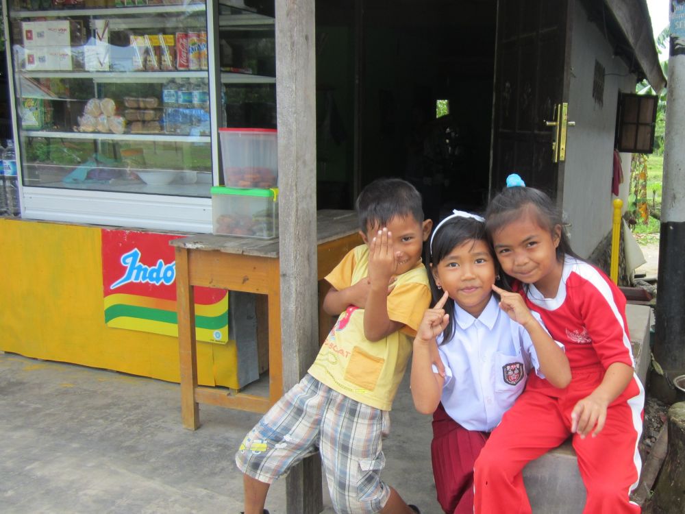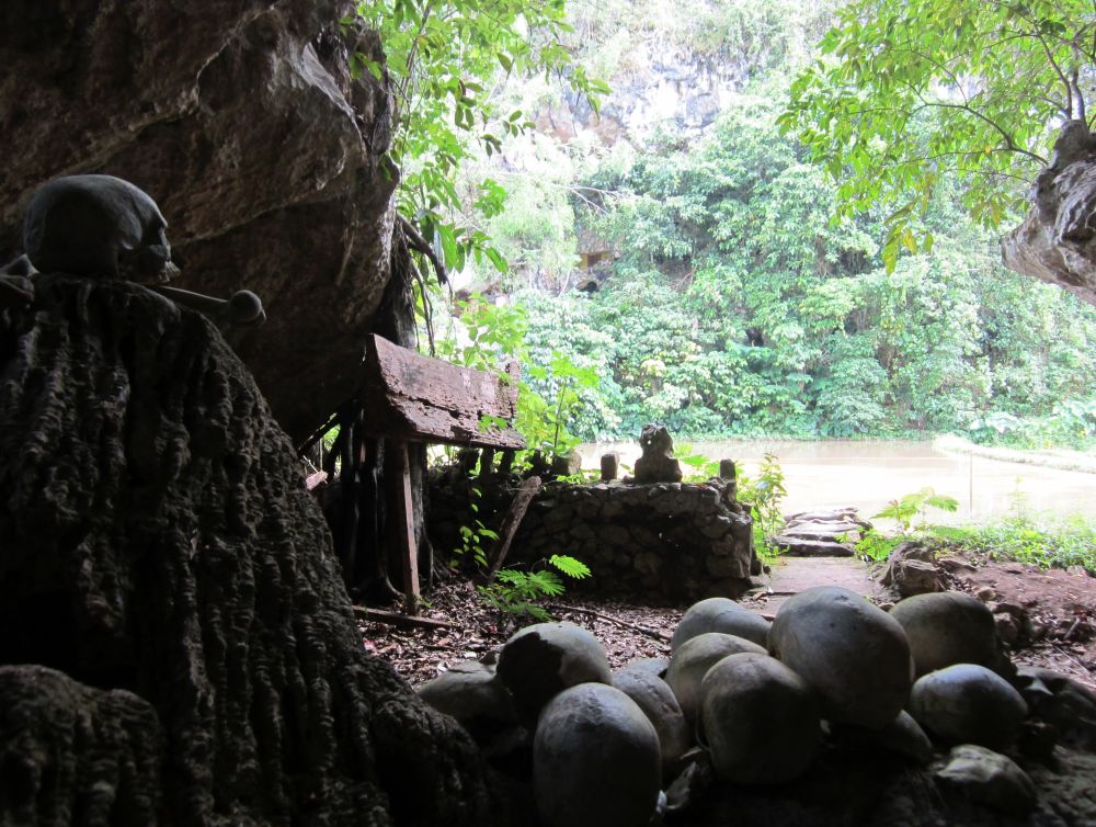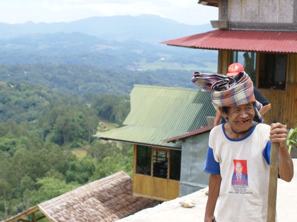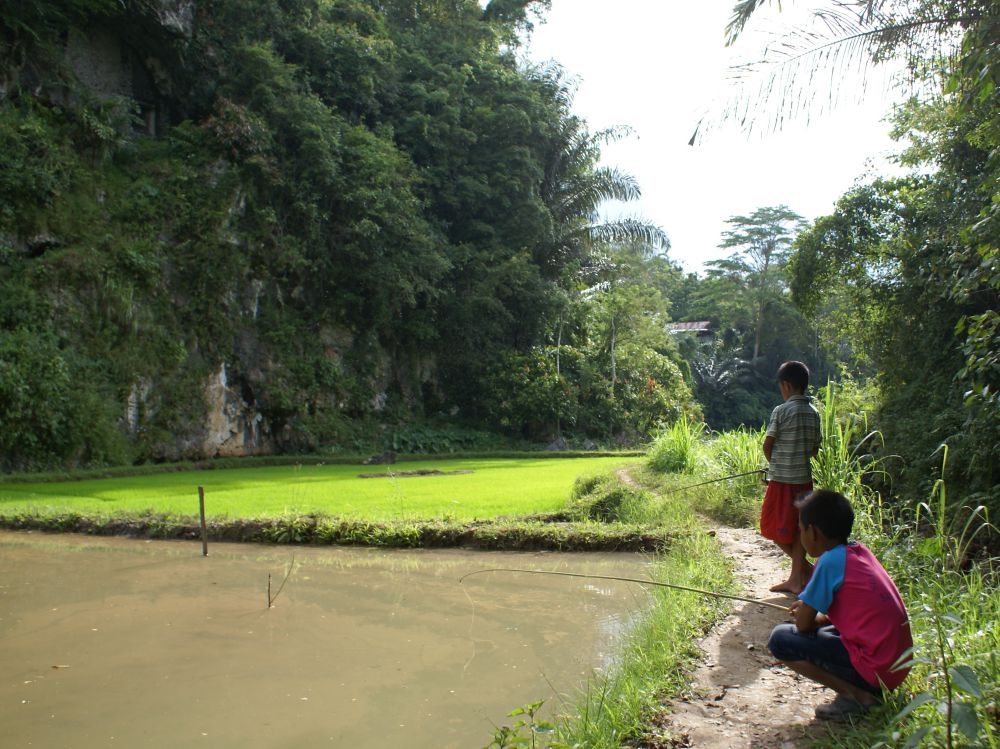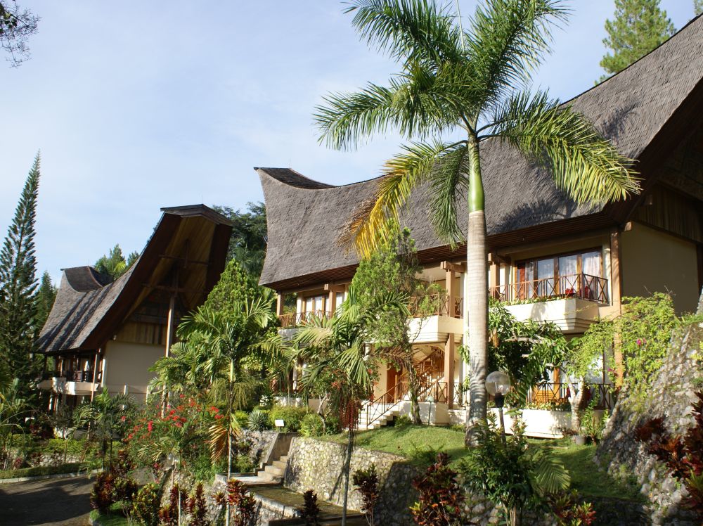 Børnene i vejkanten byder mig velkommen til Sulawesi og kaster disse håndtegn! Vi begiver os op i højlandet til Toraja-Land hvor “MaleMountain” rejser sig foran os!Kort efter gør vi kaffe-pause på denne vejside-café hvor vi har en flot udsigt til “Female Mountain”.. (navnene er ikke nogen jeg har fundet på!).Velkommen til Tana Toraja (Tana betyder Land på det lokale sprog!).Indkvarteringen behøver ikke fejle noget. Boede i disse fine bygninger i noget der minder om deres traditionelle byggestil i smukke smukke omgivelser.En bøffel som er en af Toraja-folkets mest værdifulde ejendomme. Jeg skulle snart opleve hvordan en del bøfler ender deres liv på disse kanter…Typisk landskabsbillede fra Toraja med grønne rismarker – 90% af folket lever af landbrug.