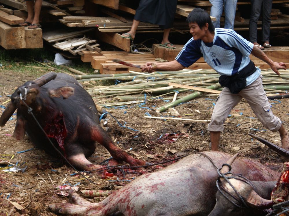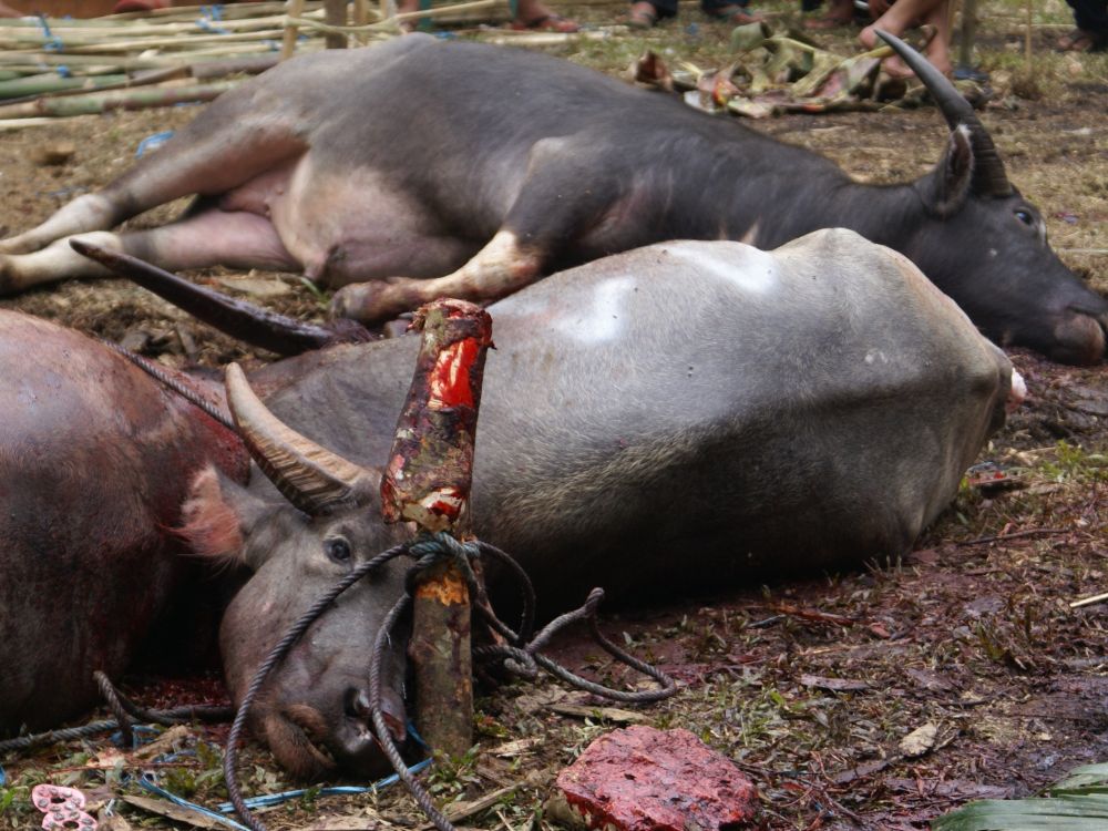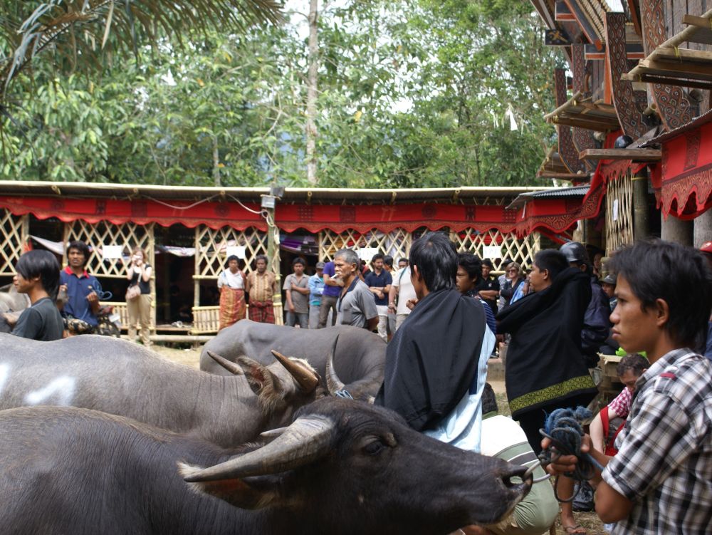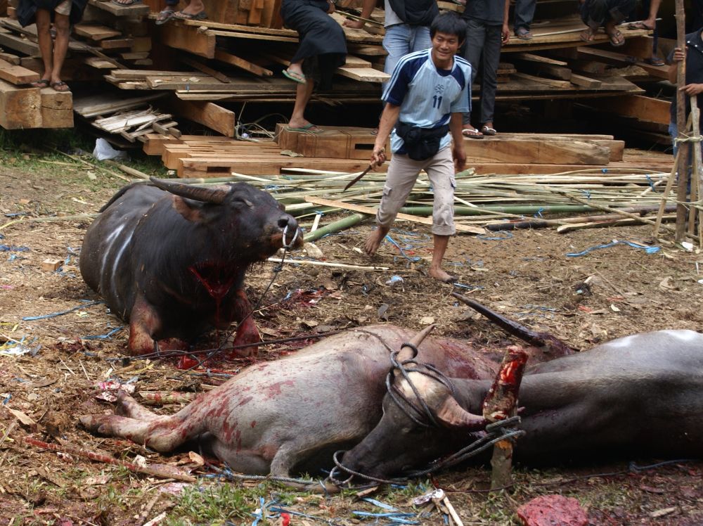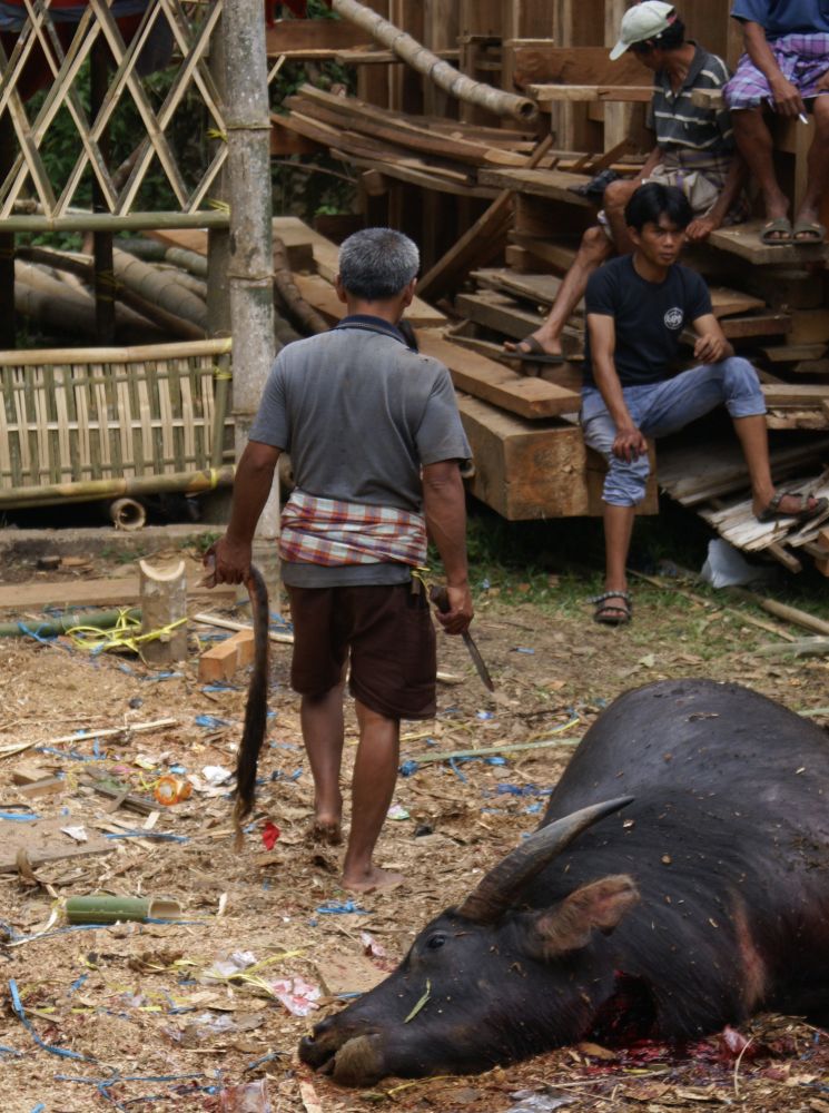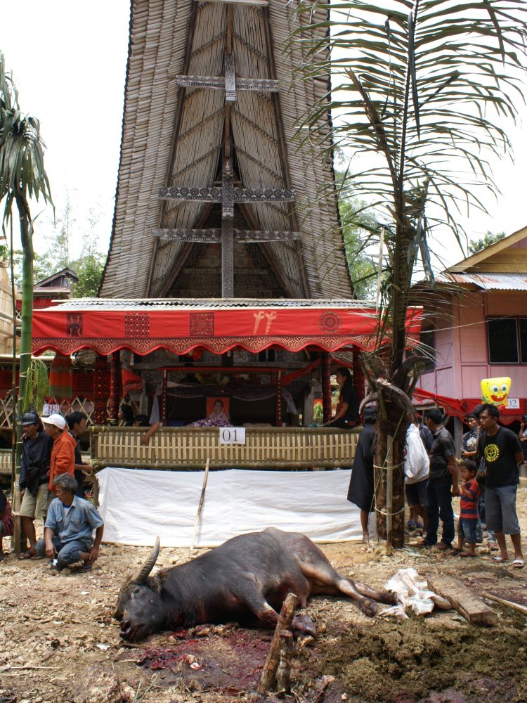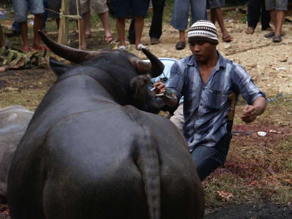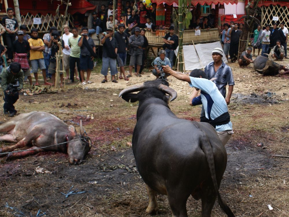 Stedet hvor den afdøde ligger, med hendes billede foran.Gæster fra nær og fjern kommer til begravelse med deres gaver – de fleste familíer medbringer enten en gris eller en bøffel. Vi nøjedes med et karton cigaretter, da det også er kotyme at man får halvdelen af dyret med retur når det er blevet slagtet!Her ligger alle grisene=gaverne. De er alle levende og ligger bundet fast i flere timer mens ceremonien foregår. Til tider en overdøvende larm af skrigende grise – en lyd der forfulgte mig resten af dagen og aftenen!De tætteste familiemedlemmer ankommer.... og bliver henvist til et telt i midten af det hele.Ofringen af grisen er gået igang. Hurtigt og effektivt får de stukket en kniv i hjertet mens de ligger bundet fast til bambusrørene.Flammekaster til at lave helstegt pattegris bruges ikke ofte nok i DK.Mens manden her forsøger at finde og fjerne mavesækken og endetarmen… … serverer pigerne te og kager for gæsterne. Det foregår lige ved siden af!!! Alt bruges fra grisen – her hælder de det friske blod fra og ned i et bambusrør. Så er grisen klar til at man hver især kan tage sig andel med hjem igen.. Var glad for vi ikke valgte at komme med en gris også.. Herefter tog vi på markedet hvor man bl.a. kan købe grise og bøffler til eget brug eller begravelse. Dyrene på billedet er levende!En indkøbspose under armen er på Sulawesi en levende gris over skulderen. Vi fortsatte til afdelingen for bøfler... hvor denne mand stolt viste sin meget værdifulde tyr frem. En hvid kastreret tyr som denne er den mest værdifulde bøffel man kan eje, og en sådan slagtes ved begravelser hvis den afdøde er en meget vigtig/rig embedsmand.Her sidder to lokale og forhandler lidt om prisen på risen…..I mens moren her har lagt sit barn til at sove blandt de døde fisk i butikken! Selvom Toraja ligger midt inde i landet med langt til havet, er fiskeopdræt i små søer på markerne meget brugt. Her en bunke med tørfisk, hvilket giver en dejlig duft i 25 graders varme..Ved den lille landsby Lemo har man hugget gravene ind i klippevæggene. På klipperne ses også de karakteristiske ”Tau tau-figurer”, der er udskåret i træ og skal beskytte de afdøde mod onde ånder.En hård dag på kontoret! – der tages notater på en frokostrestaurant med den fineste grønne udsigt!En skøn fredfyldt plet hvor livet på marken dik sin stille gang.Tree of Life eller et gravtræ, hvor afdøde spædbørn begraves i små kamre, der er skåret ind i træet.Denne type gravpladser anvendes kun til børn, der er døde, inden de har fået tænder, og ifølge Torajafolkets mytologi vokser børnenes sjæl så opad sammen med træet op videre op i himlen.Ikke langt fra gravtræet ligger en stor sø…… hvor de lokale børn forsøgte deres held med fiskesnøren. Her ved denne landsby er de i fuld gang med at bygge et hus til en begravelses-ceremoni der skulle finde sted 3 måneder senere, så det er en del forberedelse og arbejde i forbindelse med sådan en begravelse. Efter begravelsen bliver huset revet ned igen – og de fattigste familier sælger træet bagefter. Der er dog ikke meget prestige i at bygge en begravelse eller hus op bestående af genbrug!!Den efterfølgende dag var det så tid til den store ceremoni hvor bøflerne skulle ofres/slagtes. Det var med noget blandet følelser at jeg mødte op til dagen med. Jeg vidste jo udemærket hvad der skulle ske, men vidste ikke hvad jeg skulle synes om det og hvordan jeg ville reagere.Jeg ville jo umiddelbart sige at det der nu skulle ske, ikke var for børn – men det var det! Børn i alle aldre var med til begivenheden.. (ikke om jeg ville udsætte mit barn for dette!!).Bøflerne blev pænt vist frem og præsenteret af de respektive familer der havde medbragt dem som gaver til de efterladte! En bøffel er den mest fornemme gave man kan give og få.Alle bøflerne noteres og skrives ned – ligesom vi kender med gavelister herhjemme.Man kunne også mærke at intensiteten steg i takt med at vi nærmede os det tidspunkt hvor bøflerne skulle ofres.Knap var dyret dødt før manden her ser en mulighed for at score en frisk bøffel-hale.. I følge min guide skulle den bruges til dørhåndtag!!!??! De mænd som fører macheten er specielt uddannet til det og hyres til begravelserne. Hans machete stiger i værdi alt efter hvor mange bøfler den har skåret halsen over på!Skulle lige finde en grimasse der kunne passe da dette billede skulle tages. Hvilken oplevelse.. ikke nødvendigvis god – men intens, og helt sikkert noget jeg aldrig vel glemme.Efter begravelsen kørte vi til højlandet ca. 20 km nordpå som markerer græsen til Toraja land. Vores mål var toppen af Gunung Sesean – et af de højeste bjerge på Sulawesi med ca. 2.100 meter.Køreturen derop var helt fantastisk med rismarker hele vejen op af bjerget og små landsbyer kastet tilfældigt ind i landskabet. Måtte gøre flere fotostops undervejs, og på et tidspunkt sendte vi bilen i forvejen og gik et godt stykke selv. Det er naturligvis den rigtige måde at gøre det på og der er masser af vandrestier i området.Halvvejs oppe ad bjerget ligger der en lille og meget spartansk coffee shop, med et meget begrænset udbud….. men i modsætning til Starbucks kunne de servere denne fremragende udsigt – helt gratis! På toppen af Gunung Sesean ligger der et lille guesthouse med en tilhørende restaurant. Min guide – den gode Mr Stanislaus som er professor og underviser på Universitetet i Makassar – valgte naturligvis at bestille bøffel denne dag….Den lokale vejside kiosk – eller Torajas svar på 7-Eleven! En lille landsby bestående af de traditionelle huse – Tongkonan. Fakstisk var mange af denne landsbys beboer også nogle der deltog ved begravelsen. Sidste stop på min rundtur i Toraja Land var ved de hængende kister i Kété Kesu, hvor kisterne er monteret på klippesiderne på indhuggede pæle.En gammel kiste er faldet ned og gået i stykker og en hel fami