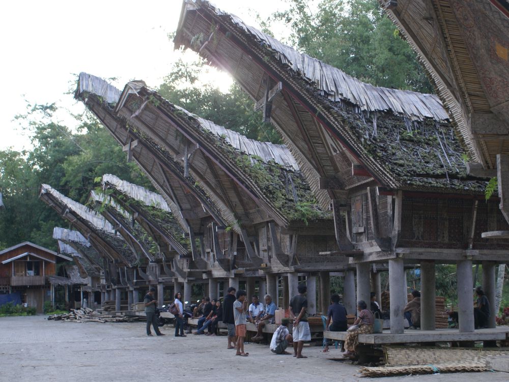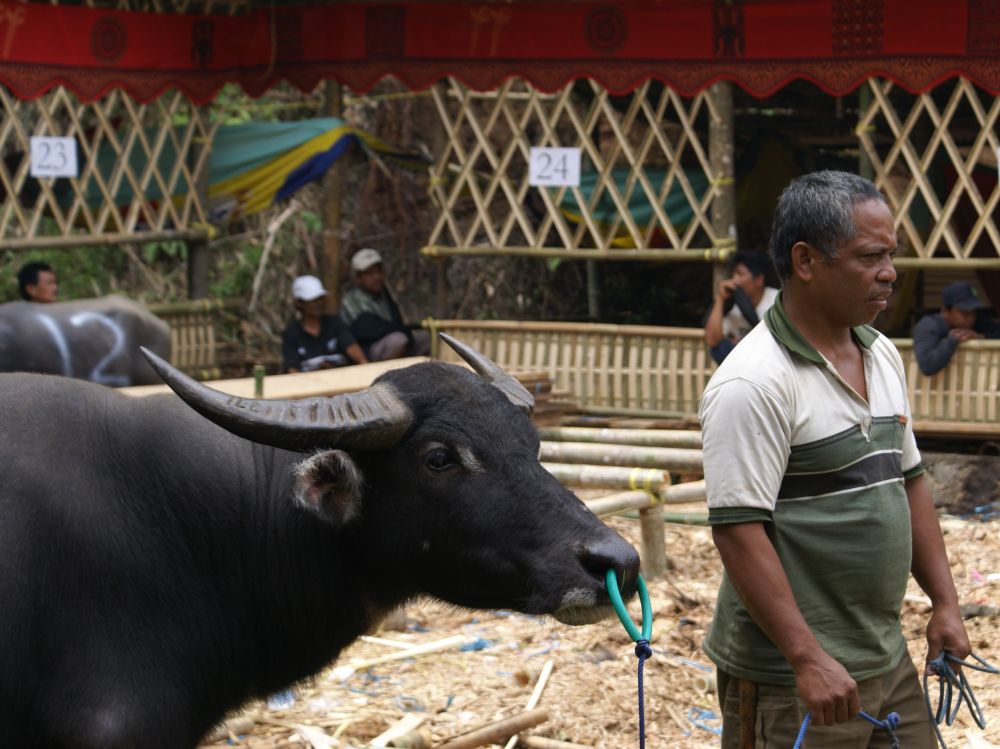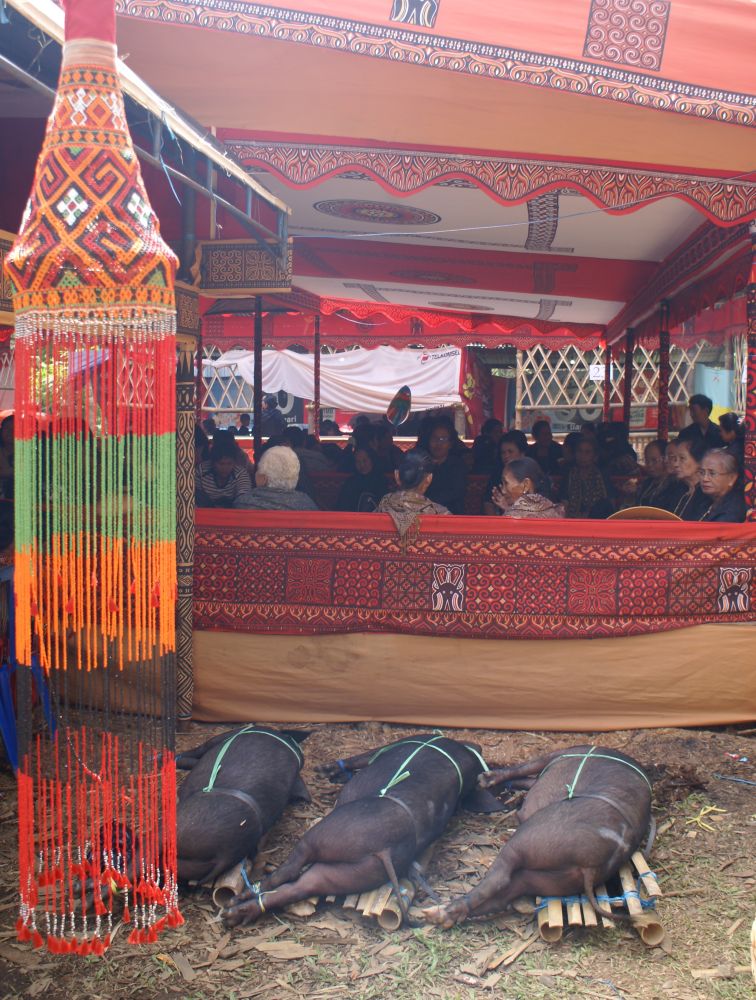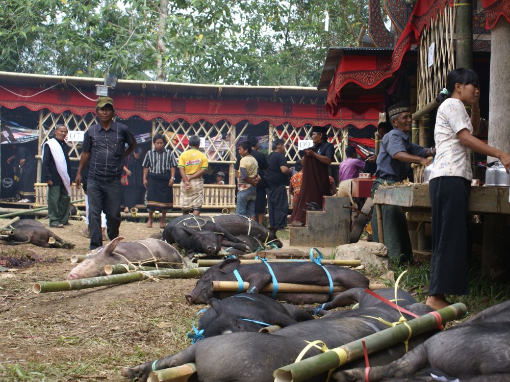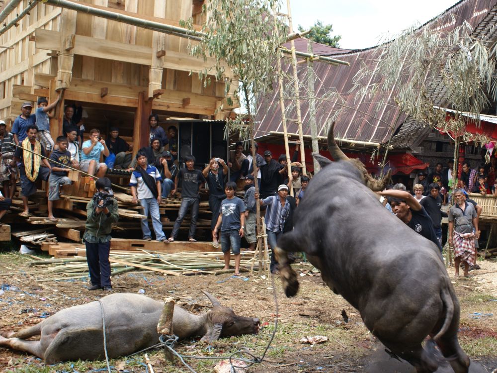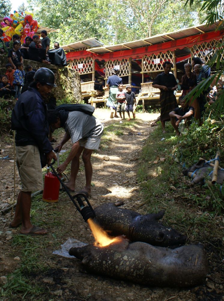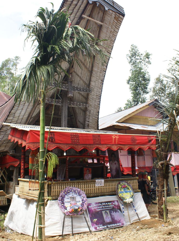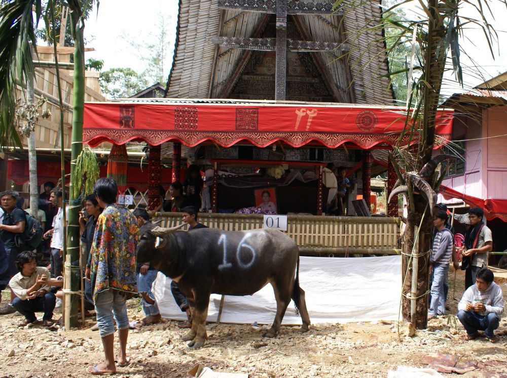 Stedet hvor den afdøde ligger, med hendes billede foran.Gæster fra nær og fjern kommer til begravelse med deres gaver – de fleste familíer medbringer enten en gris eller en bøffel. Vi nøjedes med et karton cigaretter, da det også er kotyme at man får halvdelen af dyret med retur når det er blevet slagtet!Her ligger alle grisene=gaverne. De er alle levende og ligger bundet fast i flere timer mens ceremonien foregår. Til tider en overdøvende larm af skrigende grise – en lyd der forfulgte mig resten af dagen og aftenen!De tætteste familiemedlemmer ankommer.... og bliver henvist til et telt i midten af det hele.Ofringen af grisen er gået igang. Hurtigt og effektivt får de stukket en kniv i hjertet mens de ligger bundet fast til bambusrørene.Flammekaster til at lave helstegt pattegris bruges ikke ofte nok i DK.Mens manden her forsøger at finde og fjerne mavesækken og endetarmen… … serverer pigerne te og kager for gæsterne. Det foregår lige ved siden af!!! Alt bruges fra grisen – her hælder de det friske blod fra og ned i et bambusrør. Så er grisen klar til at man hver især kan tage sig andel med hjem igen.. Var glad for vi ikke valgte at komme med en gris også.. Herefter tog vi på markedet hvor man bl.a. kan købe grise og bøffler til eget brug eller begravelse. Dyrene på billedet er levende!En indkøbspose under armen er på Sulawesi en levende gris over skulderen. Vi fortsatte til afdelingen for bøfler... hvor denne mand stolt viste sin meget værdifulde tyr frem. En hvid kastreret tyr som denne er den mest værdifulde bøffel man kan eje, og en sådan slagtes ved begravelser hvis den afdøde er en meget vigtig/rig embedsmand.Her sidder to lokale og forhandler lidt om prisen på risen…..I mens moren her har lagt sit barn til at sove blandt de døde fisk i butikken! Selvom Toraja ligger midt inde i landet med langt til havet, er fiskeopdræt i små søer på markerne meget brugt. Her en bunke med tørfisk, hvilket giver en dejlig duft i 25 graders varme..Ved den lille landsby Lemo har man hugget gravene ind i klippevæggene. På klipperne ses også de karakteristiske ”Tau tau-figurer”, der er udskåret i træ og skal beskytte de afdøde mod onde ånder.En hård dag på kontoret! – der tages notater på en frokostrestaurant med den fineste grønne udsigt!En skøn fredfyldt plet hvor livet på marken dik sin stille gang.Tree of Life eller et gravtræ, hvor afdøde spædbørn begraves i små kamre, der er skåret ind i træet.Denne type gravpladser anvendes kun til børn, der er døde, inden de har fået tænder, og ifølge Torajafolkets mytologi vokser børnenes sjæl så opad sammen med træet op videre op i himlen.Ikke langt fra gravtræet ligger en stor sø…… hvor de lokale børn forsøgte deres held med fiskesnøren. Her ved denne landsby er de i fuld gang med at bygge et hus til en begravelses-ceremoni der skulle finde sted 3 måneder senere, så det er en del forberedelse og arbejde i forbindelse med sådan en begravelse. Efter begravelsen bliver huset revet ned igen – og de fattigste familier sælger træet bagefter. Der er dog ikke meget prestige i at bygge en begravelse eller hus op bestående af genbrug!!Den efterfølgende dag var det så tid til den store ceremoni hvor bøflerne skulle ofres/slagtes. Det var med noget blandet følelser at jeg mødte op til dagen med. Jeg vidste jo udemærket hvad der skulle ske, men vidste ikke hvad jeg skulle synes om det og hvordan jeg ville reagere.Jeg ville jo umiddelbart sige at det der nu skulle ske, ikke var for børn – men det var det! Børn i alle aldre var med til begivenheden.. (ikke om jeg ville udsætte mit barn for dette!!).Bøflerne blev pænt vist frem og præsenteret af de respektive familer der havde medbragt dem som gaver til de efterladte! En bøffel er den mest fornemme gave man kan give og få.Alle bøflerne noteres og skrives ned – ligesom vi kender med gavelister herhjemme.Man kunne også mærke at intensiteten steg i takt med at vi nærmede os det tidspunkt hvor bøflerne skulle ofres.Knap var dyret dødt før manden her ser en mulighed for at score en frisk bøffel-hale.. I følge min guide skulle den bruges til dørhåndtag!!!??! De mænd som fører macheten er specielt uddannet til det og hyres til begravelserne. Hans machete stiger i værdi alt efter hvor mange bøfler den har skåret halsen over på!Skulle lige finde en grimasse der kunne passe da dette billede skulle tages. Hvilken oplevelse.. ikke nødvendigvis god – men intens, og helt sikkert noget jeg aldrig vel glemme.Efter begravelsen kørte vi til højlandet ca. 20 km nordpå som markerer græsen til Toraja land. Vores mål var toppen af Gunung Sesean – et af de højeste bjerge på Sulawesi med ca. 2.100 meter.Køreturen derop var helt fantastisk med rismarker hele vejen op af bjerget og små landsbyer kastet tilfældigt ind i landskabet. Måtte gøre flere fotostops undervejs, og på et tidspunkt sendte vi bilen i forvejen og gik et godt stykke selv. Det er naturligvis den rigtige måde at gøre det på og der er masser af vandrestier i området.Halvvejs oppe ad bjerget ligger der en lille og meget spartansk coffee shop, med et meget begrænset udbud….. men i modsætning til Starbucks kunne de servere denne fremragende udsigt – helt gratis! På toppen af Gunung Sesean ligger der et lille guesthouse med en tilhørende restaurant. Min guide – den gode Mr Stanislaus som er professor og underviser på Universitetet i Makassar – valgte naturligvis at bestille bøffel denne dag….Den lokale vejside kiosk – eller Torajas svar på 7-Eleven! En lille landsby bestående af de traditionelle huse – Tongkonan. Fakstisk var mange af denne landsbys beboer også nogle der deltog ved begravelsen. Sidste stop på min rundtur i Toraja Land var ved de hængende kister i Kété Kesu, hvor kisterne er monteret på klippesiderne på indhuggede pæle.En gammel kiste er faldet ned og gået i stykker og en hel fami