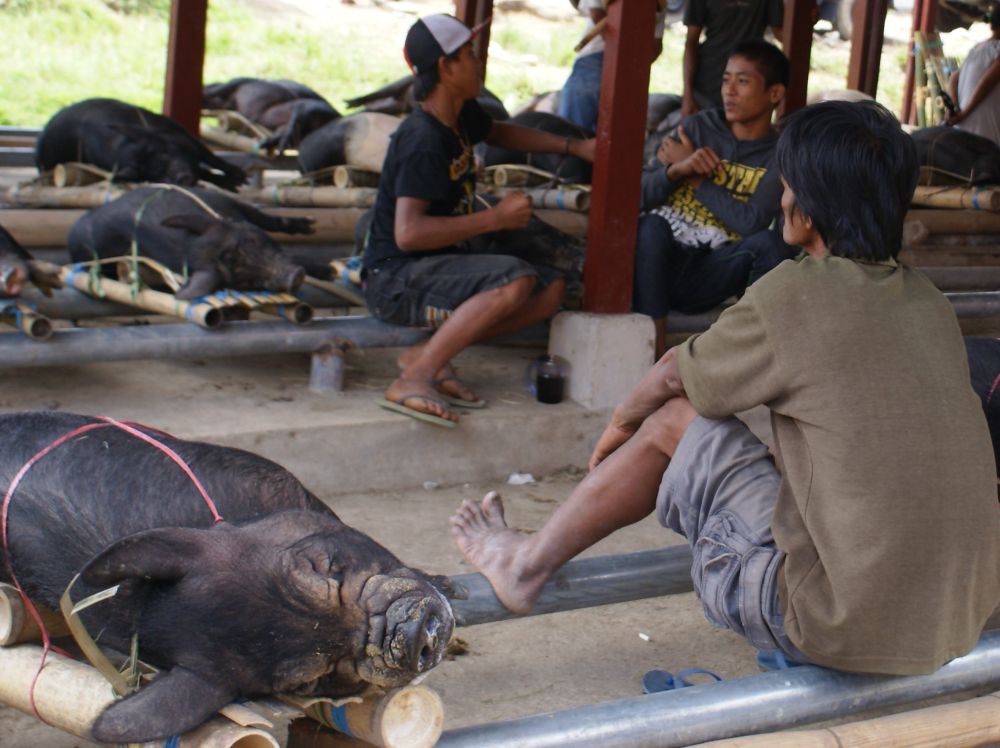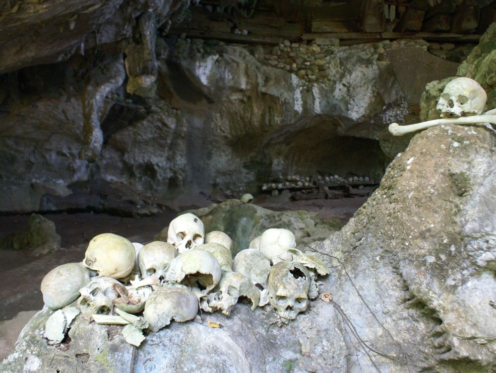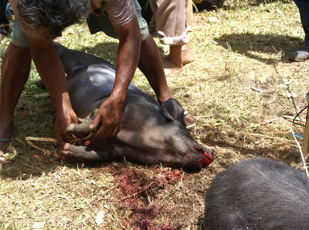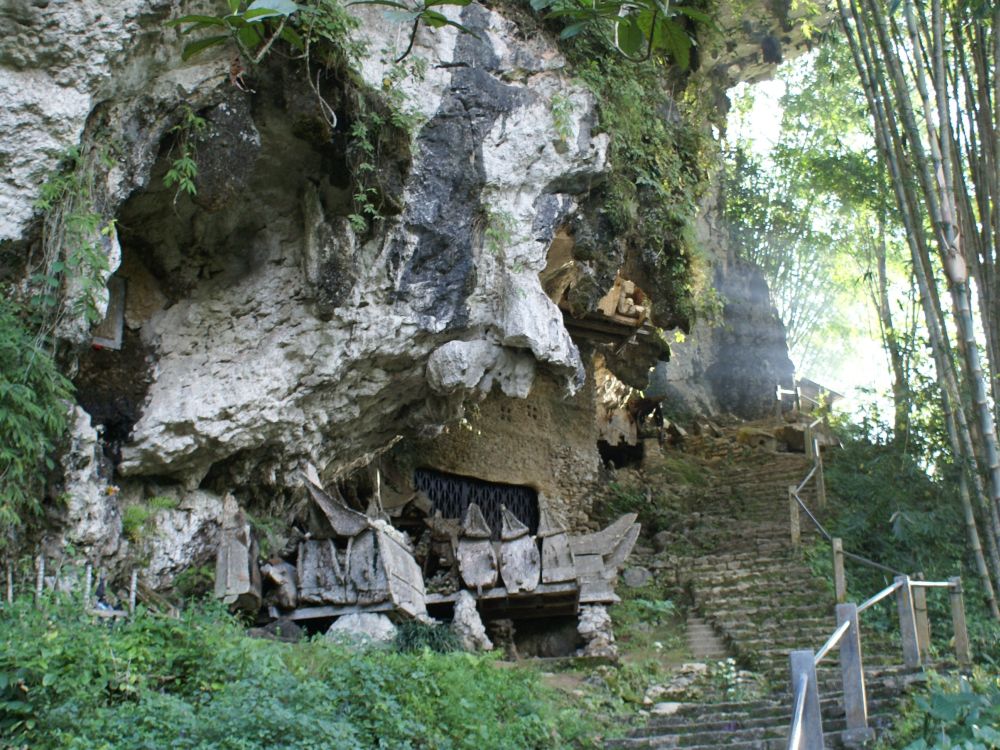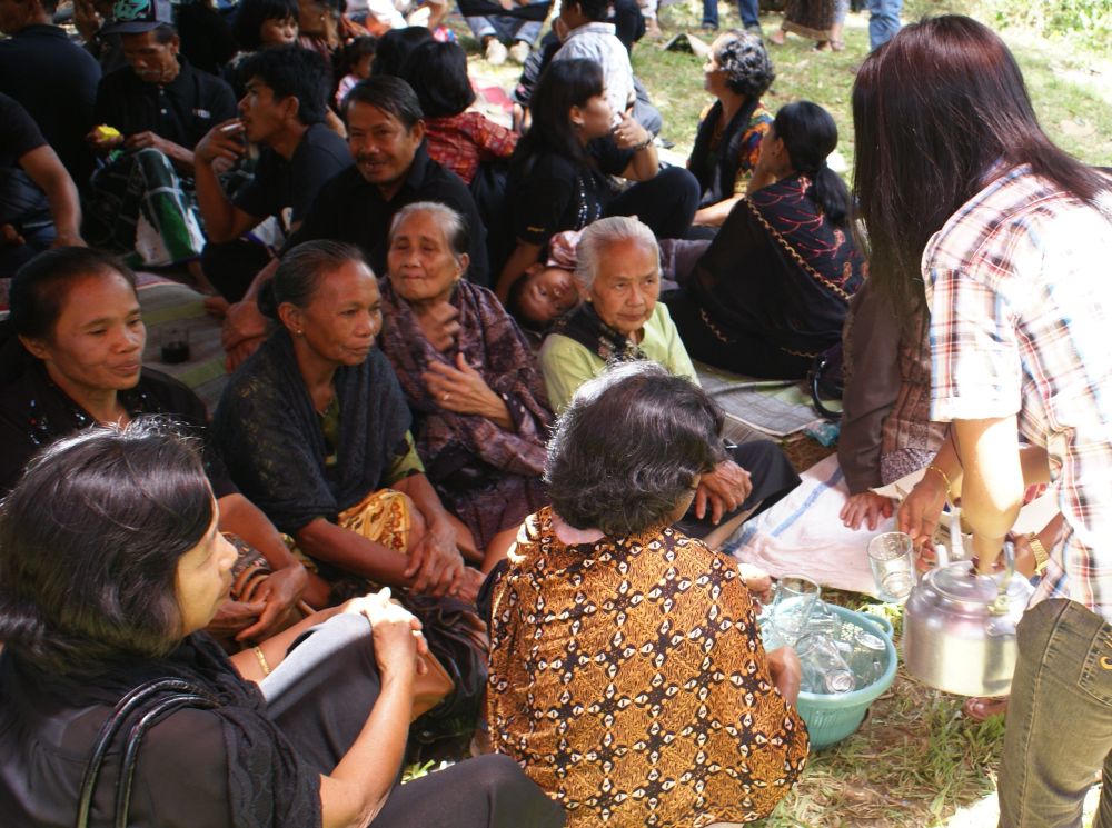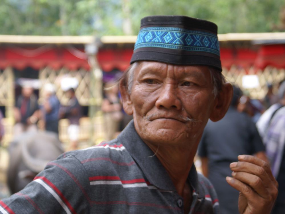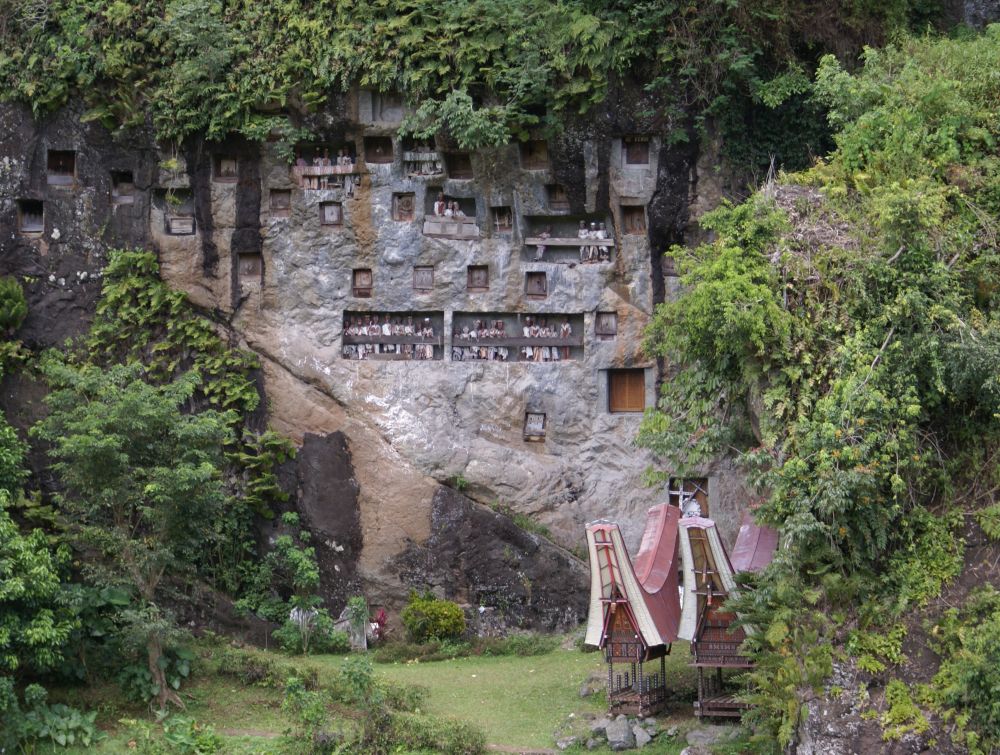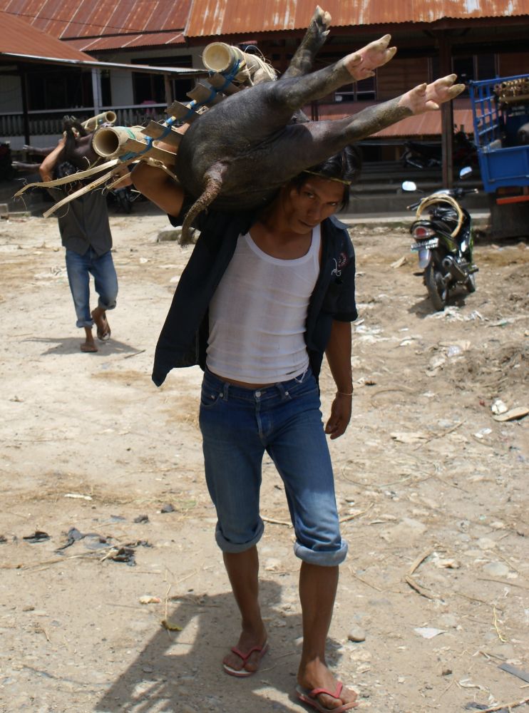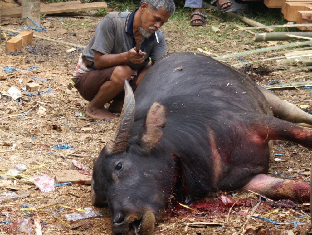 Stedet hvor den afdøde ligger, med hendes billede foran.Gæster fra nær og fjern kommer til begravelse med deres gaver – de fleste familíer medbringer enten en gris eller en bøffel. Vi nøjedes med et karton cigaretter, da det også er kotyme at man får halvdelen af dyret med retur når det er blevet slagtet!Her ligger alle grisene=gaverne. De er alle levende og ligger bundet fast i flere timer mens ceremonien foregår. Til tider en overdøvende larm af skrigende grise – en lyd der forfulgte mig resten af dagen og aftenen!De tætteste familiemedlemmer ankommer.... og bliver henvist til et telt i midten af det hele.Ofringen af grisen er gået igang. Hurtigt og effektivt får de stukket en kniv i hjertet mens de ligger bundet fast til bambusrørene.Flammekaster til at lave helstegt pattegris bruges ikke ofte nok i DK.Mens manden her forsøger at finde og fjerne mavesækken og endetarmen… … serverer pigerne te og kager for gæsterne. Det foregår lige ved siden af!!! Alt bruges fra grisen – her hælder de det friske blod fra og ned i et bambusrør. Så er grisen klar til at man hver især kan tage sig andel med hjem igen.. Var glad for vi ikke valgte at komme med en gris også.. Herefter tog vi på markedet hvor man bl.a. kan købe grise og bøffler til eget brug eller begravelse. Dyrene på billedet er levende!En indkøbspose under armen er på Sulawesi en levende gris over skulderen. Vi fortsatte til afdelingen for bøfler... hvor denne mand stolt viste sin meget værdifulde tyr frem. En hvid kastreret tyr som denne er den mest værdifulde bøffel man kan eje, og en sådan slagtes ved begravelser hvis den afdøde er en meget vigtig/rig embedsmand.Her sidder to lokale og forhandler lidt om prisen på risen…..I mens moren her har lagt sit barn til at sove blandt de døde fisk i butikken! Selvom Toraja ligger midt inde i landet med langt til havet, er fiskeopdræt i små søer på markerne meget brugt. Her en bunke med tørfisk, hvilket giver en dejlig duft i 25 graders varme..Ved den lille landsby Lemo har man hugget gravene ind i klippevæggene. På klipperne ses også de karakteristiske ”Tau tau-figurer”, der er udskåret i træ og skal beskytte de afdøde mod onde ånder.En hård dag på kontoret! – der tages notater på en frokostrestaurant med den fineste grønne udsigt!En skøn fredfyldt plet hvor livet på marken dik sin stille gang.Tree of Life eller et gravtræ, hvor afdøde spædbørn begraves i små kamre, der er skåret ind i træet.Denne type gravpladser anvendes kun til børn, der er døde, inden de har fået tænder, og ifølge Torajafolkets mytologi vokser børnenes sjæl så opad sammen med træet op videre op i himlen.Ikke langt fra gravtræet ligger en stor sø…… hvor de lokale børn forsøgte deres held med fiskesnøren. Her ved denne landsby er de i fuld gang med at bygge et hus til en begravelses-ceremoni der skulle finde sted 3 måneder senere, så det er en del forberedelse og arbejde i forbindelse med sådan en begravelse. Efter begravelsen bliver huset revet ned igen – og de fattigste familier sælger træet bagefter. Der er dog ikke meget prestige i at bygge en begravelse eller hus op bestående af genbrug!!Den efterfølgende dag var det så tid til den store ceremoni hvor bøflerne skulle ofres/slagtes. Det var med noget blandet følelser at jeg mødte op til dagen med. Jeg vidste jo udemærket hvad der skulle ske, men vidste ikke hvad jeg skulle synes om det og hvordan jeg ville reagere.Jeg ville jo umiddelbart sige at det der nu skulle ske, ikke var for børn – men det var det! Børn i alle aldre var med til begivenheden.. (ikke om jeg ville udsætte mit barn for dette!!).Bøflerne blev pænt vist frem og præsenteret af de respektive familer der havde medbragt dem som gaver til de efterladte! En bøffel er den mest fornemme gave man kan give og få.Alle bøflerne noteres og skrives ned – ligesom vi kender med gavelister herhjemme.Man kunne også mærke at intensiteten steg i takt med at vi nærmede os det tidspunkt hvor bøflerne skulle ofres.Knap var dyret dødt før manden her ser en mulighed for at score en frisk bøffel-hale.. I følge min guide skulle den bruges til dørhåndtag!!!??! De mænd som fører macheten er specielt uddannet til det og hyres til begravelserne. Hans machete stiger i værdi alt efter hvor mange bøfler den har skåret halsen over på!Skulle lige finde en grimasse der kunne passe da dette billede skulle tages. Hvilken oplevelse.. ikke nødvendigvis god – men intens, og helt sikkert noget jeg aldrig vel glemme.Efter begravelsen kørte vi til højlandet ca. 20 km nordpå som markerer græsen til Toraja land. Vores mål var toppen af Gunung Sesean – et af de højeste bjerge på Sulawesi med ca. 2.100 meter.Køreturen derop var helt fantastisk med rismarker hele vejen op af bjerget og små landsbyer kastet tilfældigt ind i landskabet. Måtte gøre flere fotostops undervejs, og på et tidspunkt sendte vi bilen i forvejen og gik et godt stykke selv. Det er naturligvis den rigtige måde at gøre det på og der er masser af vandrestier i området.Halvvejs oppe ad bjerget ligger der en lille og meget spartansk coffee shop, med et meget begrænset udbud….. men i modsætning til Starbucks kunne de servere denne fremragende udsigt – helt gratis! På toppen af Gunung Sesean ligger der et lille guesthouse med en tilhørende restaurant. Min guide – den gode Mr Stanislaus som er professor og underviser på Universitetet i Makassar – valgte naturligvis at bestille bøffel denne dag….Den lokale vejside kiosk – eller Torajas svar på 7-Eleven! En lille landsby bestående af de traditionelle huse – Tongkonan. Fakstisk var mange af denne landsbys beboer også nogle der deltog ved begravelsen. Sidste stop på min rundtur i Toraja Land var ved de hængende kister i Kété Kesu, hvor kisterne er monteret på klippesiderne på indhuggede pæle.En gammel kiste er faldet ned og gået i stykker og en hel fami
