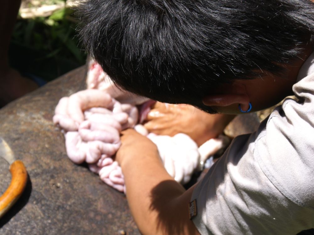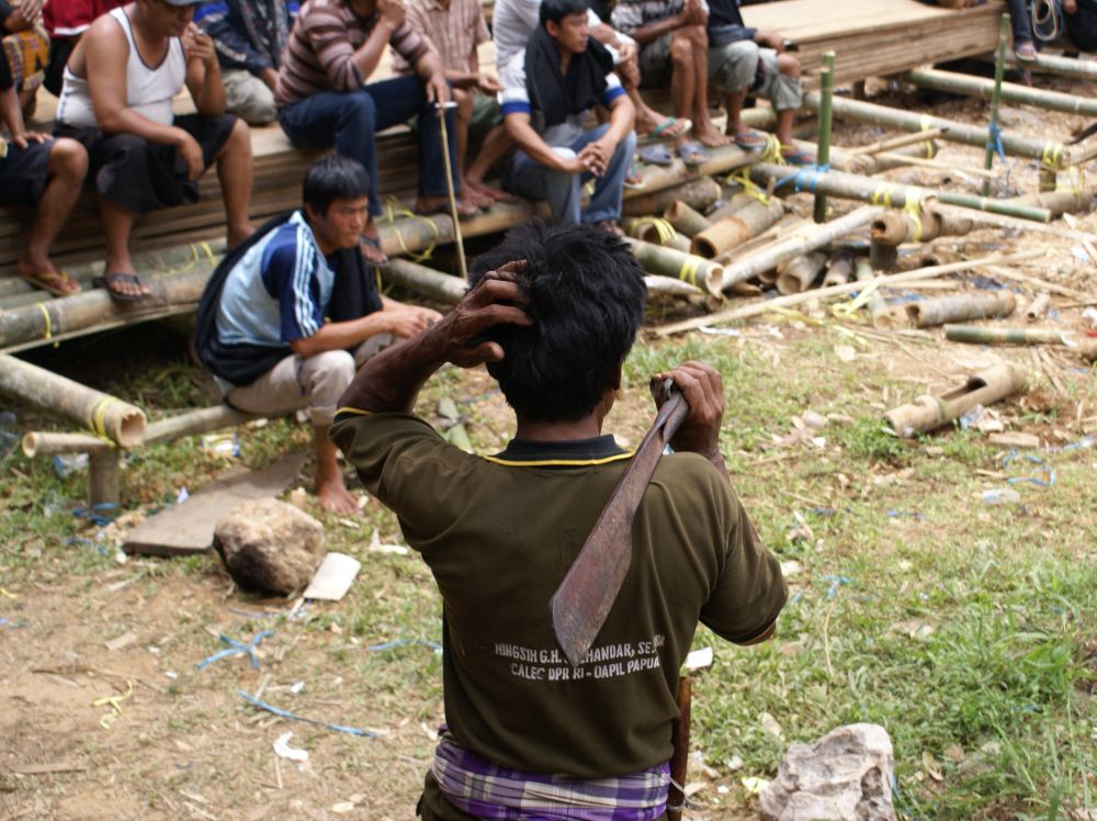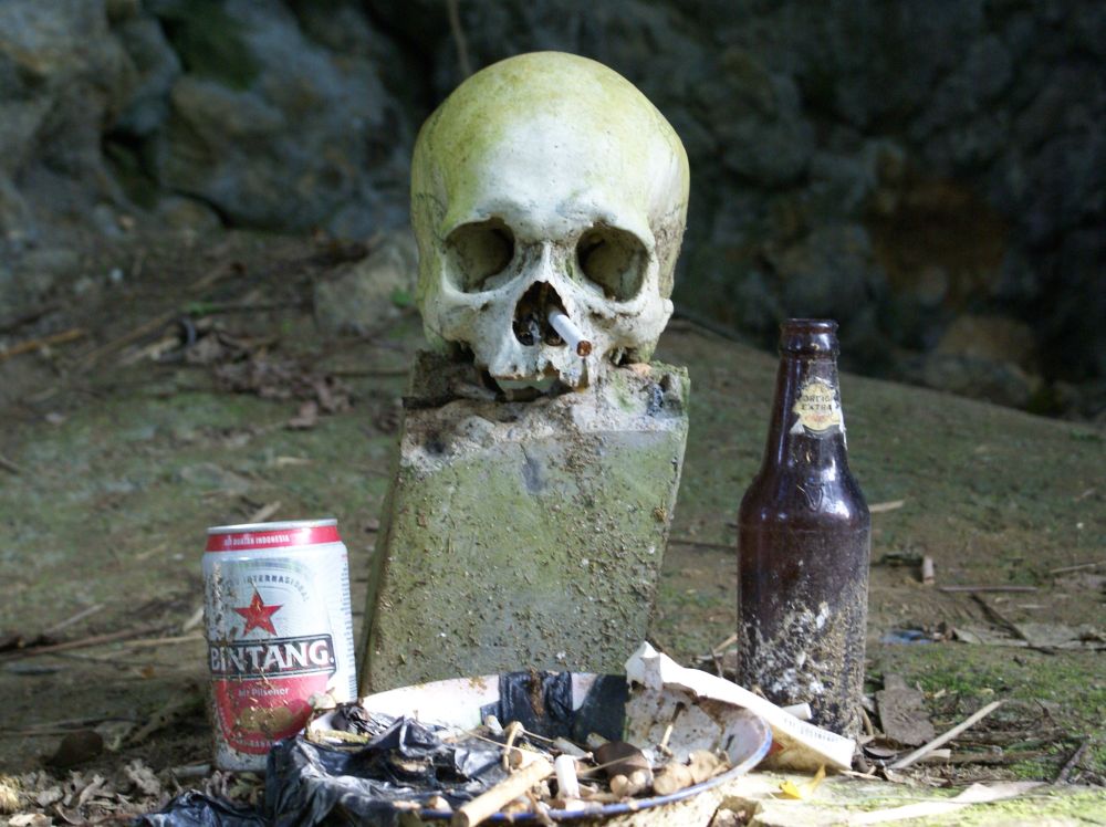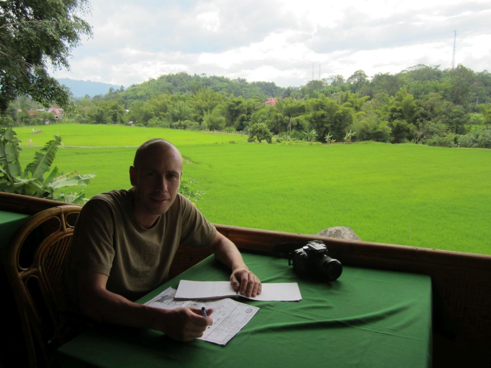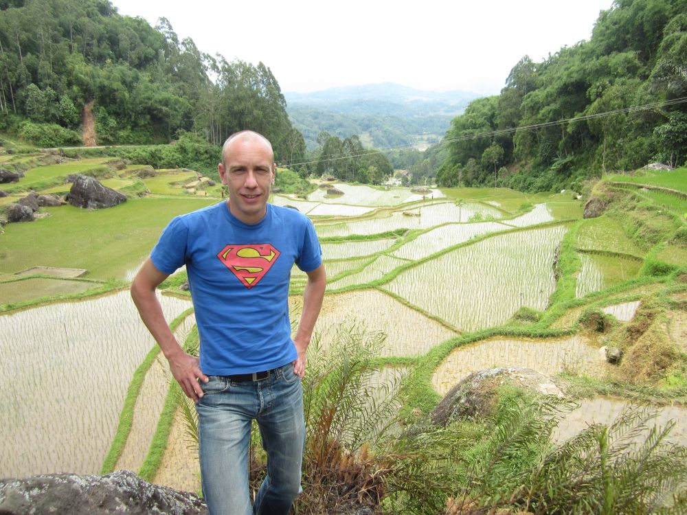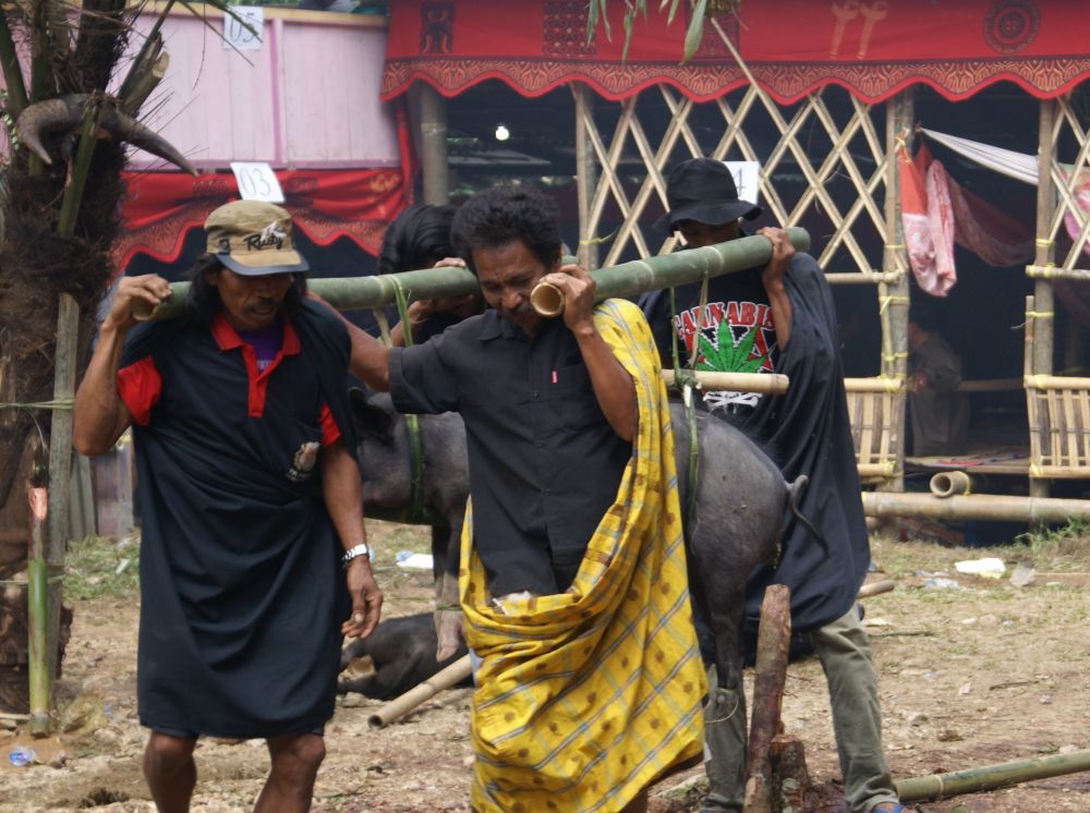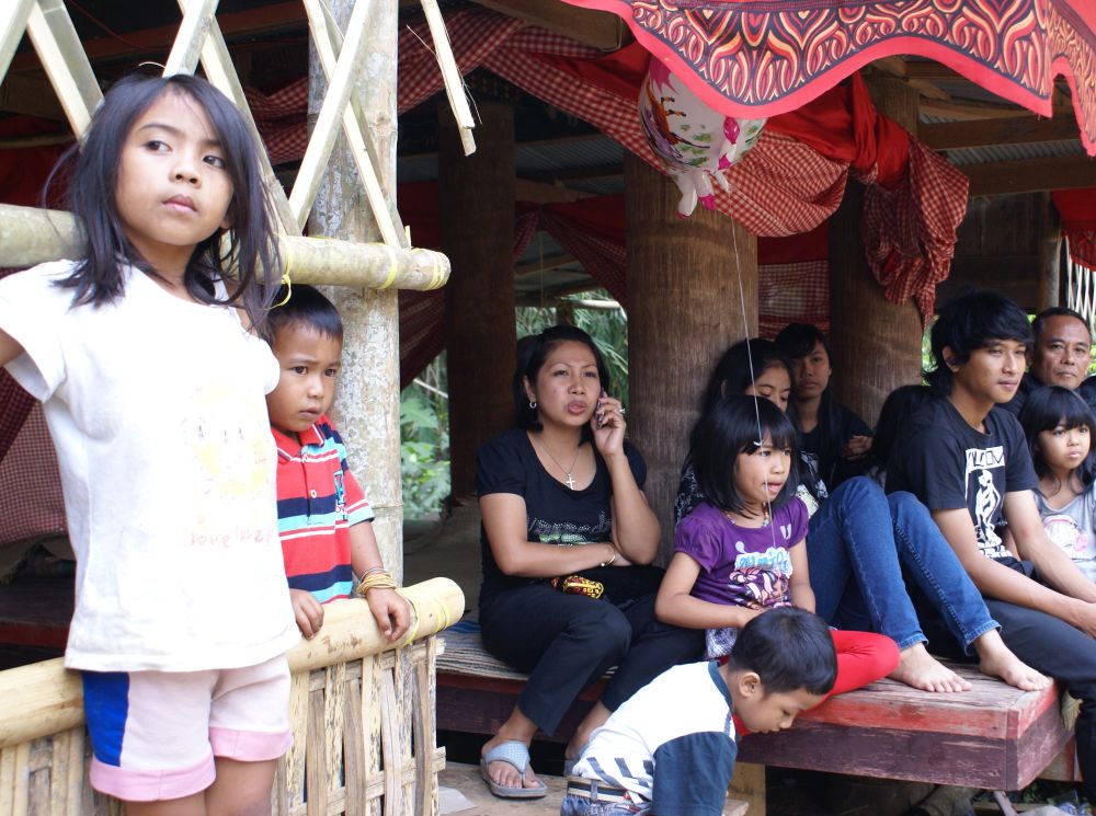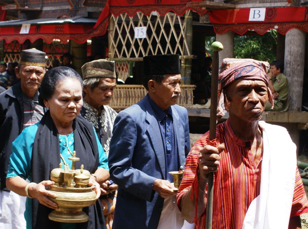 Stedet hvor den afdøde ligger, med hendes billede foran.Gæster fra nær og fjern kommer til begravelse med deres gaver – de fleste familíer medbringer enten en gris eller en bøffel. Vi nøjedes med et karton cigaretter, da det også er kotyme at man får halvdelen af dyret med retur når det er blevet slagtet!Her ligger alle grisene=gaverne. De er alle levende og ligger bundet fast i flere timer mens ceremonien foregår. Til tider en overdøvende larm af skrigende grise – en lyd der forfulgte mig resten af dagen og aftenen!De tætteste familiemedlemmer ankommer.... og bliver henvist til et telt i midten af det hele.Ofringen af grisen er gået igang. Hurtigt og effektivt får de stukket en kniv i hjertet mens de ligger bundet fast til bambusrørene.Flammekaster til at lave helstegt pattegris bruges ikke ofte nok i DK.Mens manden her forsøger at finde og fjerne mavesækken og endetarmen… … serverer pigerne te og kager for gæsterne. Det foregår lige ved siden af!!! Alt bruges fra grisen – her hælder de det friske blod fra og ned i et bambusrør. Så er grisen klar til at man hver især kan tage sig andel med hjem igen.. Var glad for vi ikke valgte at komme med en gris også.. Herefter tog vi på markedet hvor man bl.a. kan købe grise og bøffler til eget brug eller begravelse. Dyrene på billedet er levende!En indkøbspose under armen er på Sulawesi en levende gris over skulderen. Vi fortsatte til afdelingen for bøfler... hvor denne mand stolt viste sin meget værdifulde tyr frem. En hvid kastreret tyr som denne er den mest værdifulde bøffel man kan eje, og en sådan slagtes ved begravelser hvis den afdøde er en meget vigtig/rig embedsmand.Her sidder to lokale og forhandler lidt om prisen på risen…..I mens moren her har lagt sit barn til at sove blandt de døde fisk i butikken! Selvom Toraja ligger midt inde i landet med langt til havet, er fiskeopdræt i små søer på markerne meget brugt. Her en bunke med tørfisk, hvilket giver en dejlig duft i 25 graders varme..Ved den lille landsby Lemo har man hugget gravene ind i klippevæggene. På klipperne ses også de karakteristiske ”Tau tau-figurer”, der er udskåret i træ og skal beskytte de afdøde mod onde ånder.En hård dag på kontoret! – der tages notater på en frokostrestaurant med den fineste grønne udsigt!En skøn fredfyldt plet hvor livet på marken dik sin stille gang.Tree of Life eller et gravtræ, hvor afdøde spædbørn begraves i små kamre, der er skåret ind i træet.Denne type gravpladser anvendes kun til børn, der er døde, inden de har fået tænder, og ifølge Torajafolkets mytologi vokser børnenes sjæl så opad sammen med træet op videre op i himlen.Ikke langt fra gravtræet ligger en stor sø…… hvor de lokale børn forsøgte deres held med fiskesnøren. Her ved denne landsby er de i fuld gang med at bygge et hus til en begravelses-ceremoni der skulle finde sted 3 måneder senere, så det er en del forberedelse og arbejde i forbindelse med sådan en begravelse. Efter begravelsen bliver huset revet ned igen – og de fattigste familier sælger træet bagefter. Der er dog ikke meget prestige i at bygge en begravelse eller hus op bestående af genbrug!!Den efterfølgende dag var det så tid til den store ceremoni hvor bøflerne skulle ofres/slagtes. Det var med noget blandet følelser at jeg mødte op til dagen med. Jeg vidste jo udemærket hvad der skulle ske, men vidste ikke hvad jeg skulle synes om det og hvordan jeg ville reagere.Jeg ville jo umiddelbart sige at det der nu skulle ske, ikke var for børn – men det var det! Børn i alle aldre var med til begivenheden.. (ikke om jeg ville udsætte mit barn for dette!!).Bøflerne blev pænt vist frem og præsenteret af de respektive familer der havde medbragt dem som gaver til de efterladte! En bøffel er den mest fornemme gave man kan give og få.Alle bøflerne noteres og skrives ned – ligesom vi kender med gavelister herhjemme.Man kunne også mærke at intensiteten steg i takt med at vi nærmede os det tidspunkt hvor bøflerne skulle ofres.Knap var dyret dødt før manden her ser en mulighed for at score en frisk bøffel-hale.. I følge min guide skulle den bruges til dørhåndtag!!!??! De mænd som fører macheten er specielt uddannet til det og hyres til begravelserne. Hans machete stiger i værdi alt efter hvor mange bøfler den har skåret halsen over på!Skulle lige finde en grimasse der kunne passe da dette billede skulle tages. Hvilken oplevelse.. ikke nødvendigvis god – men intens, og helt sikkert noget jeg aldrig vel glemme.Efter begravelsen kørte vi til højlandet ca. 20 km nordpå som markerer græsen til Toraja land. Vores mål var toppen af Gunung Sesean – et af de højeste bjerge på Sulawesi med ca. 2.100 meter.Køreturen derop var helt fantastisk med rismarker hele vejen op af bjerget og små landsbyer kastet tilfældigt ind i landskabet. Måtte gøre flere fotostops undervejs, og på et tidspunkt sendte vi bilen i forvejen og gik et godt stykke selv. Det er naturligvis den rigtige måde at gøre det på og der er masser af vandrestier i området.Halvvejs oppe ad bjerget ligger der en lille og meget spartansk coffee shop, med et meget begrænset udbud….. men i modsætning til Starbucks kunne de servere denne fremragende udsigt – helt gratis! På toppen af Gunung Sesean ligger der et lille guesthouse med en tilhørende restaurant. Min guide – den gode Mr Stanislaus som er professor og underviser på Universitetet i Makassar – valgte naturligvis at bestille bøffel denne dag….Den lokale vejside kiosk – eller Torajas svar på 7-Eleven! En lille landsby bestående af de traditionelle huse – Tongkonan. Fakstisk var mange af denne landsbys beboer også nogle der deltog ved begravelsen. Sidste stop på min rundtur i Toraja Land var ved de hængende kister i Kété Kesu, hvor kisterne er monteret på klippesiderne på indhuggede pæle.En gammel kiste er faldet ned og gået i stykker og en hel fami