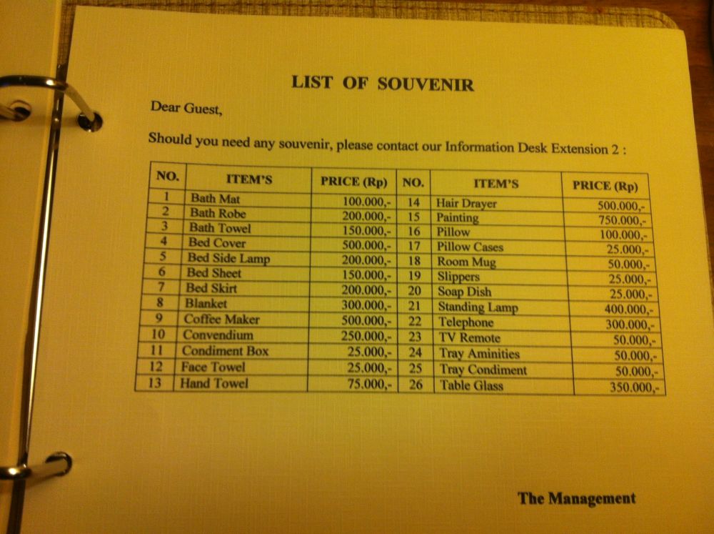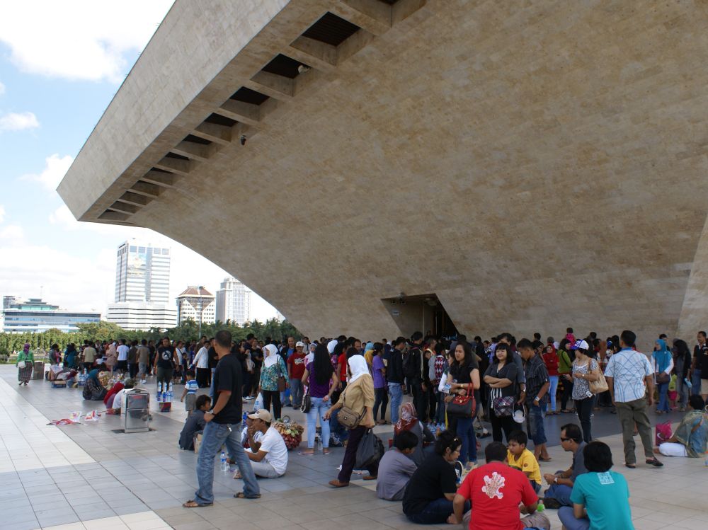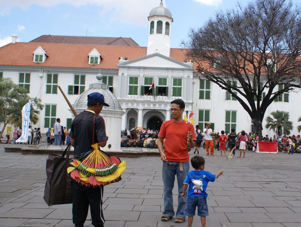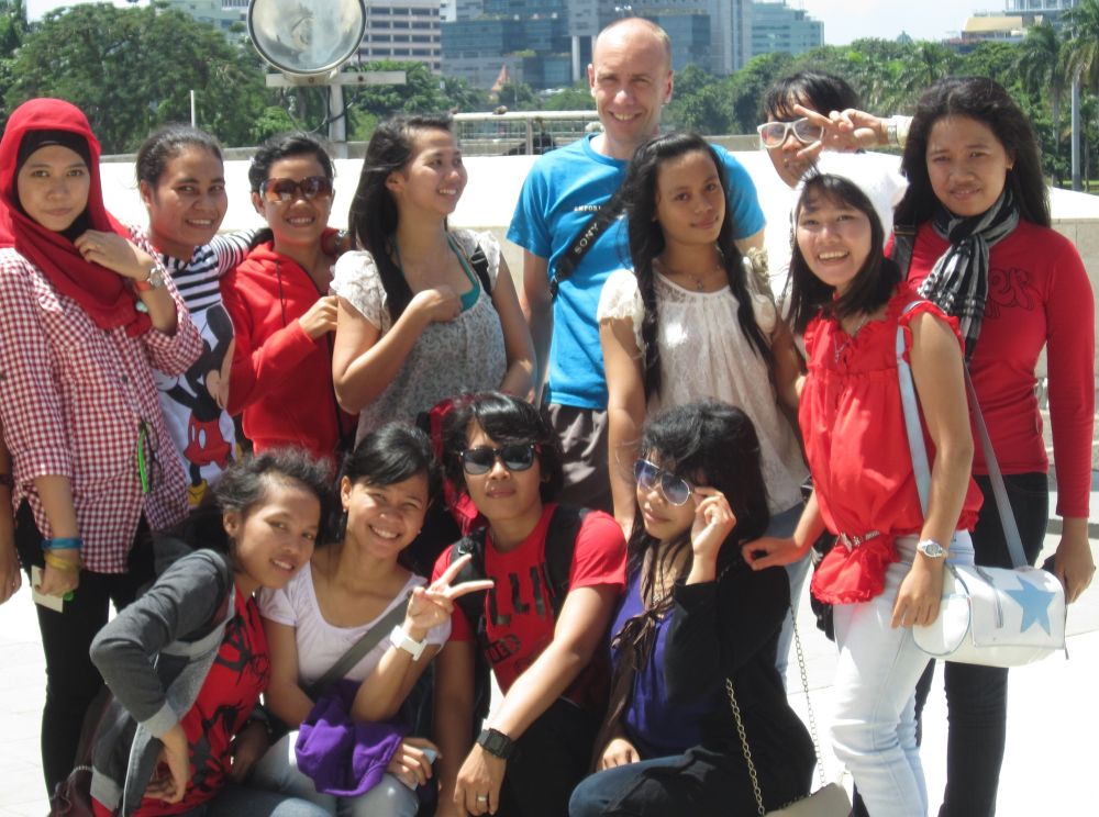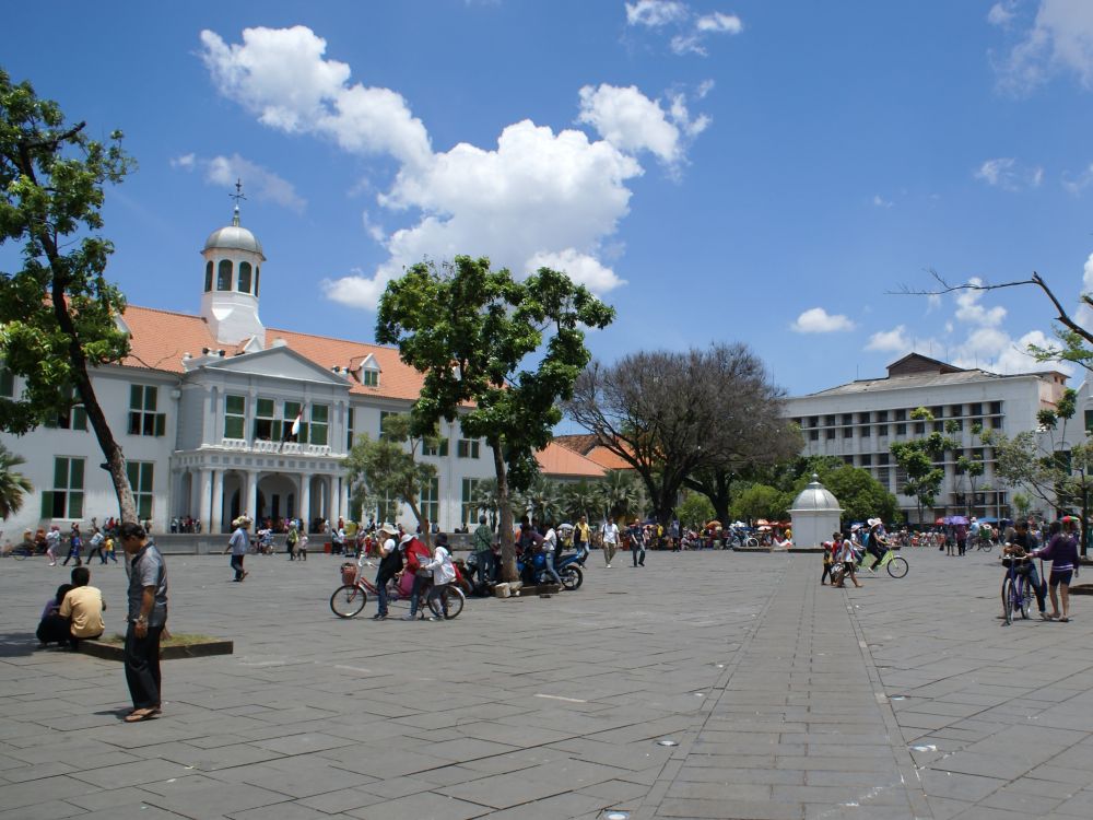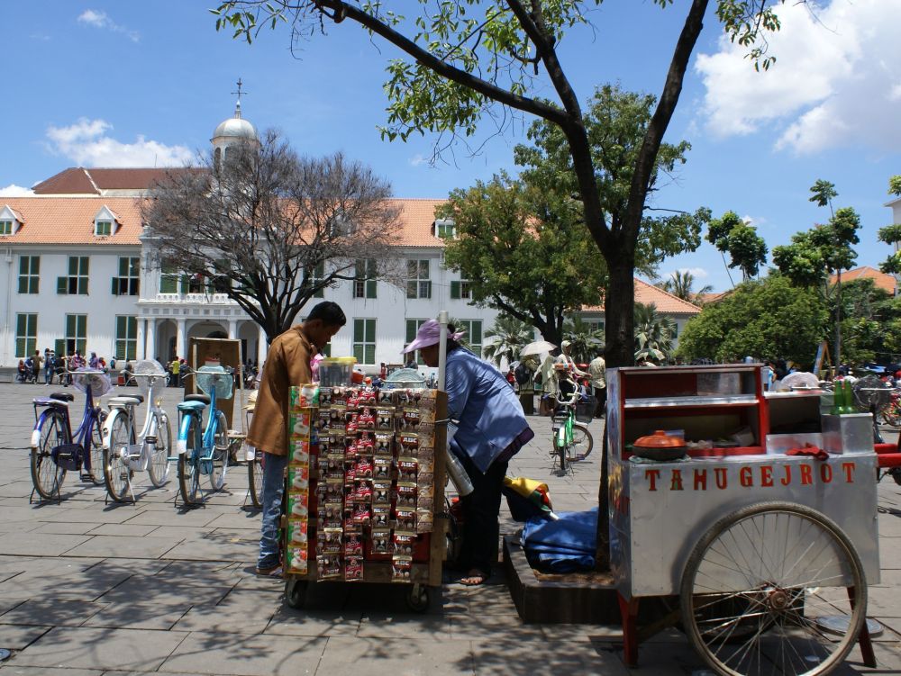 Ved opførelsen af tårnet regnede man nok ikke med at det blev et tilløbsstykke for både udenlandske og især indonesiske turister, for man valgte kun at bygge én elevator til toppen – hvilke medførte en uoverskuelig lang kø. Mig om mit Harem! Et godt eksempel på at der ikke kommer så mange “hvide mennesker” til Jakarta. En flok lokale piger på udflugt synes i hvert fald jeg var meget interessant og ville gerne alle have taget et billede – så jeg bad min lokale guide gøre det samme. Et slagskud fra Monas ligger Sydøstasiens største moské Istiqlal med plads til 120.000 bedende! Det blev også til et hurtigt visit i Jakartas enorme havn.Havnen har mere end 18.000 officielle ansatte – dertil kommer alle dem der lever og bor i området.I Oud Batavia ligger det gamle rådhus.På pladsen foran rådhuset var der et herligt liv med dragesælgere og folk på tandemcykler. Herligt at opleve en masse lokale som er ude og nyde deres søndag! Det er ikke unormalt at man finder en liste med priser på et hotelværelses inventar! Men det er en kreativ hoteldirektør der forsøger at sælger samtlige inventarer som souvenirs… Jeg købte nu hverken håndklæder, askebære eller fjernbetjeningen med hjem som gave/souvenir!