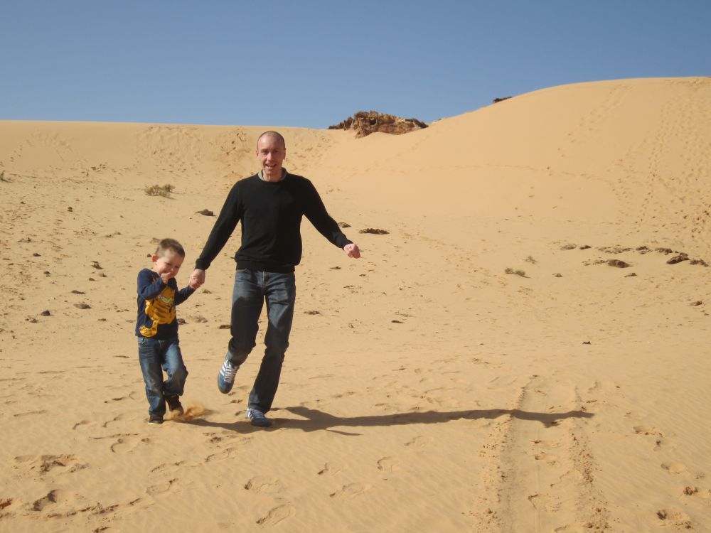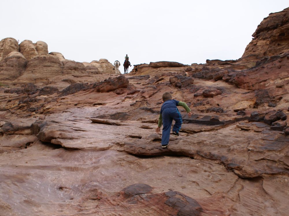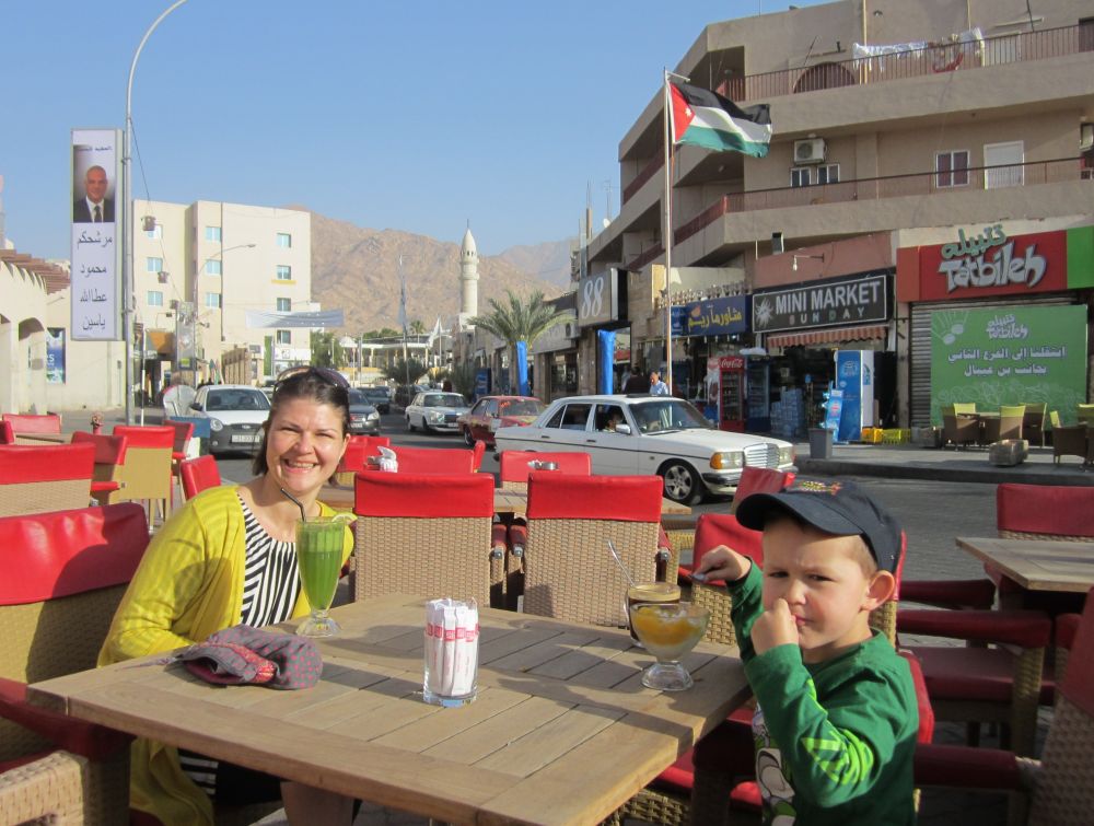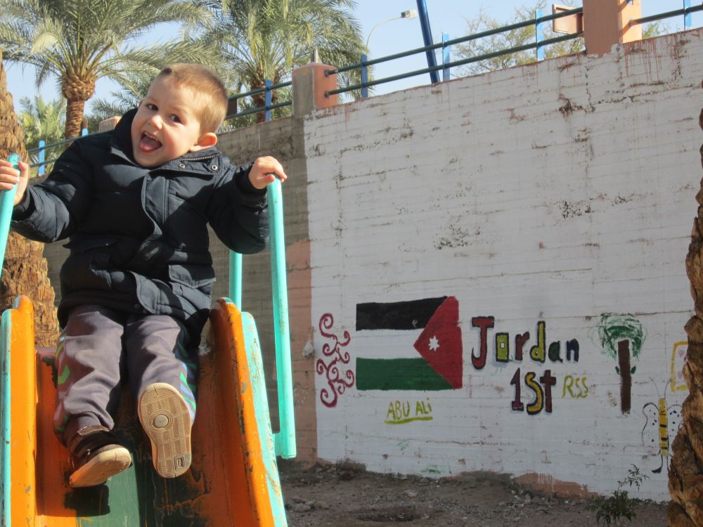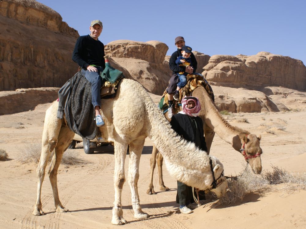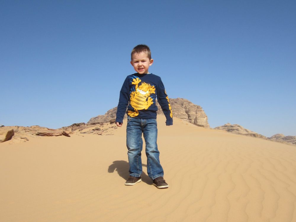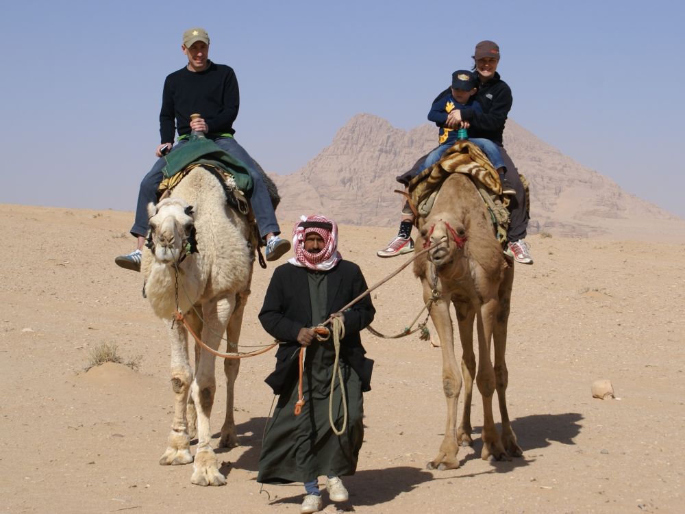 Wadi er arabisk for en valley/dal. Wad Rum kaldes også for “The Valley of the Moon”.Blot 45 minutters kørsel fra Aqaba og du er fremme i dette ørkenlandskab fra en anden planet. Det var sjovere at løbe ned af sandbakkerne end at gå op ad dem.. Wadi Rum er hjemsted for Zalabia Beduinerne som efterhånden har fundet ud af at lave en god skilling på de flere og flere turister der lægger vejen forbi. Så der gik ikke lang tid før familien Toft-Olsen sad på ryggen af to kamler. En kort tur i fine og om ikke andet meget autentiske omgivelser. Mit favorit-ferie-billede fra Jordan. Meget af filmen Lawrence of Arabia fra 1962 er filmet i Wadi Rum. Ture til Wadi Rum kan være alt fra endagsture (som vores) til overnatninger i beduin camps. Heste og især Camelsafari er populært – ligesom rock-climbing og hiking ture er muligt. Men de fleste kommer for at opleve solnedgangen i dette betagende landskab – noget som vi må have til gode til en anden gang. Tilbage i Aqaba var de lokale i gang med at male en mur i den centrale del af byen. Ebbe-Emil fik lov til at deltage i løjerne og malede blade på træet.Kamler og heste er langt fra et særsyn på fortovene i Aqaba, og man skal lige passe på med hvor man træder med sine klip-klappere.. Tid til en eftermiddags-is/drink/kaffe på det lokale torv…..inden vi kunne tage endnu en tur i poolen.