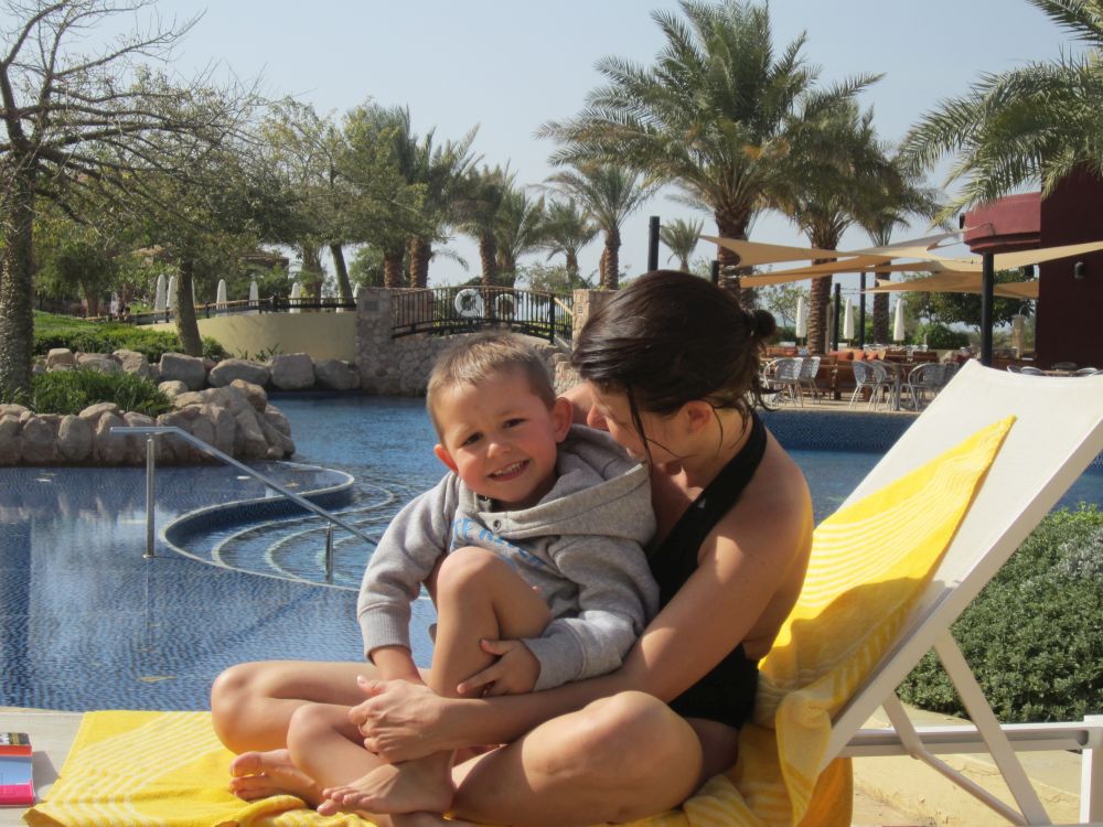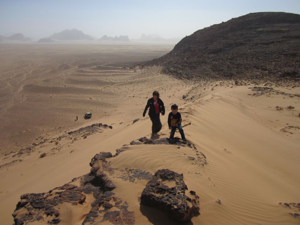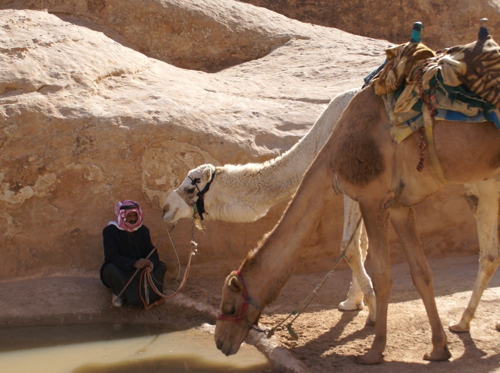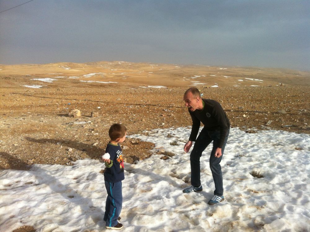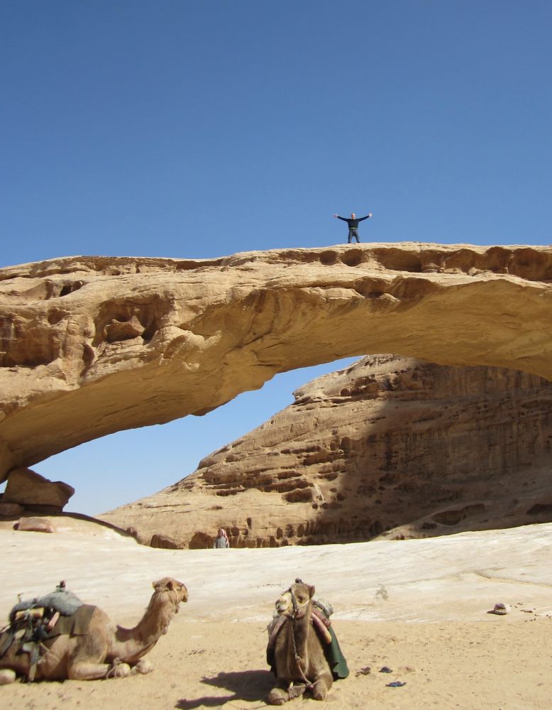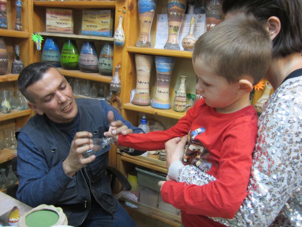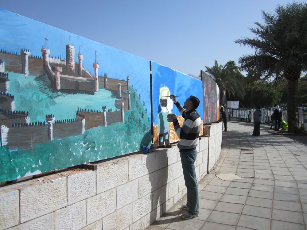 Wadi er arabisk for en valley/dal. Wad Rum kaldes også for “The Valley of the Moon”.Blot 45 minutters kørsel fra Aqaba og du er fremme i dette ørkenlandskab fra en anden planet. Det var sjovere at løbe ned af sandbakkerne end at gå op ad dem.. Wadi Rum er hjemsted for Zalabia Beduinerne som efterhånden har fundet ud af at lave en god skilling på de flere og flere turister der lægger vejen forbi. Så der gik ikke lang tid før familien Toft-Olsen sad på ryggen af to kamler. En kort tur i fine og om ikke andet meget autentiske omgivelser. Mit favorit-ferie-billede fra Jordan. Meget af filmen Lawrence of Arabia fra 1962 er filmet i Wadi Rum. Ture til Wadi Rum kan være alt fra endagsture (som vores) til overnatninger i beduin camps. Heste og især Camelsafari er populært – ligesom rock-climbing og hiking ture er muligt. Men de fleste kommer for at opleve solnedgangen i dette betagende landskab – noget som vi må have til gode til en anden gang. Tilbage i Aqaba var de lokale i gang med at male en mur i den centrale del af byen. Ebbe-Emil fik lov til at deltage i løjerne og malede blade på træet.Kamler og heste er langt fra et særsyn på fortovene i Aqaba, og man skal lige passe på med hvor man træder med sine klip-klappere.. Tid til en eftermiddags-is/drink/kaffe på det lokale torv…..inden vi kunne tage endnu en tur i poolen.