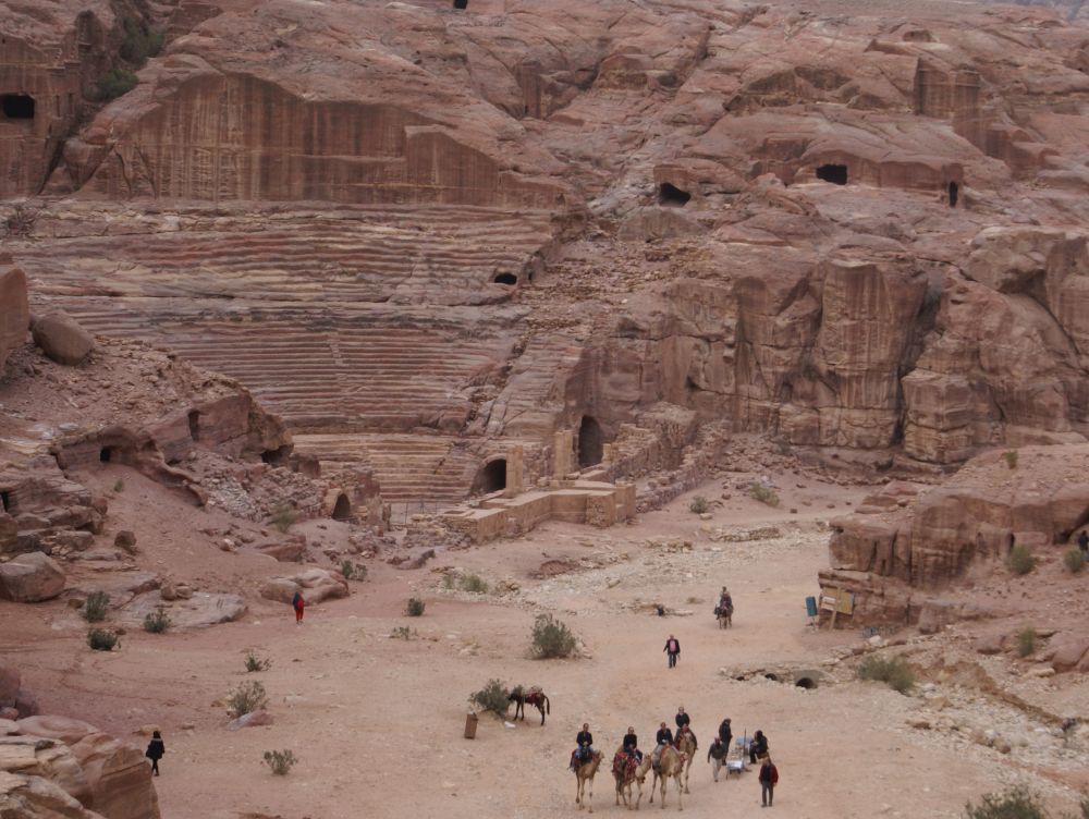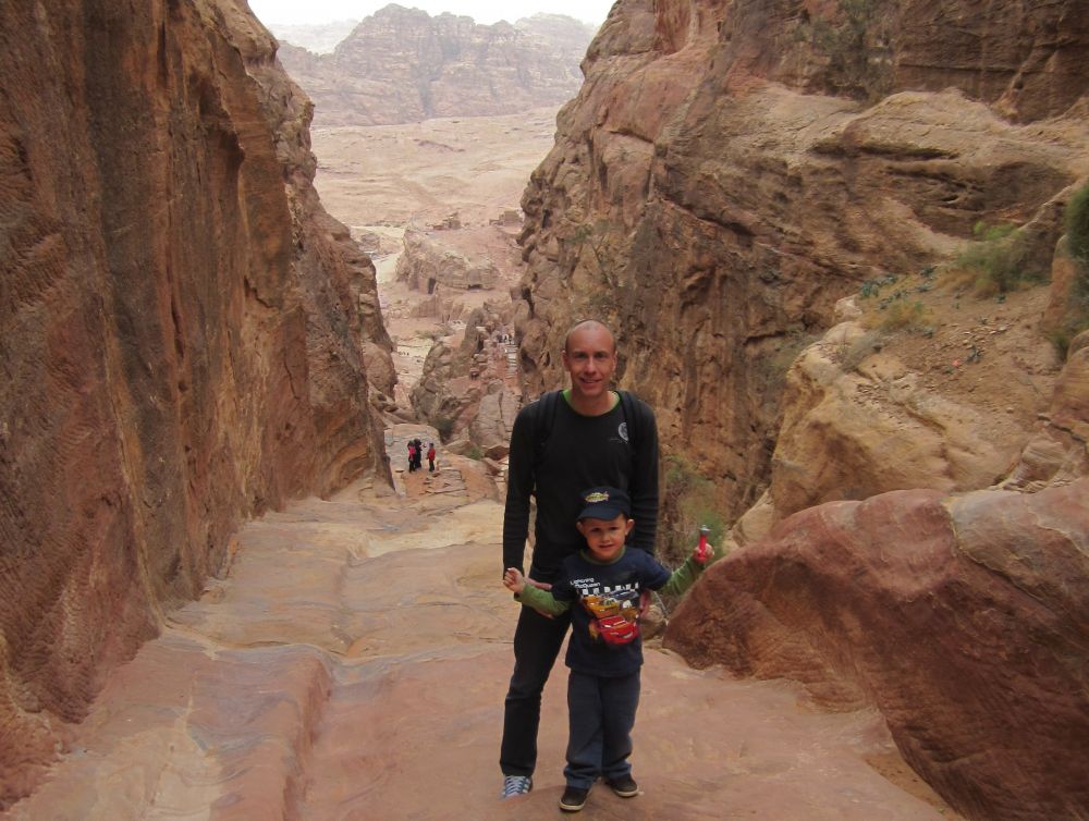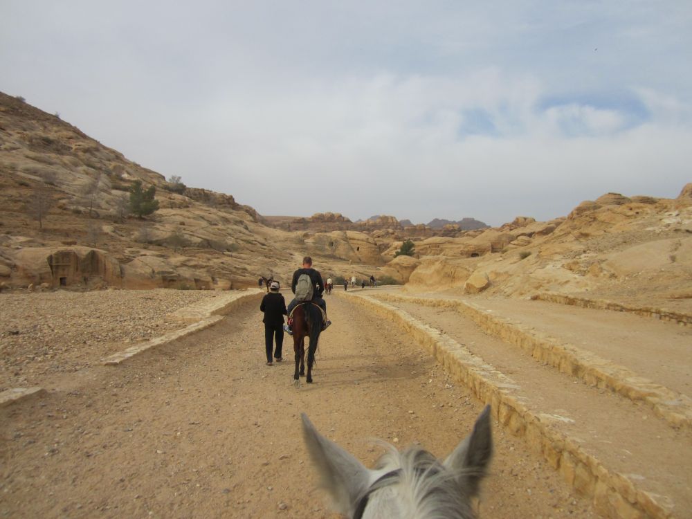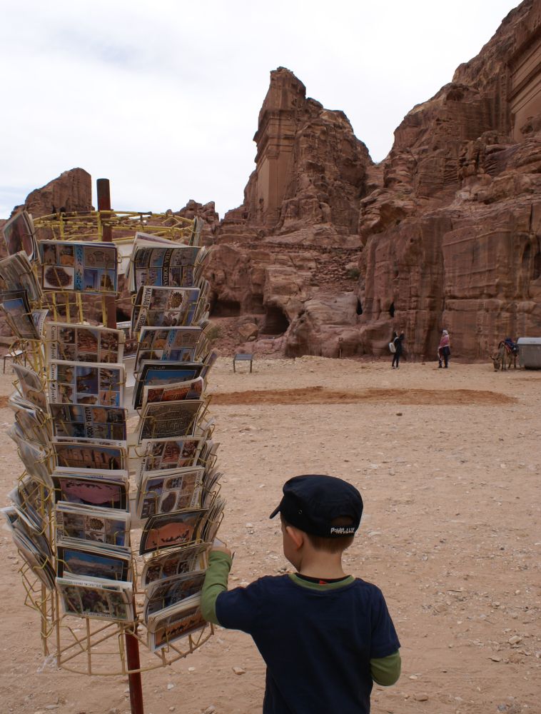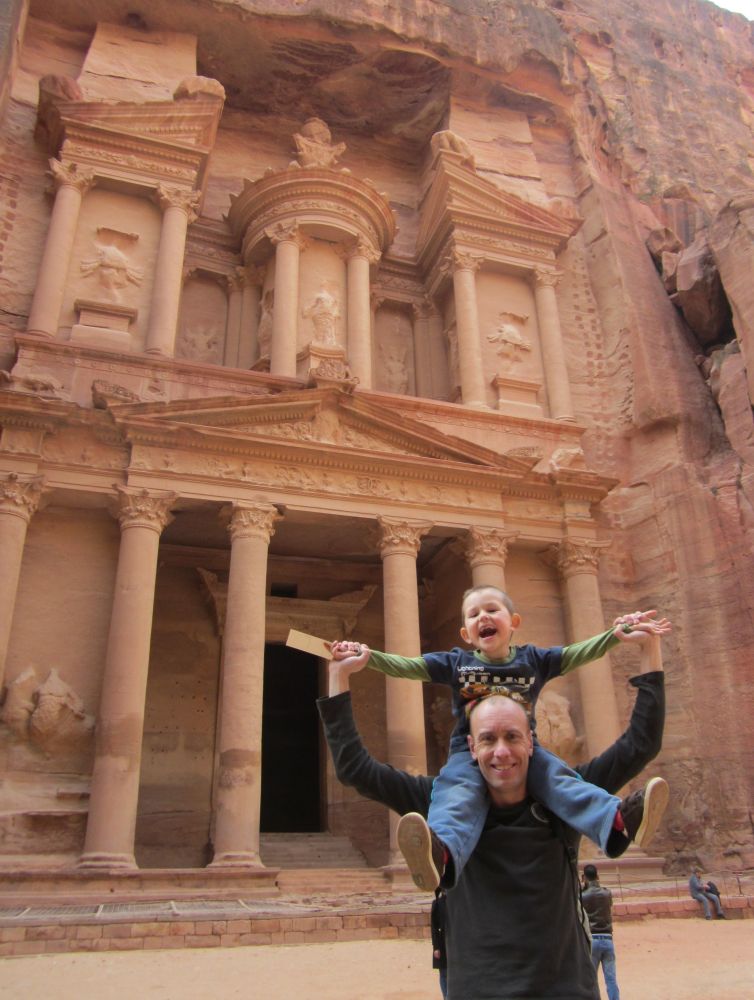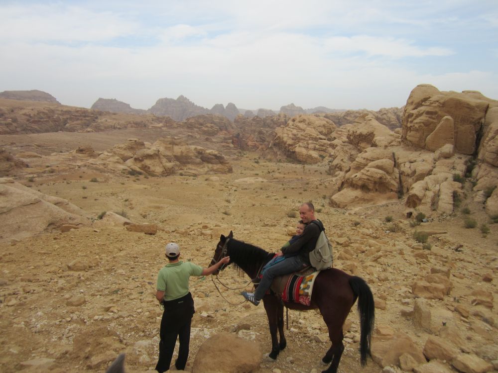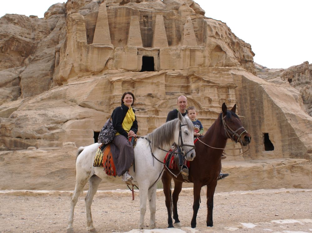 Det tager ca. 2 timer at køre fra Aqaba til Petra – og undervejs passere man et bjergpas hvor der (her i januar) var mulighed for en rask sneboldkamp.Fra ”billetkontoret” til selve skattekammeret er der 4 km at gå. Så de lokale har naturligvis set en god forretning i at tage dumme turister dertil på hest. Vi var ikke bedre end andre dumme turister så vi hoppe op på ryggen af to heste.Vi blev dog hurtig overtalt til at tage den ”store tur” op i bjergene og rundt om byen hvorfra vi så ville kunne skue ud over byen og landskabet – skulle så selv gå tilbage. Det kom vi ikke til at fortryde.Her gør vores hest et velfortjent stop mens Ebbe-Emil og jeg nyder den fantastiske udsigt.Prinsessen på den hvide hest!Går alt andet galt for Ebbe-Emil kan han altid blive ”jokes-skriver” for Linie 3. En dag vi sad og snakkede om at der ikke var noget græs i Jordan – kun sand og jord, svarede Ebbe-Emil: ”det er jo derfor det hedder Jord(d)an.. ØØhh doh! Anders Bircow har ringet – han er vild med dine jokes..Petra (græsk for klippe/sten) blev bygget af nabataeaerne, et arabisk folk, der bosatte sig her.I Petras storhedstid, omkring starten på vores tidsregning, har der boet op til 20.000 personer i byen.Takket være byens ret så utilgængelige beliggenhed midt i den jordanske ørken, og det faktum, at indbyggerne var i stand til at opsamle den smule regnvand der kom og dermed blev selvforsynende med vand, kom Petra i til at fungere som en fæstning. Derfor kunne nabataeaerne kunne tilbyde, frisk drikkevand og et sikkert sted at overnatte til de handlende karavaner, som rejste forbi byen med silke, krydderier og andre værdifulde varer fra Kina, og Indien på vej til Egypten, Grækenland og Rom.Romerne opnåede dog kontrol over byen, og Petras betydning mindskedes, da handlen gik over Syrien. I 300-tallet blev byen ramt af et jordskælv. Senere erobrede muslimske arabere byen og den blev hårdt plyndret. Petra var beboet helt frem til 1100-tallet, hvor det første kristne korstog nåede området.Herefter forsvandt Petra fra den vestlige verdens radar, indtil en schweiziske forsker ankom 1812. Da var byen strengt bevogtet af lokalbefolkningen, der betragtede den som et helligt sted – her lå en profet begravet. Hr. Burckhardt (schweiziske forsker hed) kom til Petra i 1812, blev han derfor nægtet adgang. Men historienfortæller at han klædte sig ud som pilgrim og påstod, at han var kommet hele vejen fra Indien for at bede ved profetens grav. Vagterne gav sig, og Hr Burckhardt blev således den første vesterlænding, der i mange hundred år fik adgang til Petra!De fleste turister kommer til Petra via denne spektakulære rute gennem Wadi as-Sik – en smal og 2 km lang kløft, hvor man er omgivet af klipper, som strækker sig op mod himlen på begge sider. Kommer man ind denne vej fra er det denne facade, hugget direkte ud af bjerget, der møder en. Det såkaldte skattekammer! Jeg undrede mig over at man sætter en dværg-soldat til at vogte foran selve skattekammeret!!Men på trods af sit navn har det formentlig ikke huset nogen skat. Det er mere sandsynligt, at det har været en kongegrav.. mener historikere.Petra blev for alvor kendt i den brede befolkning da man i 1989 indspillede slutscenerne til ”Indiana Jones og det sidste korstog”.Da der blev lidt knas/støj på vores oprindelige værelse, tilbød hotellet at vi kunne skifte til en af deres suiter med denne udsigt ud over Rødehavet – det sagde vi Ja Tak til..Meget børnevenligt toilet på hotellet med en “håndvask” i børnehøjde lige ved siden af toilettet…Ca. 15 km syd fra Aqaba-by ligger Talay Bay som er et stykke lækker strand med tilhørende resorts.Vi boede på Môvenpick inde i byen, men de har også dette resort i Talay Bay. Der kørte shuttlebusser mellem de to hoteller og man kunne fit benytte dem begge.Den nok mest populære souvenir at slæbe med hjem fra Jordan er disse glaskrukker, hvor de fylder dem med sand i forskellige farver og får lavet nogle imponerende motiver.Ebbe-Emil fik lavet en fin krukke til sin kæreste Isabaella (samt en til sig selv!). Ebbe-Emil med kamaraet.. Kunst, talent eller ?? Servicen i Jordan var fremragende.. med gratis kort, og uanede hjælp fra det venlige turistpoliti.
