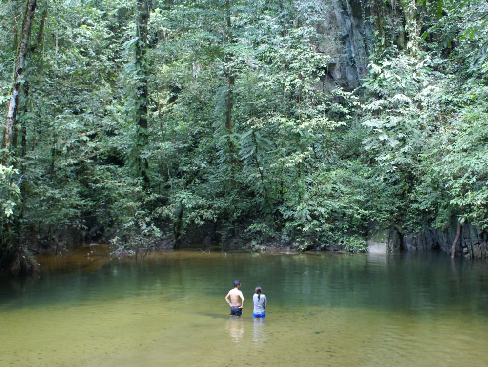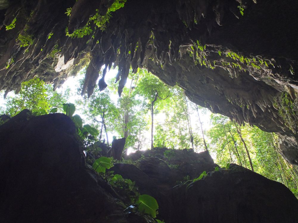 En flyvetur ind over regnskoven tog os til Mulu National Park. Der er ingen rigtig vej ind til nationalparken, så hvis man ikke har lyst eller råd til at flyve, så kan man sejle derind fra Miri i en longtail boat på ca. 10 timer… Vi indkvarterede os på Royal Mulu Resort som ligger midt i junglen ud til floden – luksusudgaven og et alternativ til parkens egne mere ”spartanske” indkvarteringsmuligheder. Mulu er mere kendt for deres huler og grotter og ikke mindst de specielle klippeformationer The Pinnacles, end for dyrelivet. Jeg havde ærlig talt ikke sååå store forventninger til Mulu da jeg mente jeg havde set nok drybstenshuler til at det stadig kunne imponere mig.. Men jeg tog fejl!Det var fantastisk at vandre gennem junglen til de forskellige grotter der alle havde deres unikke særpræg. Disse tråde er levende ”dyr”, en slags orme der hænger ned fra loftet og lever af de insekter de fanger med deres klistrede tråde. I Deer Cave finder man bl.a. dette naturskabte portræt af Lincoln!Næste dag tog vi båden op ad floden for at besøge en landsby samt endnu et par grotter.Her besøger vi en Penan-families foran deres pælehus. Ejeren af dette hus viste os stolt indenfor så vi kunne se hans nyeste TV, byens nyeste og flotteste! – det gjorde så mindre i hans øjne at det var det eneste møbel han ejede.. Clearwater Cave imponerede med sin enorme størrelse…Men navnet Clearwater Cave kommer fra dette romantiske spot hvor der var mulighed for en frisk dukkert i det klare vand. Mon dette lokale par havde håbet på lidt alenetid..?Sidst på eftermiddagen tog vi tilbage til Dear Cave for at opleve dette fantastiske fænomen hvor millioner af flagermus hver eftermiddag flyver ud af hulen for at fange aftensmaden. Det skønnes at der bor omkring 2 millioner flagermus i hulen og at ca. 500.000 hver eneste eftermiddag flyver ud. Det ligner en sort røgsky der flyver ud af hulen og som bare bliver ved og ved. Som sagt er det ikke for at opleve dyrene man tager til Mulu – men dette var en top-oplevelse at overvære. Udover selve oplevelsen havde det også den bonus at der ikke var mange myg i området da få insekter får lov til at leve længe med så stor en hær af flagermus i området.