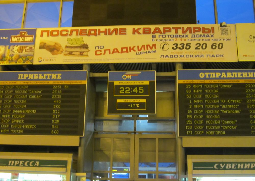 Under vores ophold i Skt Petersborg var dette fine russiske flodkrydstogtsskib vores hjem. Da selv ikke min (ellers ihærdige) kollega kunne få pisket en stemning i vejret på skibets bar… .. tog vi metroen ind til byen. Metroen blev indviet i 1955 og transporterer ca. 2,5 millioner mennesker om dagen, hvilket gør den til verdens 12. mest travle metro i verden. Nevskij Prospekt er hovedgaden i St. Petersburg. Den er 25 meter bred og fire kilometer lang og blev planlagt af Peter den Store som starten på en vej mellem Novgorod og Moskva. Gaden er en af Ruslands mest kendte gader med flot arkitektur på mange af bygningerne og (i dag) med masser af butikker og caféer.Opstandelseskirken, med de karakteristiske løgkupler er en af byens største turistattraktioner, og ligger ikke langt fra hovedgaden Nevskij Prospekt. Katedralen kaldes også Blodskirken, efter Alexander 2. af Rusland blev myrdet på denne plads i 1881. Kirken blev senere bygget til hans ære og stod færdig i 1907. Vinterpaladset, hvor de forhenværende zarer residerede, huser nu museet Eremitagen, der ejer en af verdens største kunstsamlinger.Vi ramte byen på en rigtig varm dag, så en kold øl på en fortovscafé var helt på sin plads.Isak-katedralen var Skt. Petersborgs domkirke frem til 1937, hvor katedralen blev lukket for gudstjenester, og i stedet blev anvendt som museum. Efter Gorbatjovs perestrojka blev det igen tilladt at holde gudstjenester – men i dag sker det kun ved særlige lejligheder. Bonusinfo: Isak-katedralen er i øvrigt verdens 4. største ”kuppelkirke” efter Peterskirken i Rom, Saint Paul’s Cathedral i London og Santa Maria del Fiore i Firenze. Kanalrundfart er en god og afslappende måde at opleve byen. Der er masser af broer man skal under og per automatik bukker alle sig selvom de færreste måler 2,4 meter. (måske det er godt at være på den sikre side, for jeg tvivler på at de udskifter skiltene alt efter vandstanden i kanalerne..?). Efter Sovjetunionens sammenbrud udskrev bystyret i Leningrad en folkeafstemning om, hvorvidt byen skulle have sit gamle navn tilbage. 54% stemte for, og i 1991 fik byen således sit gamle navn Sankt Petersborg tilbage. Omkring midnat fandt vi til togstationen for at tage nattoget til hovedstaden Moskva. Der er ikke mange engelske skilte eller navne der kan hjælpe en på vej.Efter en kop kaffe og dagens (russiske) avis, var det tid til at gå til køjs i voresliggekupé.