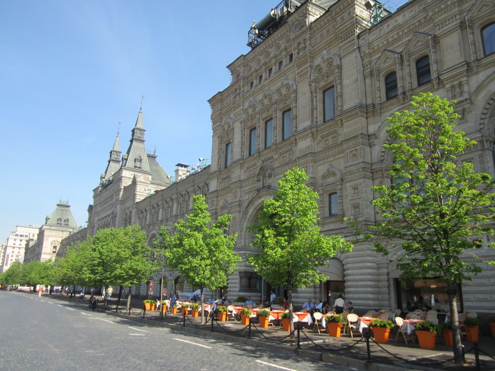 Overfor Lenins mausoleum ligger GUM. GUM er en forkortelse for hvad på dansk ville blive til “statsligt varehus”. Den nuværende bygning er mere end 100 år gammel. I 1953 gennemgik bygningen en omfattende renovering, og siden Sovjetunionens kollaps, blev GUM privatiseret og i dag rummer det alle de eksklusive mærker/forretninger der har råd til at betale huslejen.