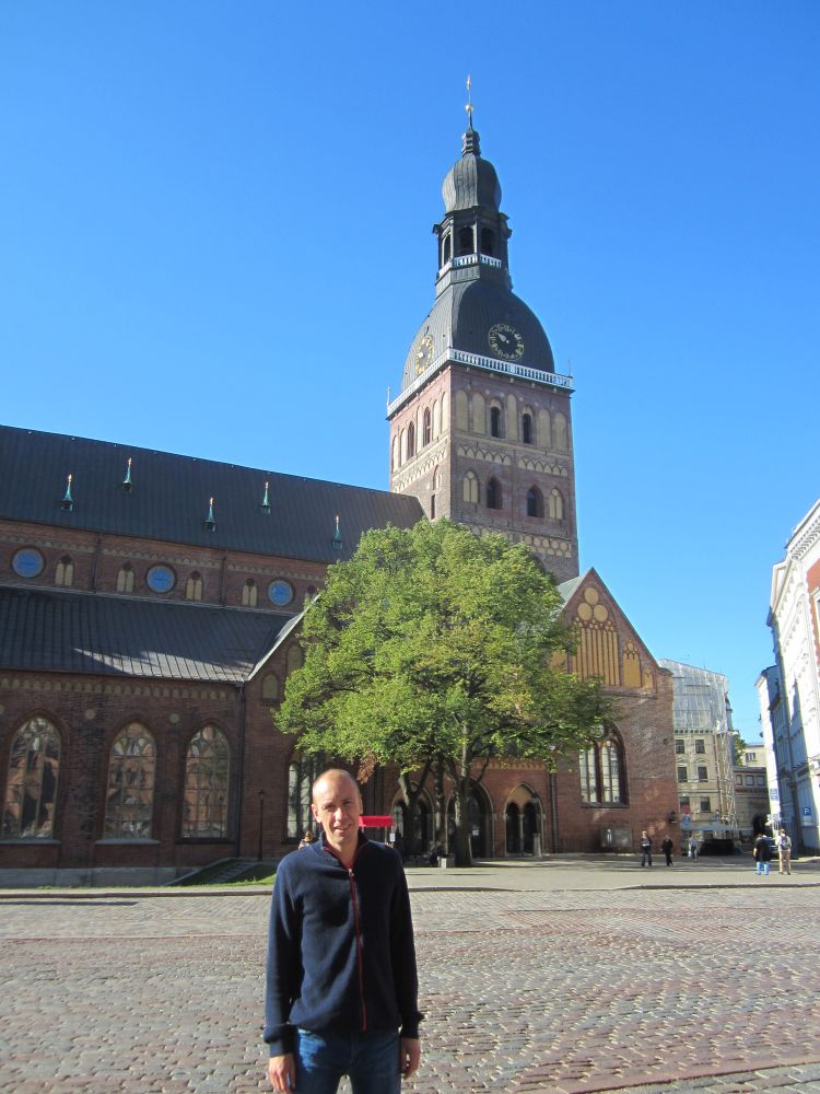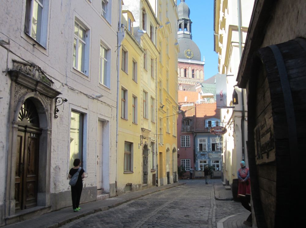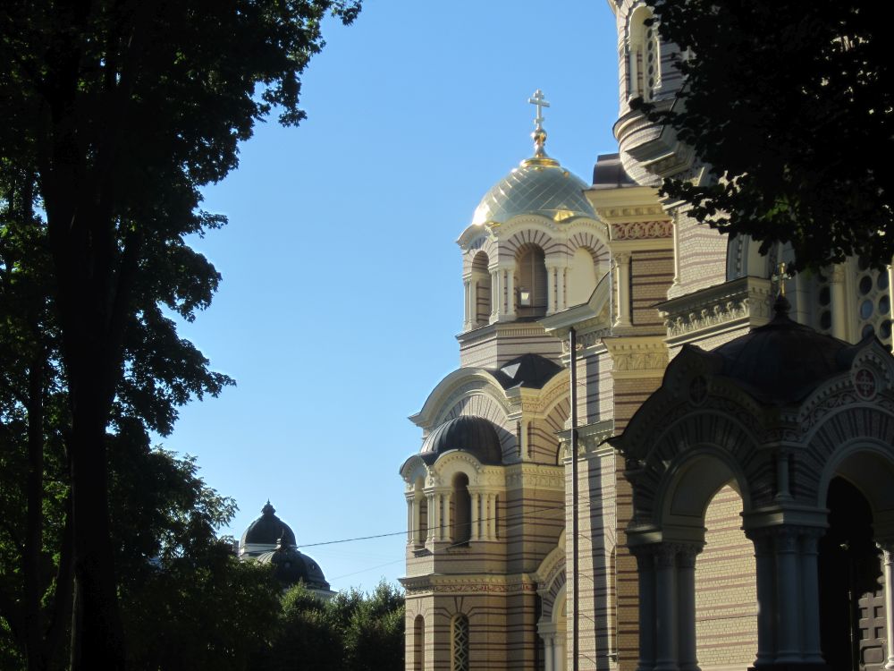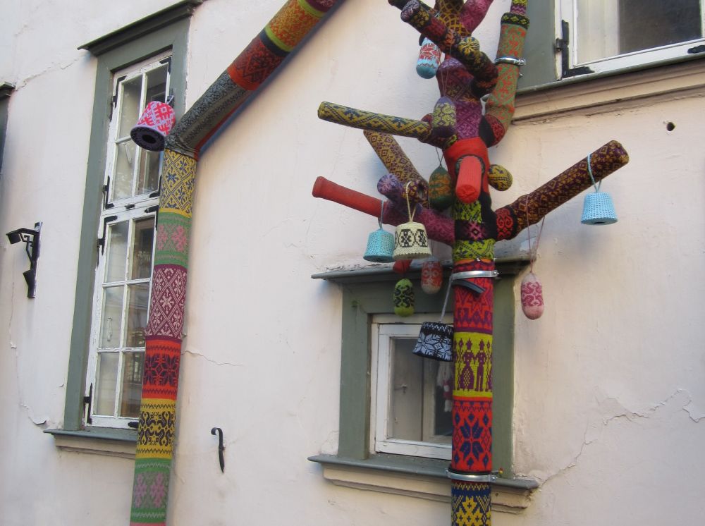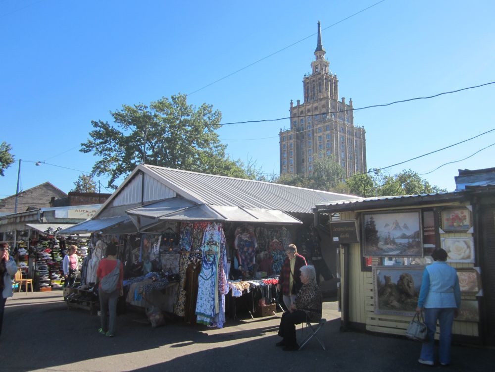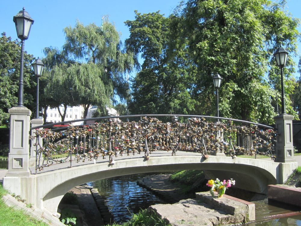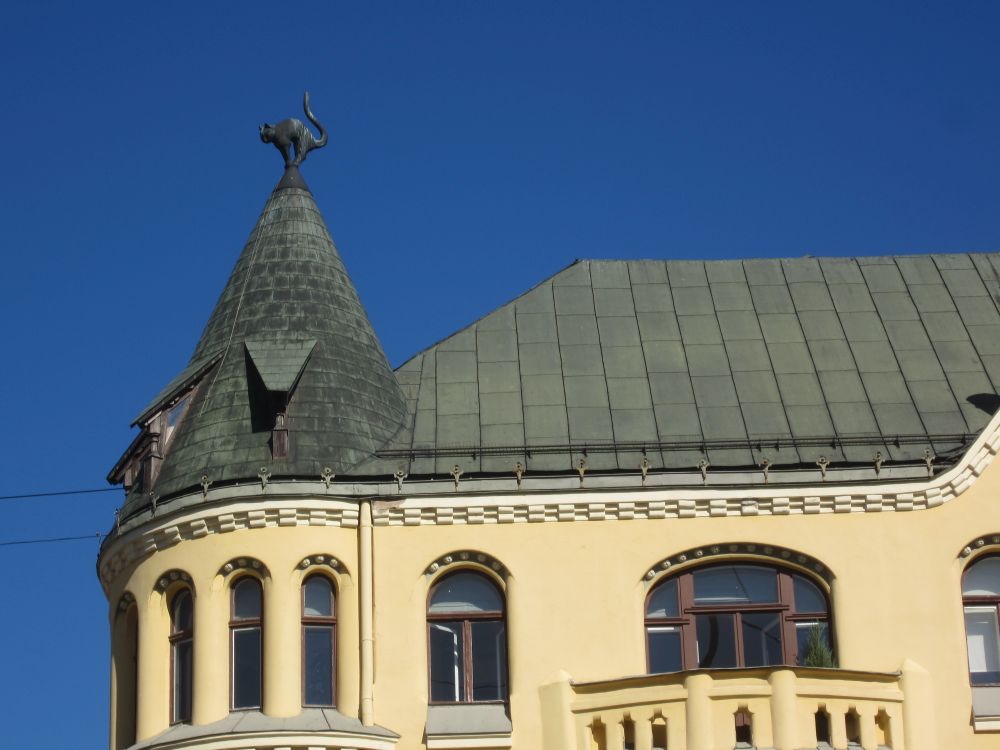 Lige ved siden af vores hotel lå denne russisk-ortodokse kirke, som under den russiske besættelse blev brugt som planetarium!Til forskel fra Tallin og Vilnius har Riga har en række flotte parker. En af de mest kendte er Bastejkalnsparken ved frihedsmonumentet og som sammen med Riga Kanal, omslutter den gamle bydel.Et fænomen der findes i flere og flere byer rundt omkring i verdenen. Her i Riga hænger kærestepar hængelåse fast til denne bro. På låsen skriver man typisk ens navne, dato og nogle kærlige ord, og så kaster man sammen nøglen i vandet – en handling der skal symbolisere evig kærlighed.Riga består af tre hoveddele: Den gamle bydel, centrum på østbredden og Pardaugava på vestbredden. Forstæderne er domineret af brede gader og boligblokke fra sovjettiden, men i den gamle bydel ligger mange kirker og bygninger fra middelalderen – og fra et turistmæssigt synspunkt er det der ens tid skal prioriteres. En lokal kunstner havde pyntet nedløbsrørene foran butikken med disse farverige broderier. I forlængelsen af togstationen ligger et stort marked, hvor der i det indendørs marked mest handles med dagligdagsvare.. .. og hvor det udenfor minder mere om et loppemarked. I baggrunden ses en typisk ”Stalin-skyskraber” fra sovjettiden som i dag fungerer som Letlands Videnskabsakademi… … og fra toppen har men denne smukke udsigt (og baggrund). Vi erfarede at Kattehuset åbenbart er ”must see” når man er i Riga….. så her får i godnathistorie nummer 1 fra Riga: ”Kattelegenden”