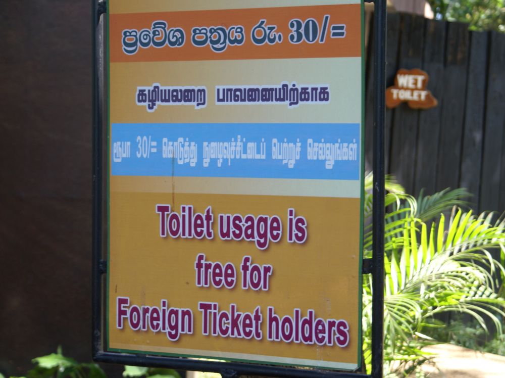 Første stop var ved elefantbørnehjemmet Pinnawala Elephant Orphanage. Børnehjemmet blev oprettet i 1975 for at hjælpe sårede og forældreløse vilde elefanter.Som turist kan man få lov til at se elefanterne vandre gennem den lille by ned til Ma Oyua-floden hvor de bader to gange om dagen.Pinnawalla er det sted i verden med flest elefanter i ”fangeskab”. I 2011 var der 88 elefanter fordelt over 3 generationer.Pinnawala har udviklet sig til et af Sri Lankas mest populære udflugtsmål, hvilket i mine øjne ikke længere gør stedet interessant at besøge. Og hvad der er endnu mere ærgerligt så er jeg bange for at grundidéen bag stedet glemmes i takt med at turisterne og entréindtægterne stiger og stiger. Der var ikke ét skilt eller én person der prøvede at forklare os lidt om hvad stedet gik ud på, og hvordan man arbejder med elefanterne. Til gengæld var de ansatte meget interesseret i at sælge os bananer som vi kunne fodre dyrene med og ”sælge os” os gode fotomuligheder med (baby)elefanterne.. Så det var med en blandet følelse at vi forlod stedet.Kan et gratis toiletbesøg forsvare at man som “foreign” skal betale over 100 gange så meget i entré ved Pinnawala i forhold til Srilankanere? Efter at have besøgt det pågældende toilet må svaret være NEJ!Gadebillede fra den lille butiksgade i Pinnawala.