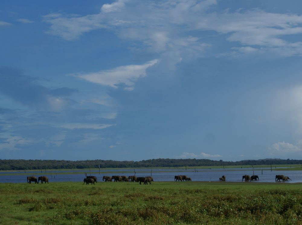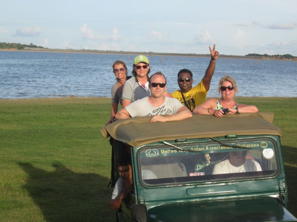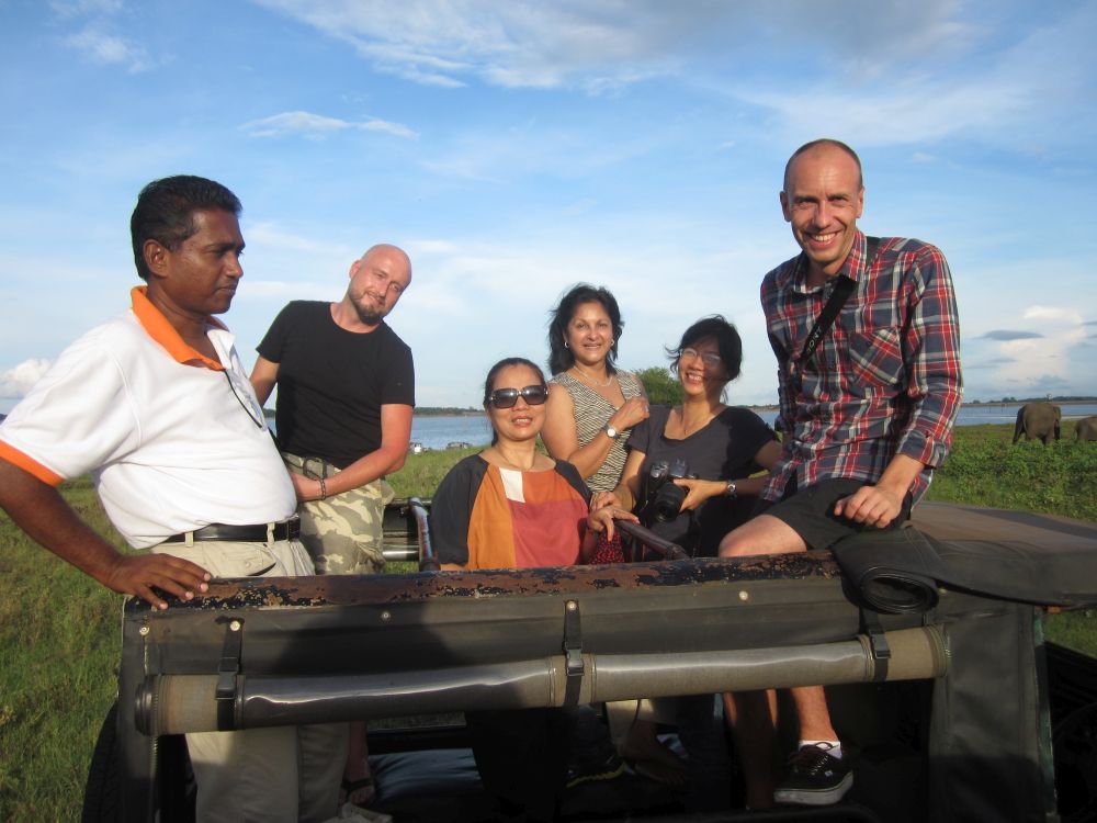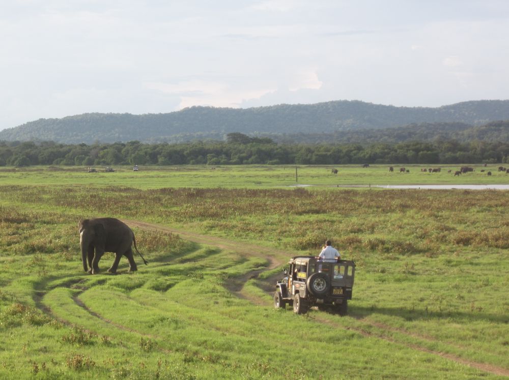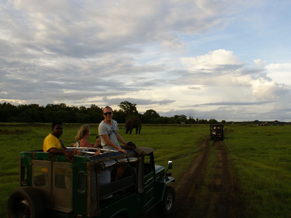 Kaudulla National Park ligger ikke lagt fra Dambulla og er primært kendt for deres mange vilde elefanter. Safarien her foregår i disse jeeps hvor man får den mest komfortable tur ved at stå op på sæderne og stikke hovedet op igennem hullet i taget (hvis man husker at holde øje med grene og buske..!!!).Kaudulla NP er forbundet med Minneriya NP og elefanterne bevæger sig frit mellem de to alt efter hvor maden og især drikkevandet er mest. En broget flok i vores jeep, en lokal ”spotter”, en nordmand, to vietnamesiske piger, en svensk dame og en ung dansker.Den anden jeep var en ren nordisk jeep (bortset fra vores lokale guider mm.). Som skrevet før så kommer man til Kaudulla og Minneriya for at se elefanter. Selvom de praler af 24 forskelle pattedyr, 25 krybdyr og 160 slags fugle, så så vi ingen andre dyr på vores eftermiddagssafari end elefanter og en påfugl! Til gengæld så vi mange elefanter – mere end 200 stk. vil jeg tro, og det er sjovt at iagttage alle de mange ting der foregår når så mange elefanter er samlet inden for et relativt lille område.En dejlig dag i dejlige omgivelser er ved at være slut.