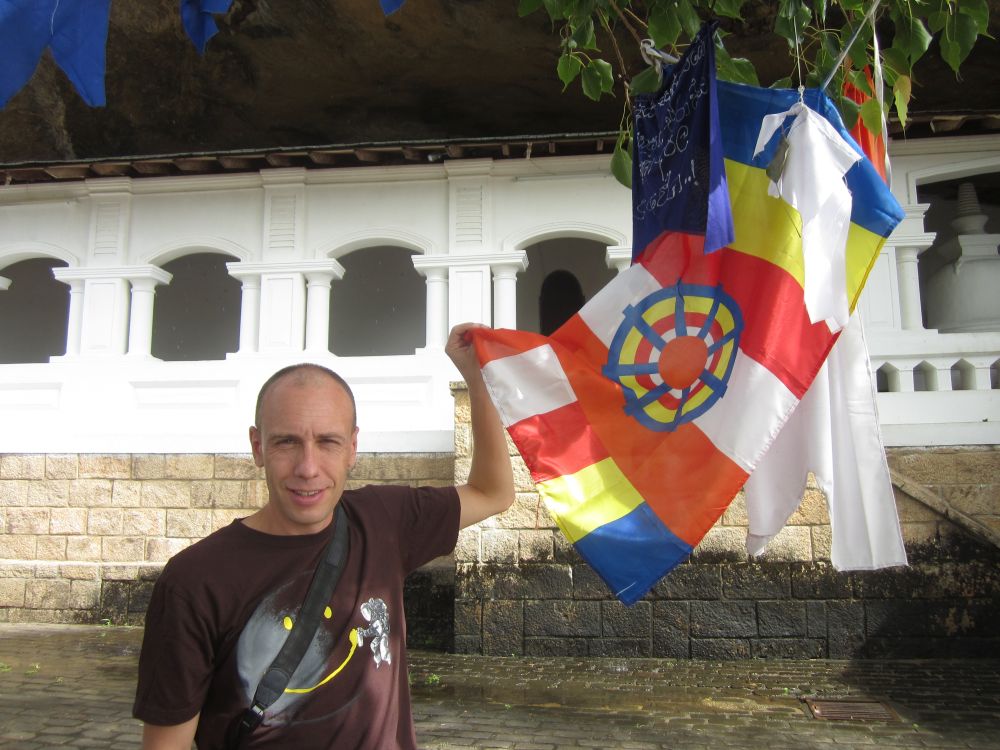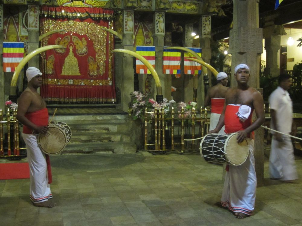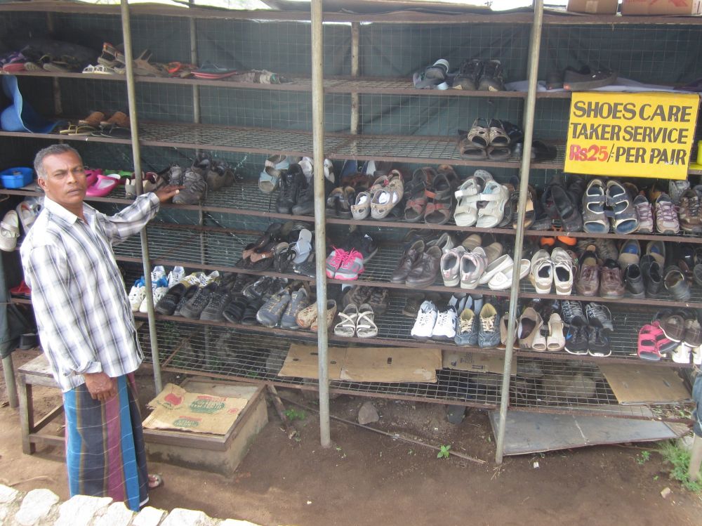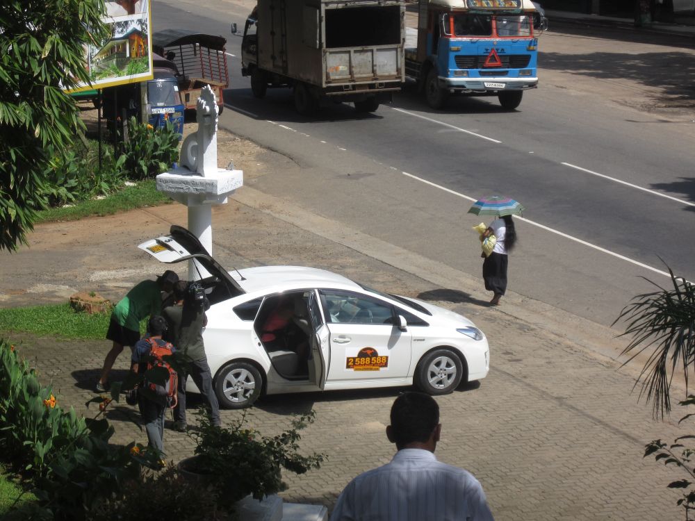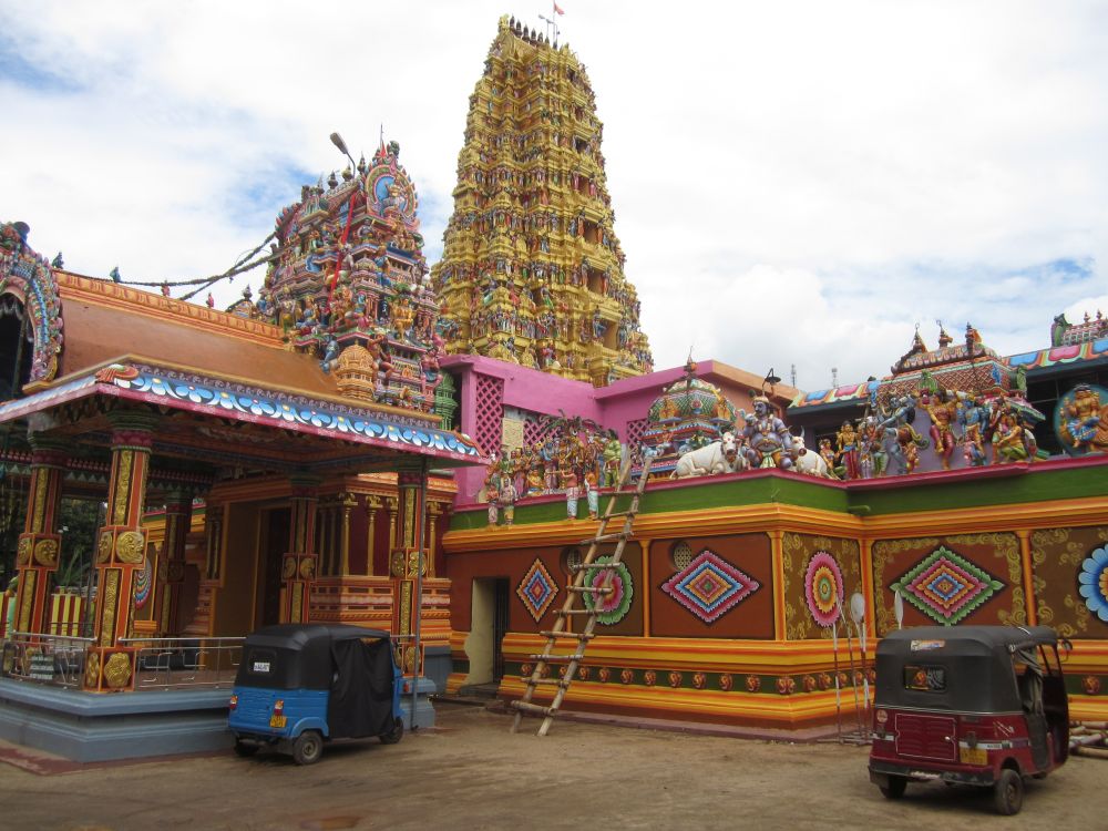 Dambulla Cave Temple kaldes også The Golden Temple og er Sri Lankas bedst bevaret såkaldte ”Cave Tempel”. Templet har siden 1991 været et UNESCO World Heritage Site.Selve templet ligger på toppen af en 160 meter høj klippe med en flot udsigt ud over området. Her nyder en af de lokale banditter udsigten.Det er strengt forbudt at bære sko inde i tempelområdet – men for ca. 1 krone passer denne mand godt på dine sko. Og det giver dig muligheden for at se hvad der rører sig på sokke-mode-fronten i Japan.. Templet består af 5 huler der alle indeholder forskellige Buddha-statuer og malerier.Mine 3 ”partners in crime” klar til at gå på foto-opdagelse i hulerne. Buddha-figurerne varierer i størrelser og positioner – den største er 15 meter lang. En anden hule rummer mere end 1500 malerier af Buddha. Grottens historie kan dateres helt tilbage til det første århundrede før vor tidsregning, hvor kong Valagam Bahu søgte tilflugt her efter at være blevet fordrevet fra byen Anuradhapura af invaderende styrker.De templer der stadig bliver brugt af de lokale tilbedere giver altid en mere autentisk stemning, og er derfor mere spændende at besøge – synes jeg! Cykelsmeden i Dambulla har rykket værkstedet ud på fortovet.På vejen mellem Dambulla og Kandy passerer man dette hindu-tempel.