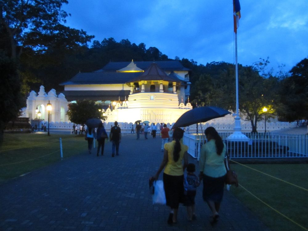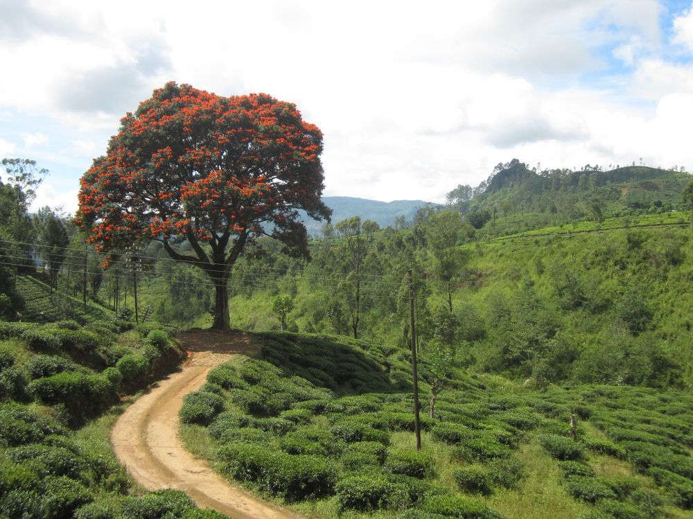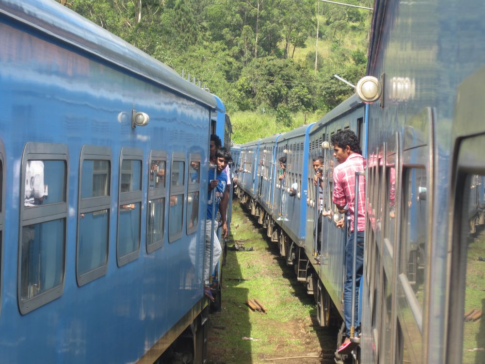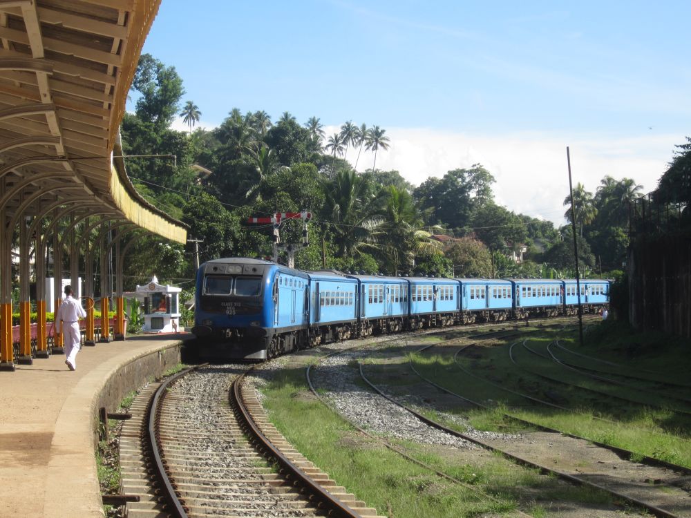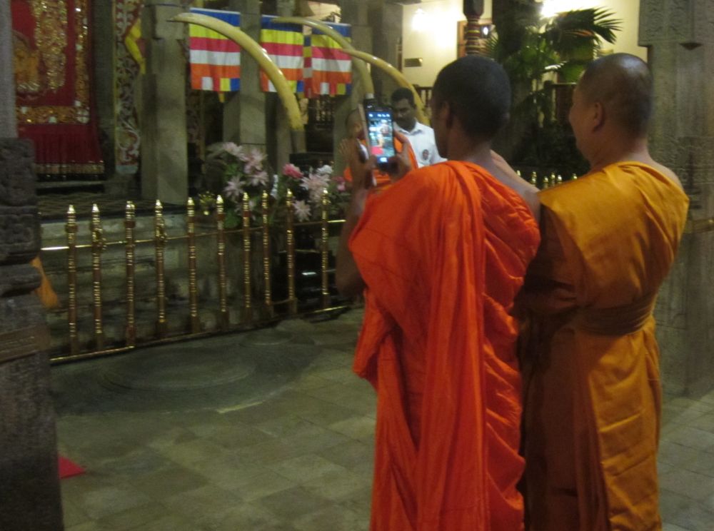 Et gadebillede fra byen Kandy, som jeg faktisk var en smule skuffet over.Vi lagde vejen forbi byens Botaniske have, normalt besøger jeg kun sådan et sted hvis der ikke er andet at se i en by.. .. men når det er sagt så var den Botaniske Have i Kandy faktisk et besøg værd og et dejligt grønt og fredeligt åndehul i en travl by. Et andet ”must see” i Kandy er Dalada Maligawa, Tandens Tempel. Det siges at Buddhas øvre venstre hjørnetand er opbevaret her i templet! Ifølge myten blev tanden smuglet til Sri Lanka i en prinsesses hår og bragt til Anuradhapura. Af frygt for indiske plyndringstogter bragte de singhalesiske konger den til det royale palads for at få den opbevaret i sikkerhed… Tilstrømningen af pilgrimme kulminerer i juli-august, hvor en kopi af relikvieskrinet føres frem på ryggen af en rigt udsmykket elefant, det skulle efter sigende være et ret flot optog.Buddhister på Sri Lanka er af den overbevisning, at de mindst en gang i deres liv skal på en pilgrimstur til dette sted. Her foreviger et par munke deres oplevelse med deres smart phones.Udsigten fra vores hotel i Kandy på en tidlig morgen. Desværre tjekkede vi ind kl. 21. om aftenen og forlod allerede hotellet næste morgen, så det var ikke meget tid vi havde til at nyde de smukke omgivelser (eller poolen for den sags skyld). Vi tog til togstationen i Peradeniya lidt uden for Kandy for at tage toget længere ind i højlandet til Nuwara Eliya. Vi satte os godt til rette i vores første klasses air-con. togvogn, hvorfra vi kunne nyde det flotte grønne landskab. Men vi fandt hurtigt ud af at det var meget sjovere og mere spændende at stå ude ved de manglende døre..… sammen med de lokale.. .. som smilede sødt til en når man spurgte til et foto shot. Vi begav os langsomt op i hjertet af Sri Lankas ”Te-Land”, og på vejen passerede vi gamle nedlagte togstationer fra den Britiske kolonitid. Et par skolebørn på vej hjem fra skole vinker til os i forbifarten. Te produktionen blev introduceret i Sri Lanka af Britten James Taylor som fandt at luftfugtigheden, de kølige temperaturer og passende mængder nedbør i denne del af Sri Lanka udgjorde et ideelt klima til at producere te.I dag udgør te produktionen et af de vigtigste erhverv og genererer årligt ca. 700 millioner USD til landets økonomi. Mere end 1 million mennesker arbejder direkte eller indirekte med te og Sri Lanka er i dag verdens fjerdestørste producent af tePå Sri Lanka dyrkes der 3 forskellige te-sorter: – Ceylon black tea som er en af landets specialiteter og dyrkes flere steder på Sri Lanka. – Ceylon green tea hvor det meste eksporteres til Nordafrika og Mellemøsten. – Ceylon white tea som er den dyreste te og som første gang blev dyrket her i Nuwara Eliya.