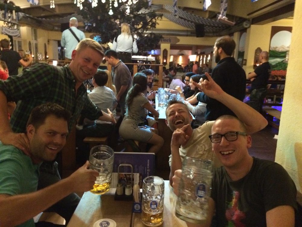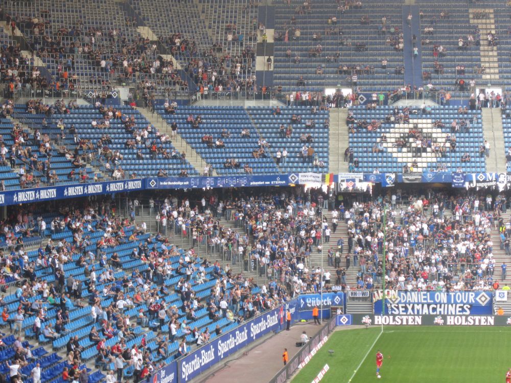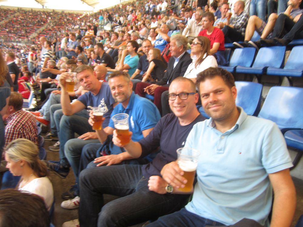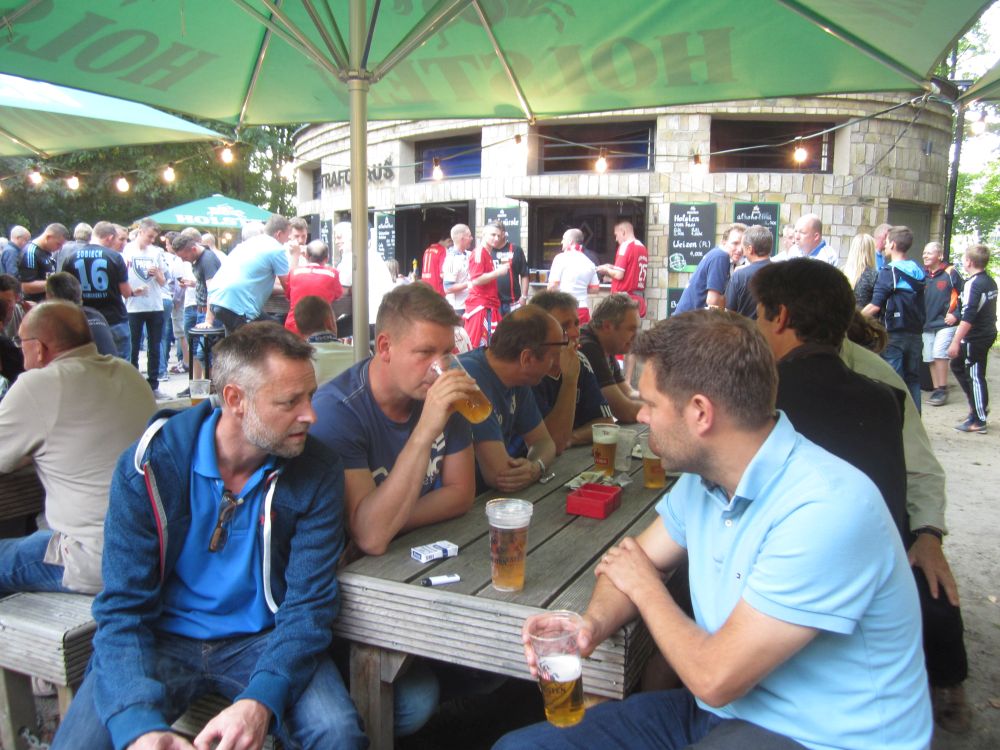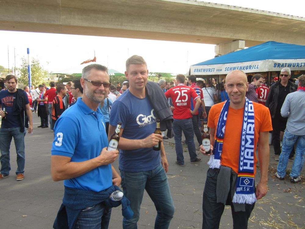 Kort før afrejse gik det op for os at den årlige oktoberfest startede i netop den weekend vi havde tænkt os at tilbringe i Tyskland – og at oktoberfest også er noget man fejrer i Hamburg. Så vi fandt naturligvis et sted med den rette stemning, læs live musik, fadøl i literkrus og piger med overarme store nok til at kunne bære fem ad gangen (i en hånd naturligvis).Efterhånden som liter-krusene blev tømt, steg stemningen alt imens… … at pigerne om de omkringliggende borde så mere og mere attraktive ud! (Eller i hvert fald hende her).Derfor var den en stor fornøjelse at se billederne dagen efter, og konstatere at det ikke kun var de flere og flere øl der gjorde udslaget.Vi blev da også så tilpas fulde at vi, trods vores ringe tyske, faldt i snak med de lokale…Dagen efter var det en flok slagne krigere. Vi havde bestilt et formiddagsbord på samme bar med mere oktoberfest-stemning, og tænkte det kunne være en perfekt opvarmning til fodbold-kampen…Men vi endte i stedet med at gå en laaaaang tur for at få lidt frisk luft(!!) – og Lasse og Klöcker fandt åbenbart kærligheden ved denne sø.Hen på eftermiddagen hvor temperaturen nærmede sig de 25 grader mente vi at det var på tide at finde mod stadion.Og det var også heromkring at vi igen havde mod på at prøve kræfter med endnu en af de der øl.. .. og så var man (næsten) klar igen.Dagens kamp var en af Tysklands mest klassiske opgør: Hamburger SV- Bayern München. Nord mod Syd, og det suveræne tophold mod et hold i krise.Vi blev oven i købet for kælet med en dansker i startopstilling, da Pierre Emil Højbjerg startede sammen med nykårede verdensmestre som Thomas Müller, Philip Lahm og Manuel Neuer.HSV var i 2014 den eneste klub der har spillet samtlige sæsoner i Bundesligaen, det markeredes med et ur i det ene hjørne af stadion som tæller hvor mange år, dage, timer, minutter og sekunder HSV har været i Bundesligaen.Kampen sluttede som den startede nemlig 0-0 – men trods det en underholdende kamp hvor et heroisk kæmpende hjemmehold fik fightet sig til 1 tiltrængt point.Da ca. 57.000 skulle hjem fra den samme U-Bahn som os, valgte vi lige at tage en øl efter kampen på en lille knejpe tæt ved stadion.Kort efter at Lasse havde bestilt en wurst fik han selskab af caféens to (pænt store) hunde som begge gerne ville have del i maden. De så meget sultne ud og Lasse blev lidt stram i masken… Han slap dog uden bidemærker – men hans trøje var efterfølgende godt savlet til!