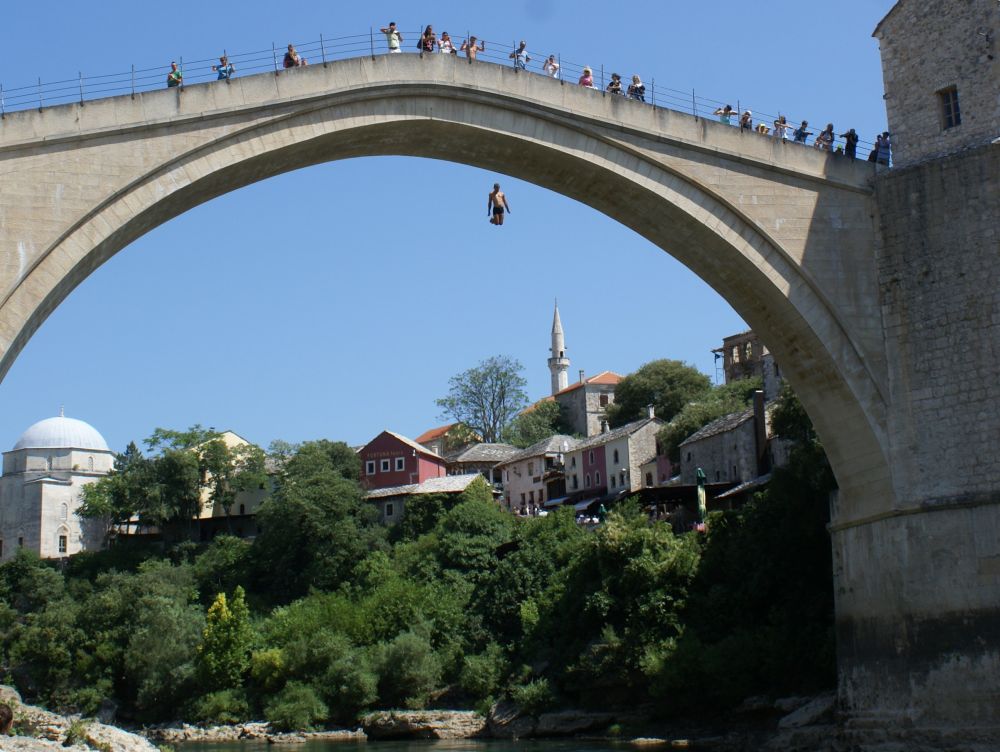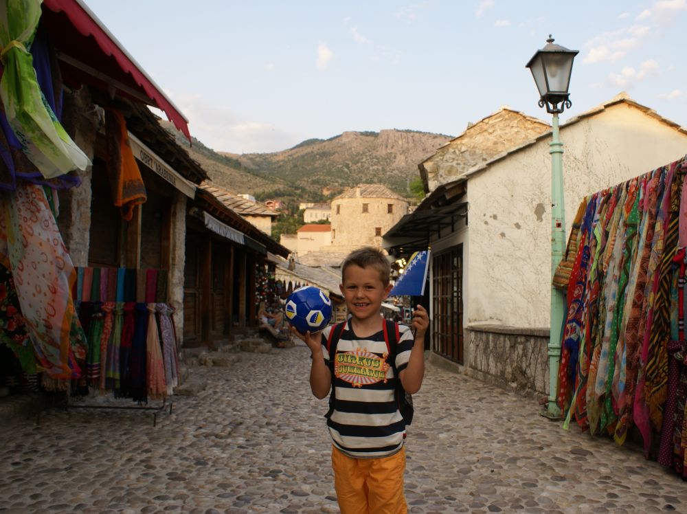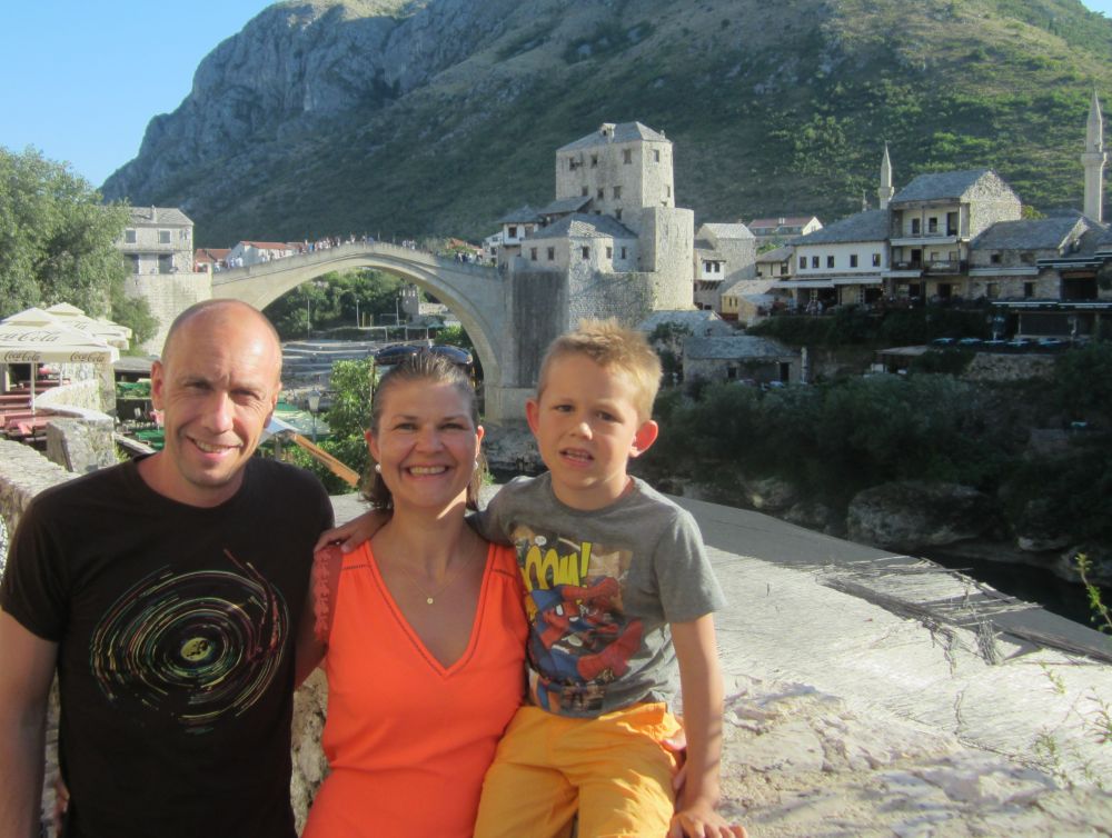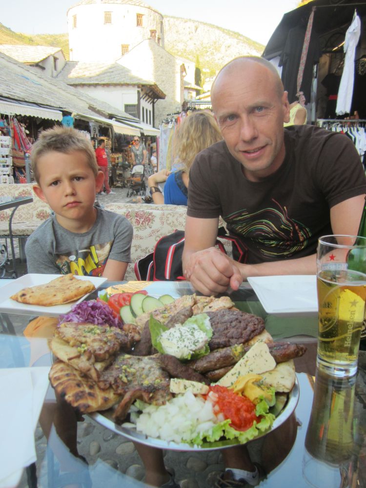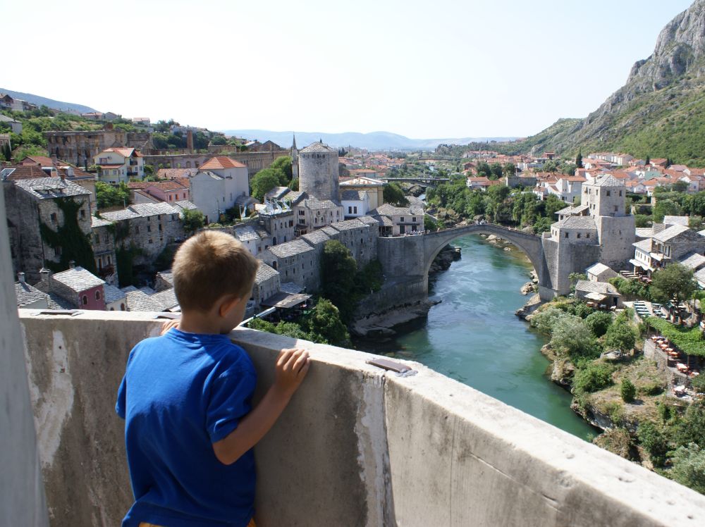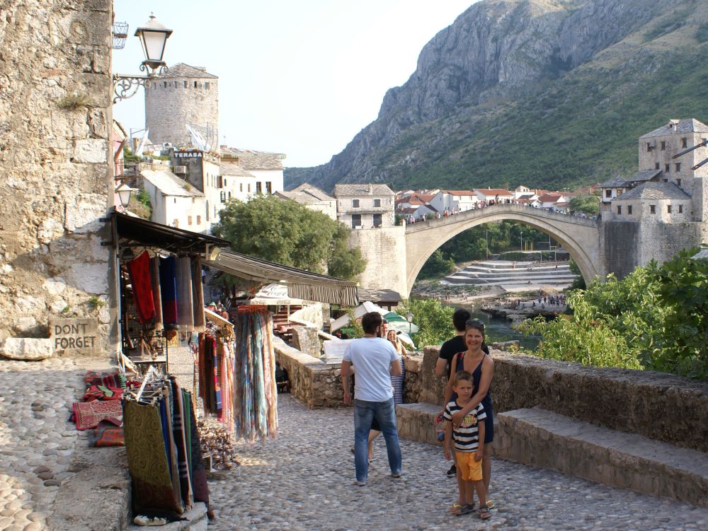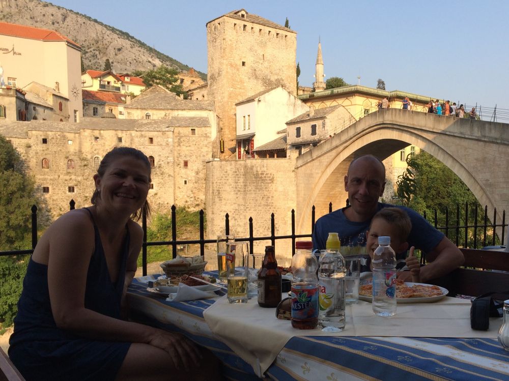 Neretva-floden deler byen i to hvor der primært bor kroater på vestbredden og bosniske muslimer på østbredden. Derfor var Mostar en af de byer der blev hårdest ramt unden borgerkrigenI 1993 blev den 400 år gamle bro Stari Most skudt i stykker af kroatiske styrker. Efter krigen blev broen rekonstrueret af broens originale sten, der blev hentet op fra floden. Den genopbyggede bro stod færdig i juli 2004, og året efter blev den genoptaget på UNESCOs Verdensarvsliste.Byens historiske bykerne blev opført i den osmanniske periode.Og der ligger stadig en del moskéer i byen hvor..…denne smalle trappe førte en til toppen af moskéens mineret..…hvor der ventede en imponerende udsigt – men ikke et sted for folk med højdeskræk.Her står Tina og Ebbe-Emil og vinker fra toppen af minereten. Det er åbenbart en udbredt misforståelse at broens navn Stari Most kommer fra de to bosniske ord ’star’ for gammel og ’most’ for bro, således at Stari Most bliver til ”(den) Gamle Bro”.Most ER navnet for bro, men navnet Most kommer fra Mostar som kommer fra ordet Mostari… Mostari var de mennesker der var ansat af Osmanneriget til at bevogte broen og tage betaling for at lade folk passere broen. Dengang var den eneste anden overgang over floden flere kilometer væk, og derfor blev broen meget benyttet. På den måde var det tolderne, Mostari, der senere gav byen navnet “Mostar”.I dag er der ikke toldere der ’plyndrer’ turister for penge.. til gengæld nogle vovehalse der samler penge ind fra turister på broen. Når de har samlet 50EUR sammen tager en af dem springet de 20 meter ned i floden. Jeg skulle nok have lidt mere end 50EUR for at tage springet!En lokal restaurant med fin skyggeplads, kolde øl og udsigt til floden og broen er nu ikke den værste måde at tilbringe en aften på. I løbet af eftermiddagen blev det simpelthen for varmt til at være nogen steder, så vi fandt byens friluftsbad hvor vi kunne slappe af i og omkring poolen indtil temperaturen igen sneg sig under de 30 grader…Sidste aften i Mostar, hvor vi havde fået en restaurant med primært lokale retter anbefalet af vores udlejer. Ebbe-Emil var vist ikke tilfreds med restaurantvalgte idet de ikke havde pizzaer på menuen.Ebbe-Emil skriver postkort til klassen og vennerne.Der kommer en del dagsturister til Mostar som tager turen fra enten Dubrovnik eller Split i Kroatien eller fra Bosniens hovedstad Sarajevo. De dagsturister havde forladt byen når man slentrede hjem fra byen om aftenen og derfor havde man byen næsten for sig selv.Tror alle i selvskabet var godt tilfreds med de oplevelser vores 2-3 dage i Mostar/Bosnien gav os.Broen bliver ikke mindre magisk om aftenen når den oplyses.Mostar/Bosnien vender jeg gerne tilbage til en anden gang.Lidt uden fort Mostar ligger Blagaj som er et ’tekke’ – en slags muslimsk kloster.Klostret ligger smukt placeret ved Buna-flodens udspring. Vi konstaterede at dørene i klostret passer fint i højden til en 7-årig dreng.