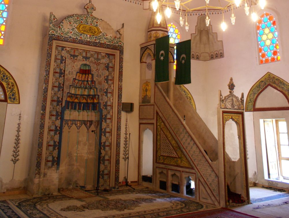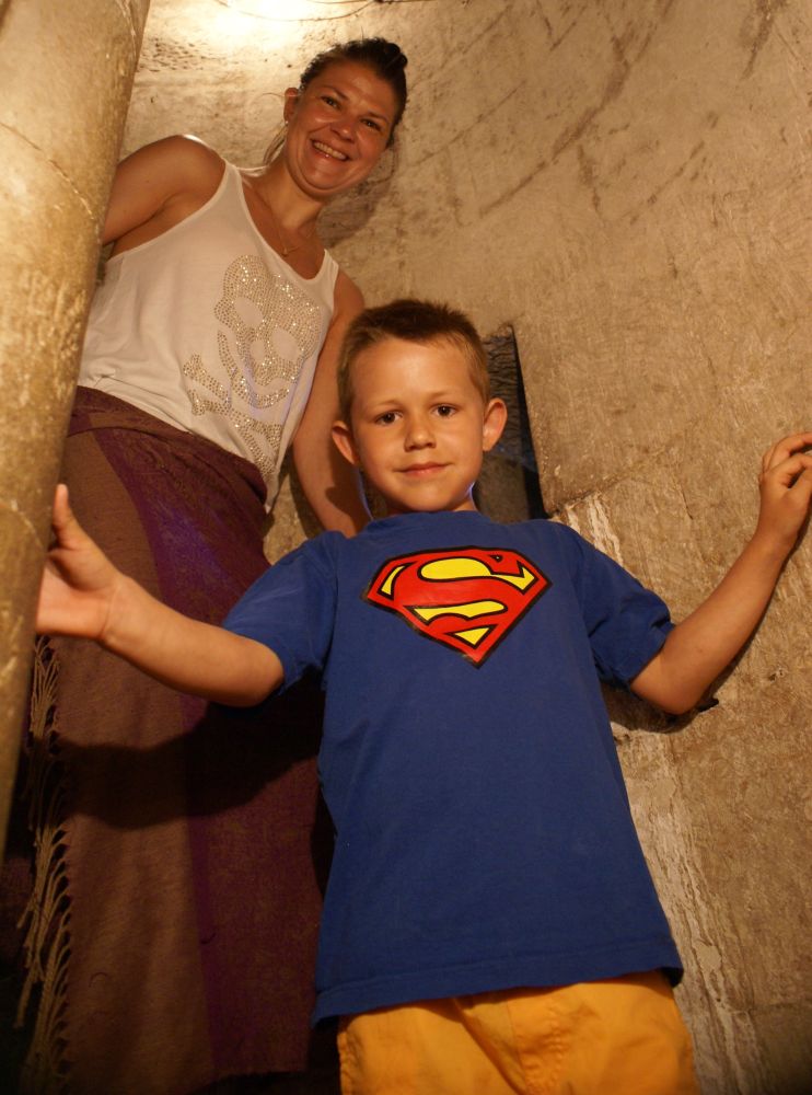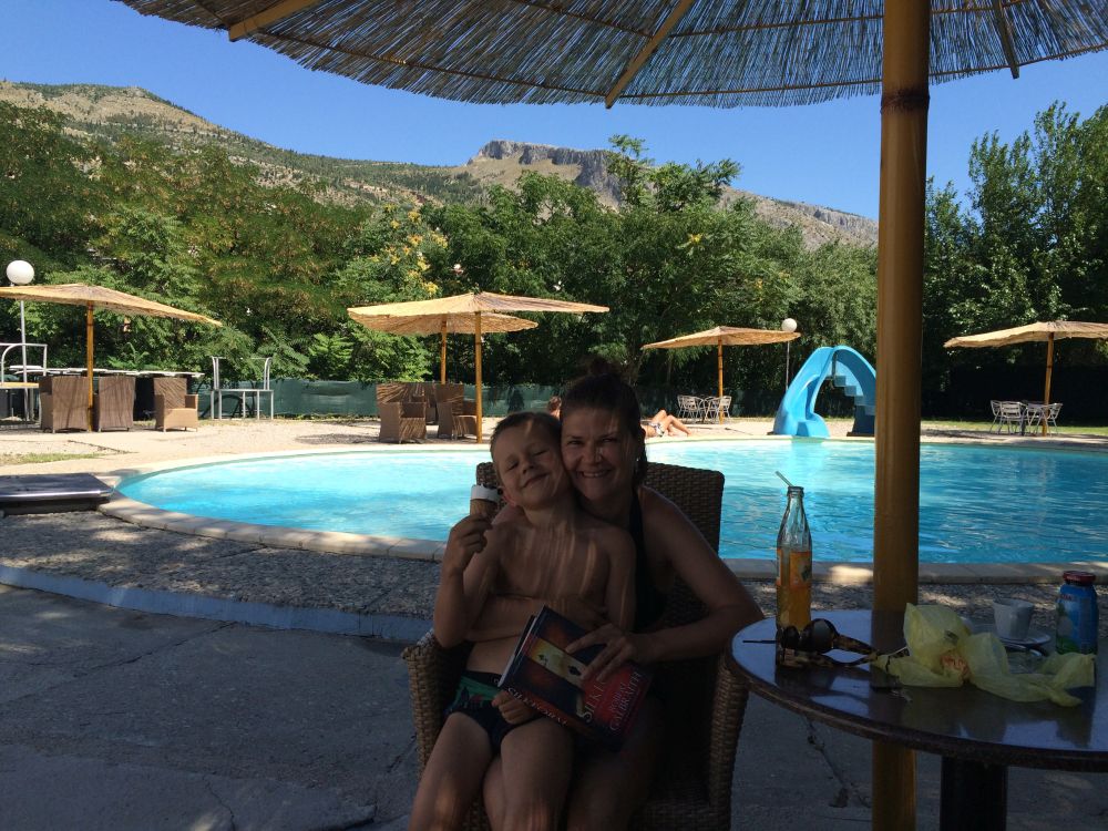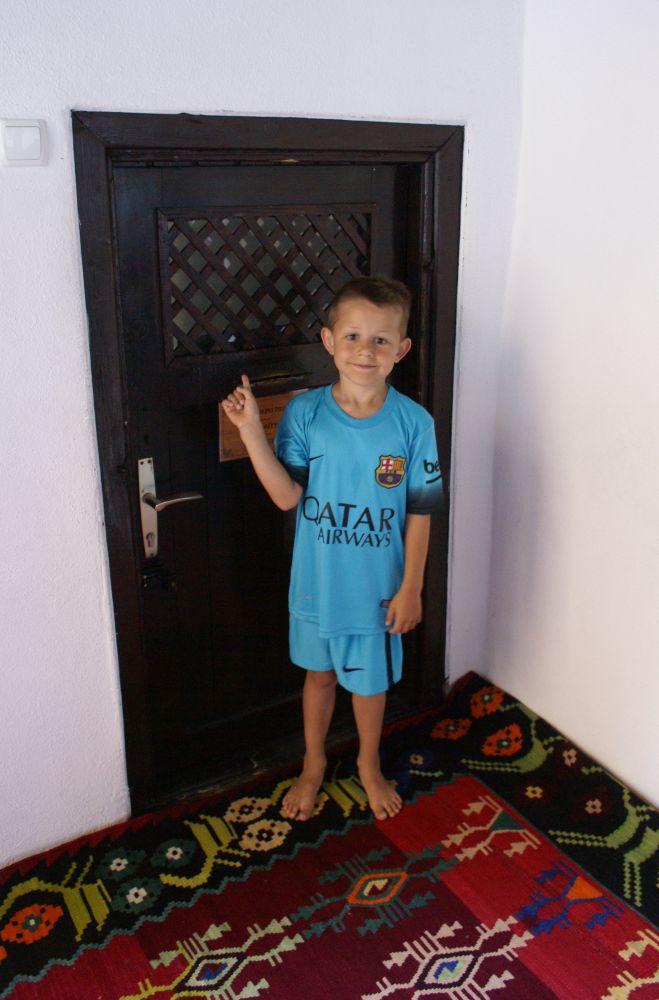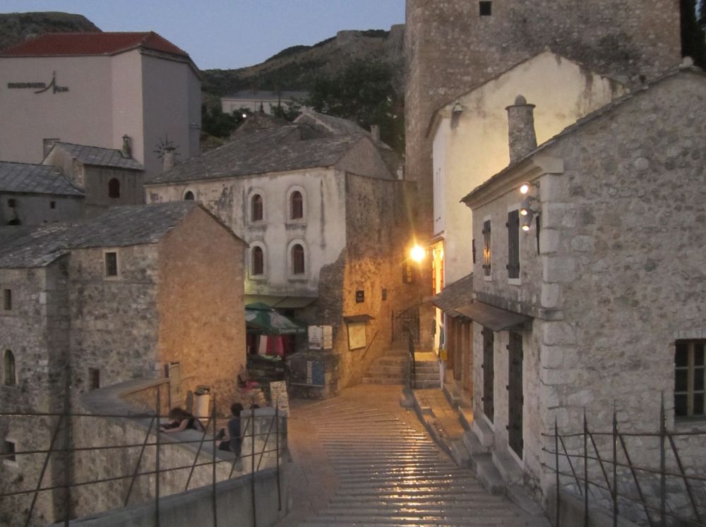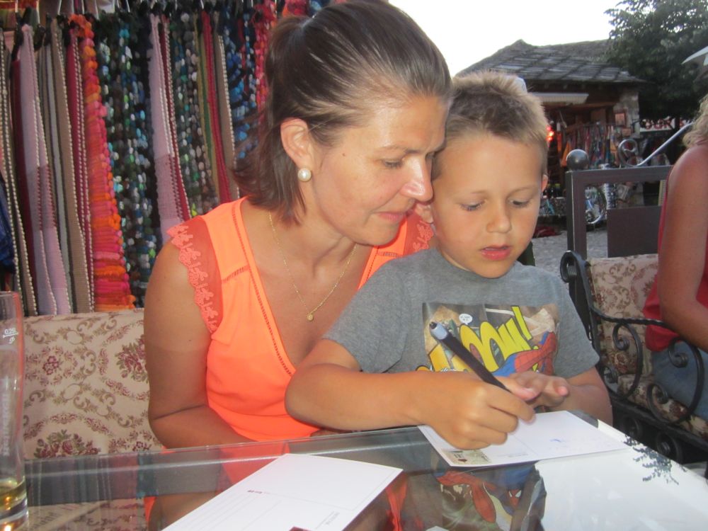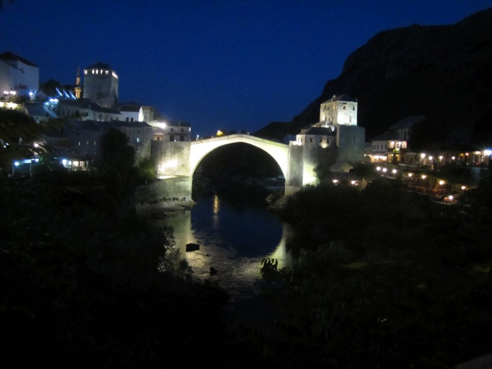 Neretva-floden deler byen i to hvor der primært bor kroater på vestbredden og bosniske muslimer på østbredden. Derfor var Mostar en af de byer der blev hårdest ramt unden borgerkrigenI 1993 blev den 400 år gamle bro Stari Most skudt i stykker af kroatiske styrker. Efter krigen blev broen rekonstrueret af broens originale sten, der blev hentet op fra floden. Den genopbyggede bro stod færdig i juli 2004, og året efter blev den genoptaget på UNESCOs Verdensarvsliste.Byens historiske bykerne blev opført i den osmanniske periode.Og der ligger stadig en del moskéer i byen hvor..…denne smalle trappe førte en til toppen af moskéens mineret..…hvor der ventede en imponerende udsigt – men ikke et sted for folk med højdeskræk.Her står Tina og Ebbe-Emil og vinker fra toppen af minereten. Det er åbenbart en udbredt misforståelse at broens navn Stari Most kommer fra de to bosniske ord ’star’ for gammel og ’most’ for bro, således at Stari Most bliver til ”(den) Gamle Bro”.Most ER navnet for bro, men navnet Most kommer fra Mostar som kommer fra ordet Mostari… Mostari var de mennesker der var ansat af Osmanneriget til at bevogte broen og tage betaling for at lade folk passere broen. Dengang var den eneste anden overgang over floden flere kilometer væk, og derfor blev broen meget benyttet. På den måde var det tolderne, Mostari, der senere gav byen navnet “Mostar”.I dag er der ikke toldere der ’plyndrer’ turister for penge.. til gengæld nogle vovehalse der samler penge ind fra turister på broen. Når de har samlet 50EUR sammen tager en af dem springet de 20 meter ned i floden. Jeg skulle nok have lidt mere end 50EUR for at tage springet!En lokal restaurant med fin skyggeplads, kolde øl og udsigt til floden og broen er nu ikke den værste måde at tilbringe en aften på. I løbet af eftermiddagen blev det simpelthen for varmt til at være nogen steder, så vi fandt byens friluftsbad hvor vi kunne slappe af i og omkring poolen indtil temperaturen igen sneg sig under de 30 grader…Sidste aften i Mostar, hvor vi havde fået en restaurant med primært lokale retter anbefalet af vores udlejer. Ebbe-Emil var vist ikke tilfreds med restaurantvalgte idet de ikke havde pizzaer på menuen.Ebbe-Emil skriver postkort til klassen og vennerne.Der kommer en del dagsturister til Mostar som tager turen fra enten Dubrovnik eller Split i Kroatien eller fra Bosniens hovedstad Sarajevo. De dagsturister havde forladt byen når man slentrede hjem fra byen om aftenen og derfor havde man byen næsten for sig selv.Tror alle i selvskabet var godt tilfreds med de oplevelser vores 2-3 dage i Mostar/Bosnien gav os.Broen bliver ikke mindre magisk om aftenen når den oplyses.Mostar/Bosnien vender jeg gerne tilbage til en anden gang.Lidt uden fort Mostar ligger Blagaj som er et ’tekke’ – en slags muslimsk kloster.Klostret ligger smukt placeret ved Buna-flodens udspring. Vi konstaterede at dørene i klostret passer fint i højden til en 7-årig dreng.