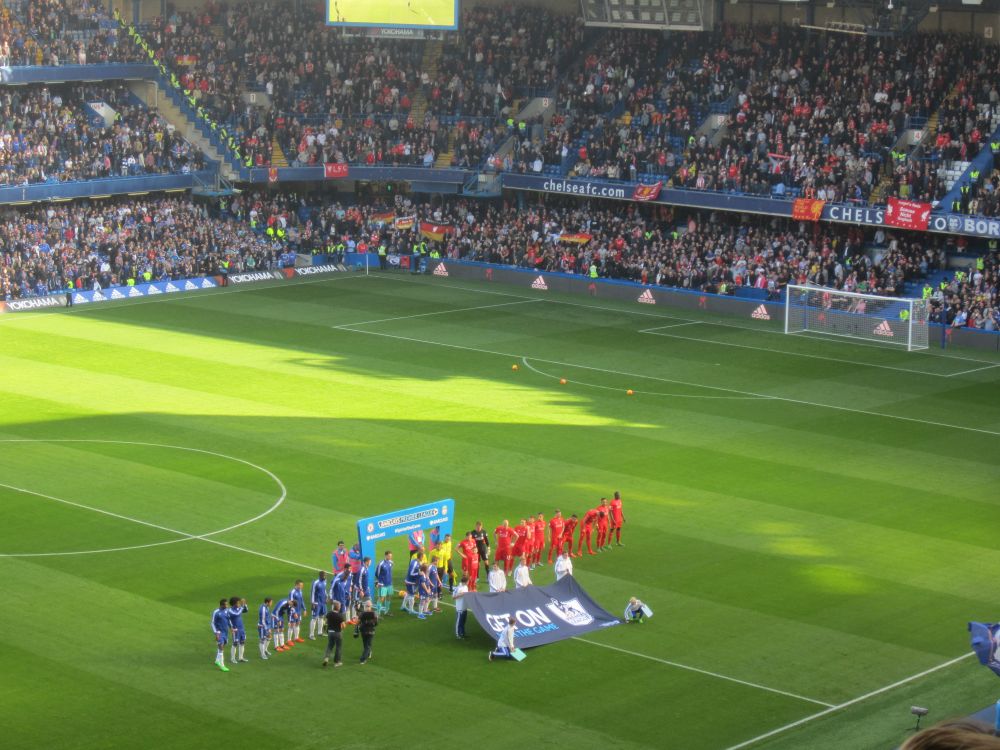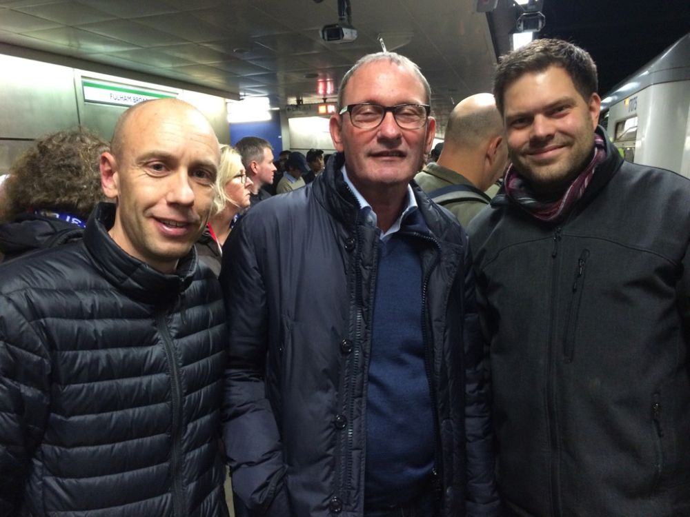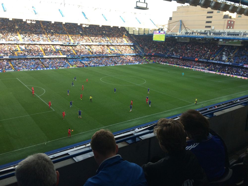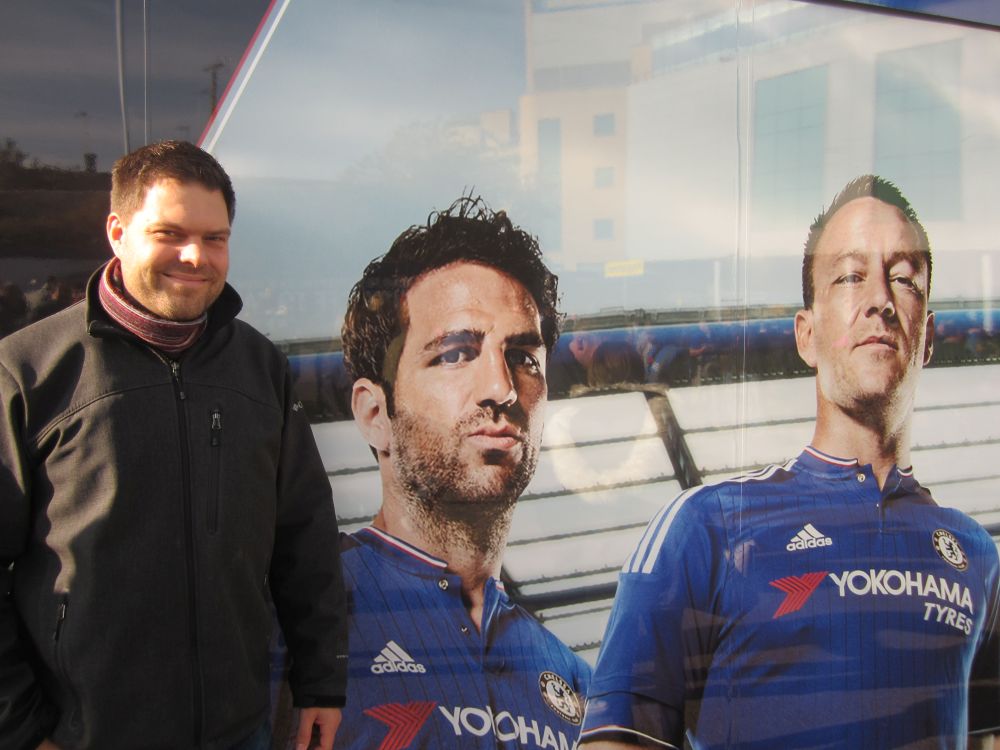 Hovedretten var denne lækkerbisken af en kamp mellem Chelsea og Liverpool.Historien bag fremskaffelsen af billetterne til denne kamp er næsten den bedste del af denne weekend. Vi havde igennem flere måneder arbejdet frem og tilbage på forskellige kampe vi ville se – men kunne ikke skaffe billetter til noget (til en rimelig pris), så faktisk stod vi 1 uge før afrejse uden fodboldbilletter. I desperation skrev jeg til min gode ven og fixer, Edu i Barcelona for at høre om han ikke kunne gøre noget.. Et par dage senere havde Edu snakket med hans gode ven, som er ven med Cesc Fabregas fra Chelsea. Cesc havde da lige 2 billetter i overskud – dem kunne vi da få. Så vi endte med at få 2 billetter til Chelsea – Liverpool, gratis – af Cesc Fabregas!!Så en kæmpe thumbs up til Edu og Fabregas (og hans for os ukendte ven)! Muchas gracias.Vi kvitterede med at smide nogle penge på Fabregas som første målscorer (som vi dog ikke vandt på!).Langsidebilletter til Chelsea – Liverpool er ikke helt billigt, og vi kunne se på billetten af normalprisen var ikke mindre en 82£ – små 800 kroner!!!Det var primært turister og forretningsfolk der sad omkring os.Chelseas hjemmebane, Stamford Bridge, kaldes i daglig tale også bare for ’broen’. I så fald havde jeg fået plads klods op ad en af bropillerne.Kampen endte med en lidt overraskende 3-1 sejr til udeholdet Liverpool – til min store glæde. Nogle uger senere blev Chelseas træner Mourinho fyret i Chelsea.Efter kampen skulle vi sammen med 30.000 andre hjem med Londons Underground, hvor vi blev lukket ind på stationen i hold. Meget effektivt!Da vi endelig kom frem ned på stationen rendte vi ind i Preben Elkjær – min kollega Henrik var meget beæret over at få et billede sammen med to af Europas bedste angribere..Næste punkt på programmet var VM-finalen i Rugby som blev spillet i London. Desværre måtte vi nøjes med at følge på denne storskærm. Finalen stod mellem New Zealand – Australien.The All Blacks opfører deres Haka før hver kamp – altid fascinerende at se.Kampen endte med en knusende sejr til favoritterne fra New Zealand på 34-17, hvilket mange af de tilrejsende kiwier fejrede hele aftenen og natten. Jeg sendte en kærlig tanke til min tidligere værtsfamilie i New ZealandSøndag morgen skiftede vi vores hotel i det centrale london ud med et i Østlondon tæt på messen. Vi kunne skyde genvej ved at tage en kabelbane, hvilket synes var alletiders idé…London var dog ramt af en tæt tåge, så vi kunne INTET se fra kabinen – hvilket vi grinte en del af.Smilet forsvandt dog dagen efter da tågen stadig ikke var lettet og vores aftenfly hjem blev aflyst – så vi måtte nappe en nat mere i London.Søndag var der dog én kamp på programmet i London og omegn, nemlig kampen i League 2 (fjerde bedste række) kampen mellem Dagenham & Redbridge mod Luton Town. Den kamp skulle vi ikke gå glip af…Dag & Red, eller Daggers er en af de yngste klubber i divisionerne. Klubben blev dannet i 1992 af en sammenslutning mellem Redbridge Forest og Dagenham. I 2009-2010-sæsonen rykkede klubben op i League 1, men måtte allerede året efter tage turen ned i League 2 igen.Spillerne fra udeholdet Luton ankommer til stadion og en TV rapporter er på plads.. Igen vi snakker den fjerdebedste række der er min. 60 hold der ligger bedre pladseret end dagens to hold!En second breakfast på den lokale pub hører sig til når man skal til fodbold.Daggers lå og rodede rundt i bunden af tabellen og endte også med at tabe dagens kamp med 0-2.Det fik klubbens fans til at kræve træner Burnetts afgang. ’We Want Burnett Out – we want Burnett our’ lød det fra klubbens hardcore fans bag målet.