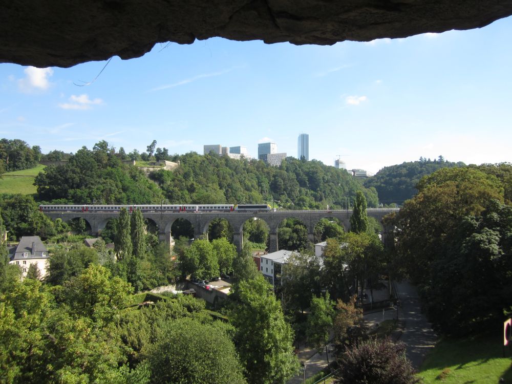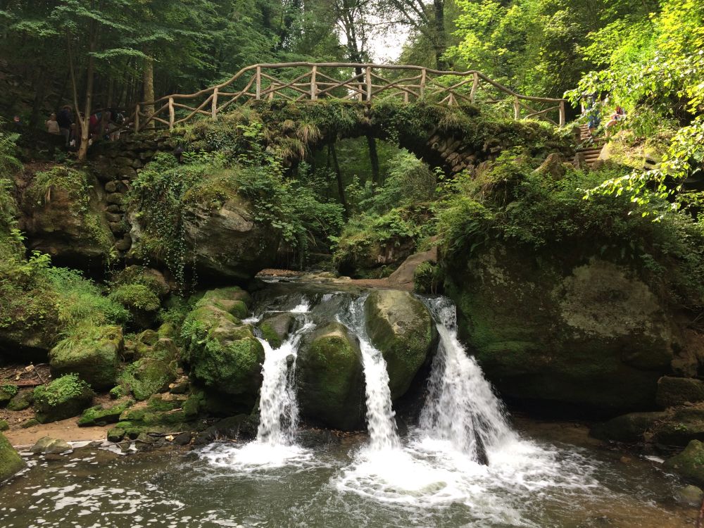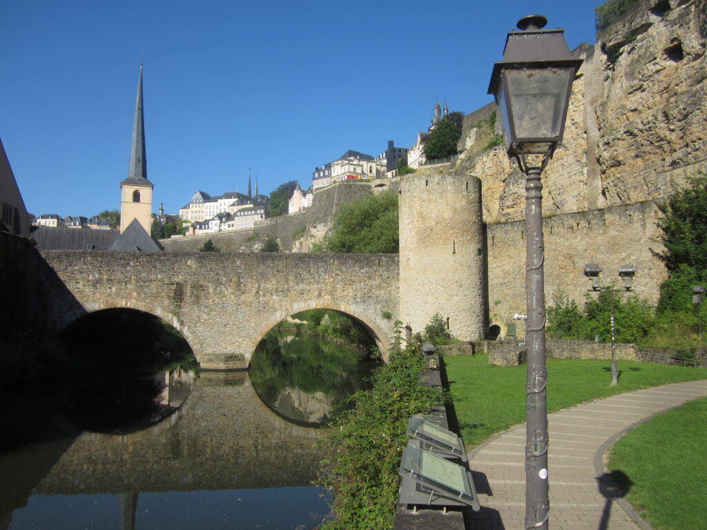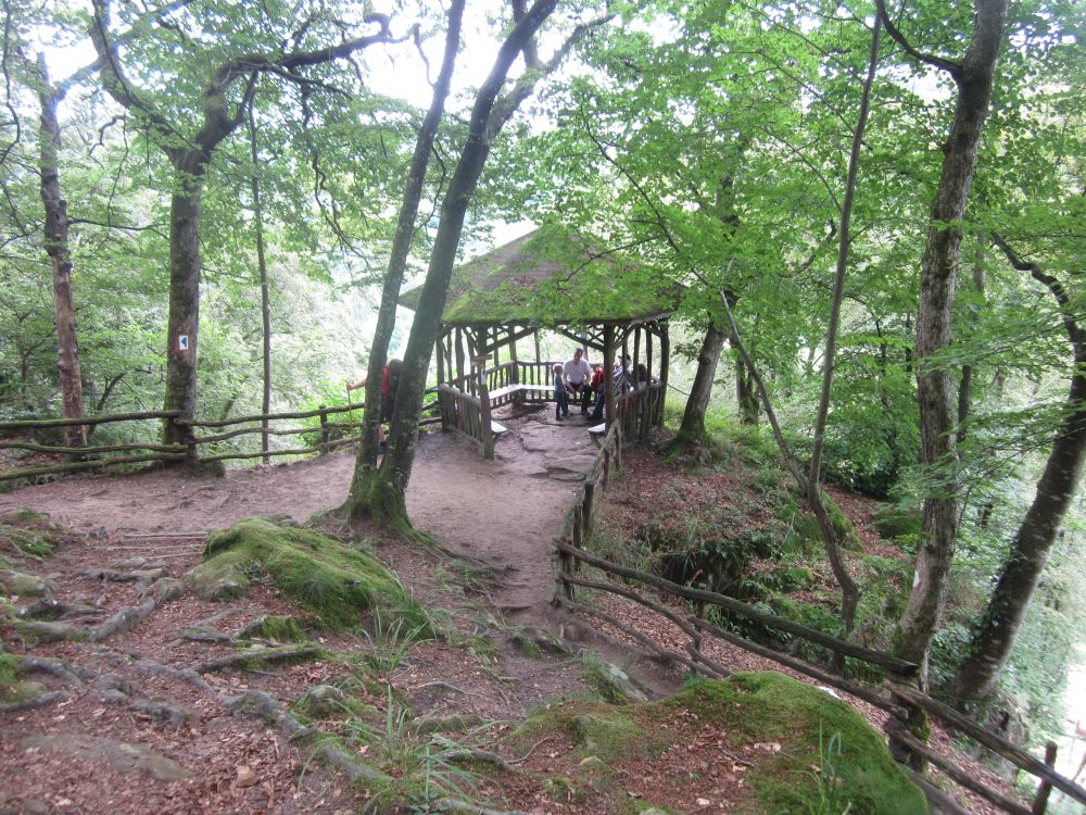 Ved ankomsten til Luxembourg lejede vi en bil og kørte en halv time mod nordøst til Mullerthal, et område der kaldes La Petit Suisse – Det Lille Schweiz.Et smukt naturområder med skov, klipper, vandløb og slugter.. Og her en klippeformation formet som en stenmand.Området er meget brugt til kortere og længere vandreture og her en fin træpavilion med en smukt udsigt ud over landskabet.Udover naturen er denne gamle stenbro et yndet udflugtsmål – også for lokale.