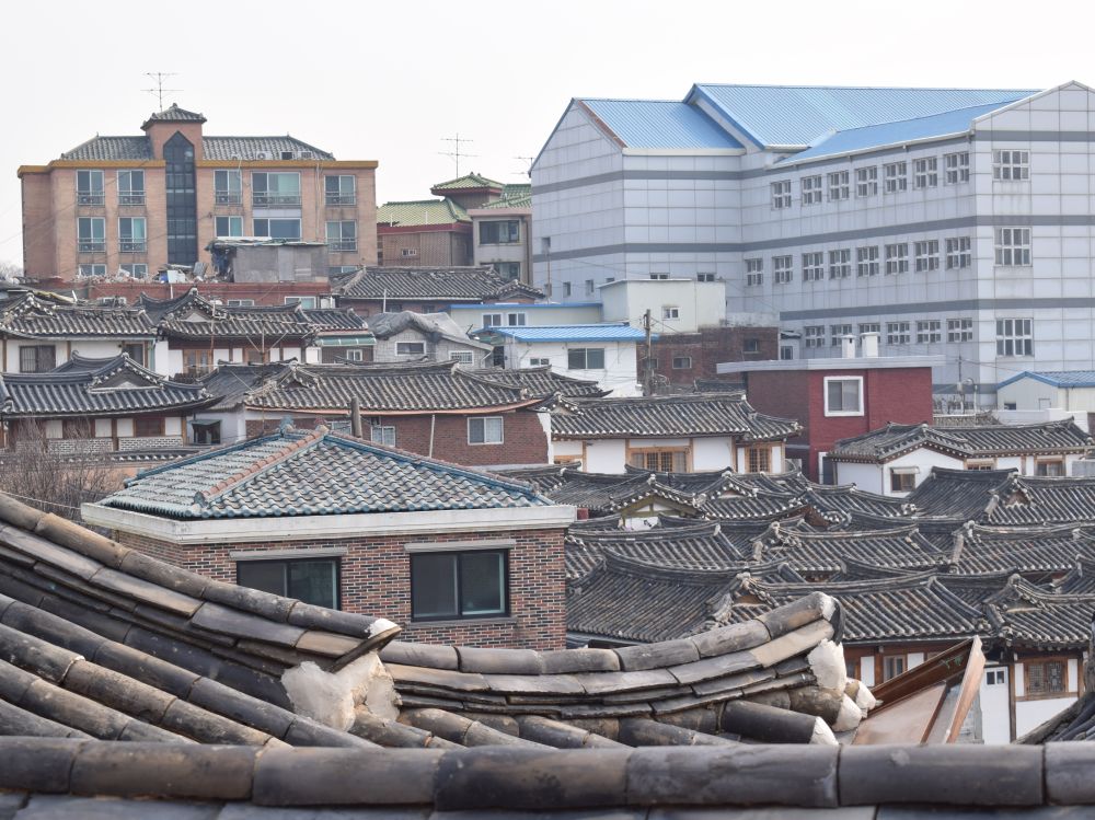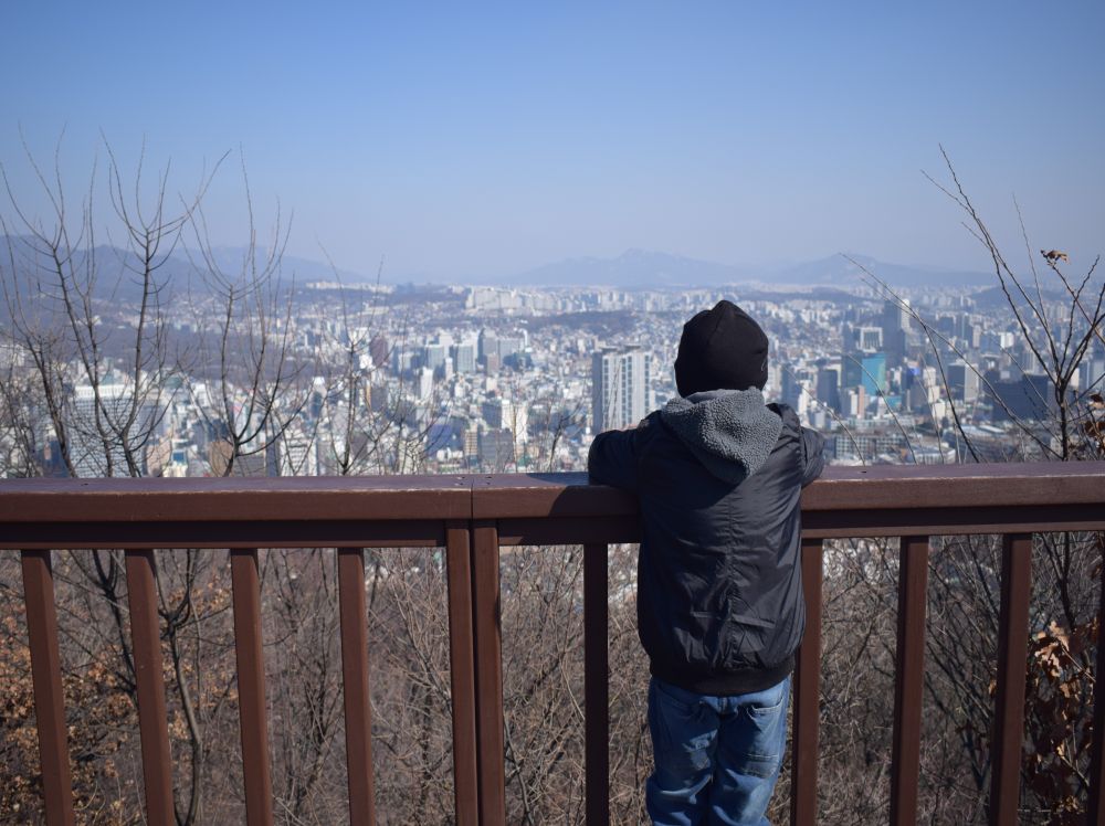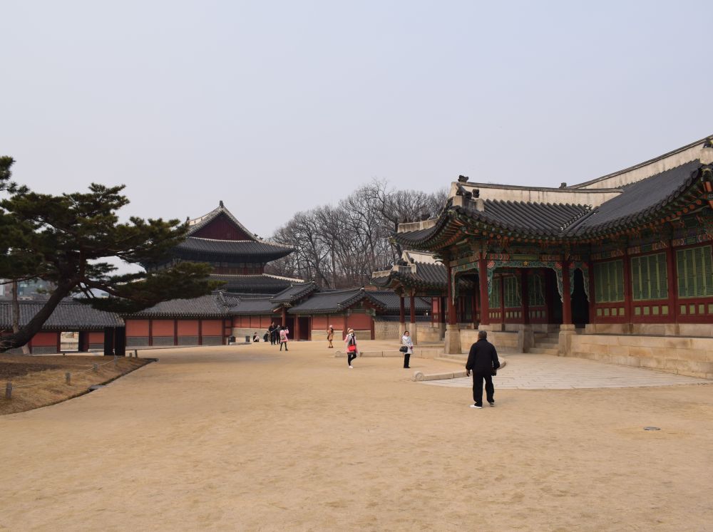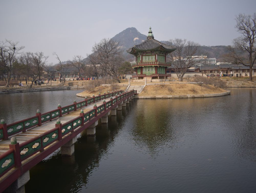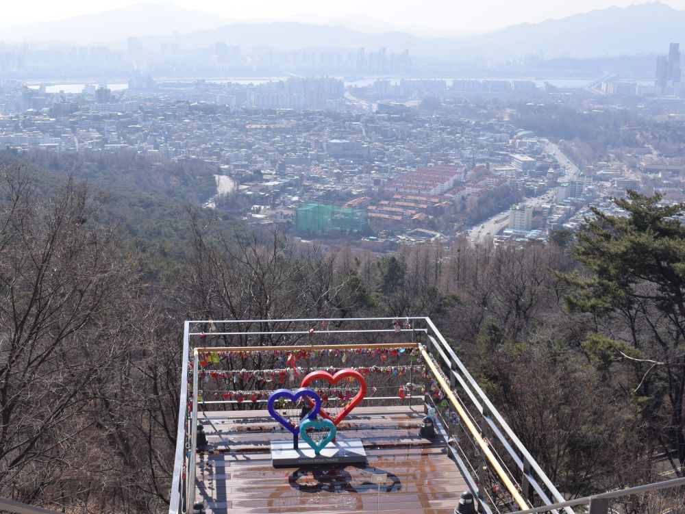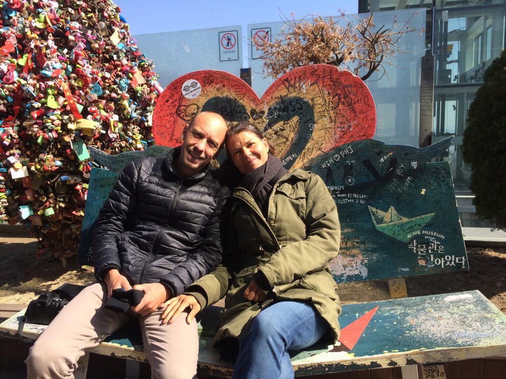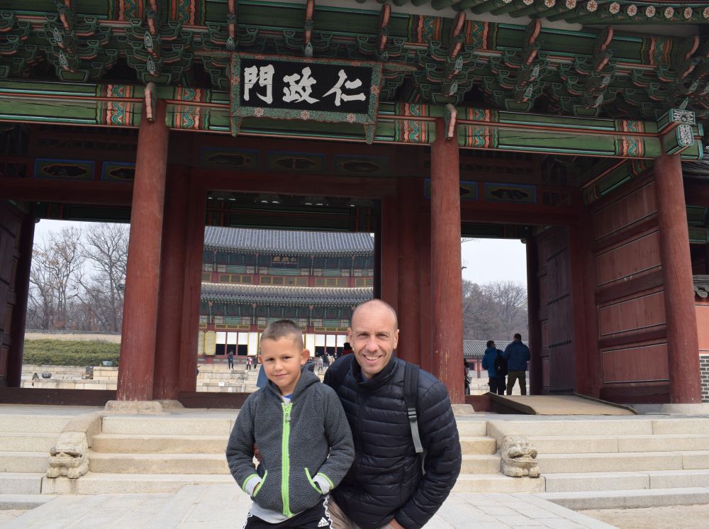 Changdeokgung Palace er et af Seouls ’5 Grand Palaces’.Seoul har været hovedstad siden 1394 under forskellige konger og kejsere.Templet har haft et hårdt liv. Det oprindelige palads blev bygget i 1395, brændt ned af japanerne i 1592. Genopbygget igen 1609. Brændt ned igen pga. interne politiske stridigheder i 1623. Koreas sidste kejser, Sunjong boede her indtil hans død i 1926. Under den japanske besættelse af landet (1910-1945) led paladset også store skader. I dag er der 13 stående bygninger tilbage + 28 pavilloner og smukke haver.Ikke langt fra templet ligger Bukchon, et mindre område med de gamle traditionelle beboelseshuse Hanok og et charmerende åndehul uden trafik.Et godt billede på Seoul og Sydkorea – gamle traditioner blandet med top-moderne bygninger.Gyeongbokgung-paladset er Seouls største og vigtigste tempel.Det var det royale palads under Joseon-dynastiet og blev bygget i 1395, hvor mange af de lokale tilsyneladende ynder at klæde sig ud i gamle traditionelle klæder for derefter at sætte deres selfie stick på overarbejde.Vi var så heldige at kommer forbi mens der var vagtskifte.En tur ned af en af Seouls gågader – der var vi bestemt ikke alene..Her foran en madbod med ’ting på pind’. Trods muligheden for at dyppe i Ketchup takkede Ebbe-Emil dog Nej tak!Vi havde intet vintertøj med så vi indså hurtigt at et par sko, et par lange bukser, en jakke samt hue og vanter var en nødvendighed hvis Ebbe-Emil skulle overleve. Så efter et besøg i H&M var Ebbe-Emil bedre rustet til de koreanske vintertemperaturer.En tidlig morgen gik vi fra vores lejlighed til toppen af denne bakke hvor vi skulle til toppen af N Seoul Tower. TV tårnet er bygget i 1971 og er 236 meter højt.Tårnet er beliggende på en bakketop så allerede ved foden af tårnet var en fin udsigt ud over Seoul.En officielt ’proposal-platform’ hvor unge og eller forelskede kan fri til hinanden..Vi nøjedes dog med et billede på denne kærlighedsbænk som var knækket på midten således at man automatisk kom til at sidde tættere på hinaden.