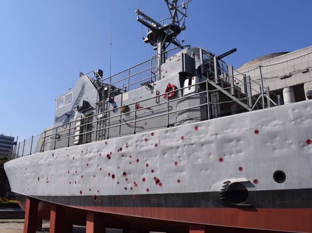 Det var et kæmpe museumsbygning som naturligvis primært handler om Korea-krigen og splittelsen af de to lande. Udenfor stod en imponerende samling af kampvogne, tanks, kanoner og sågar et B52 Bombefly.Her (en kopi af) et sydkoreansk patruljeskib der blev skud ned at et nordkoreansk skib i 2002. De røde mærker markere skudkullerne.
