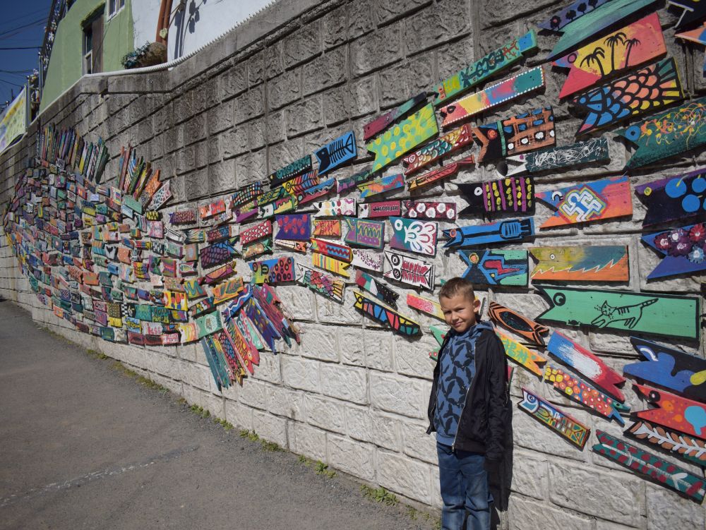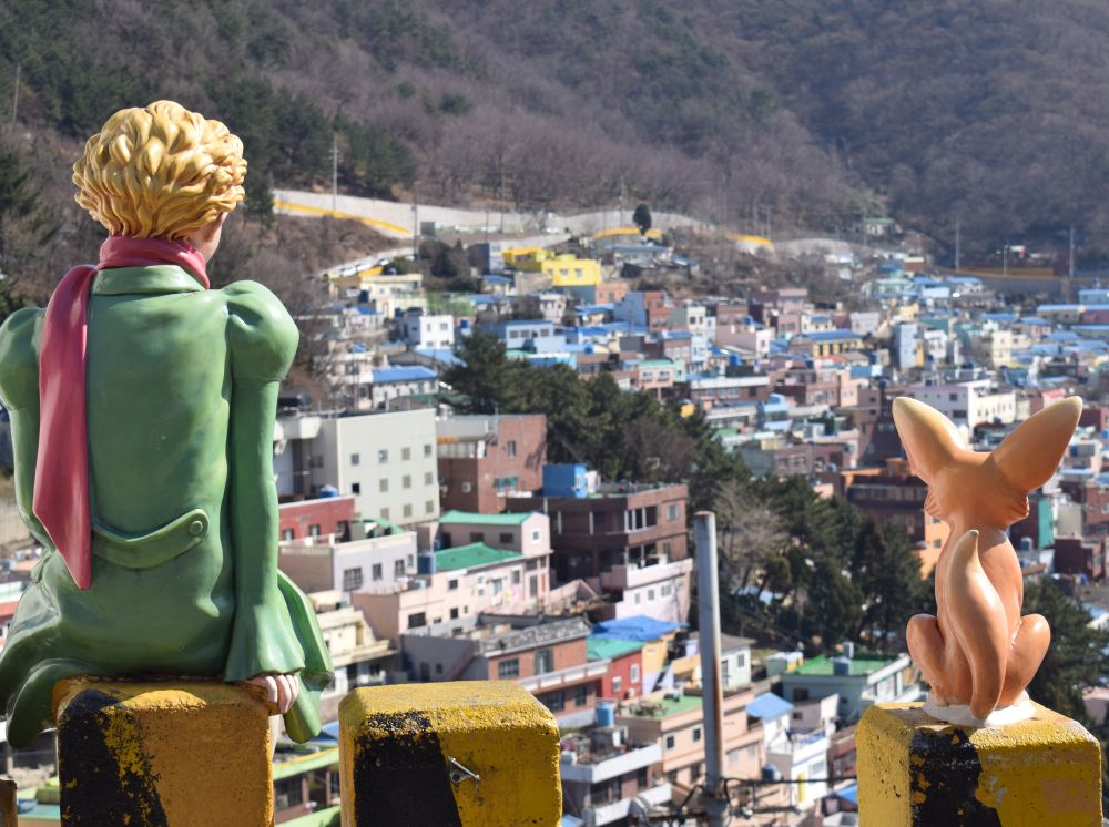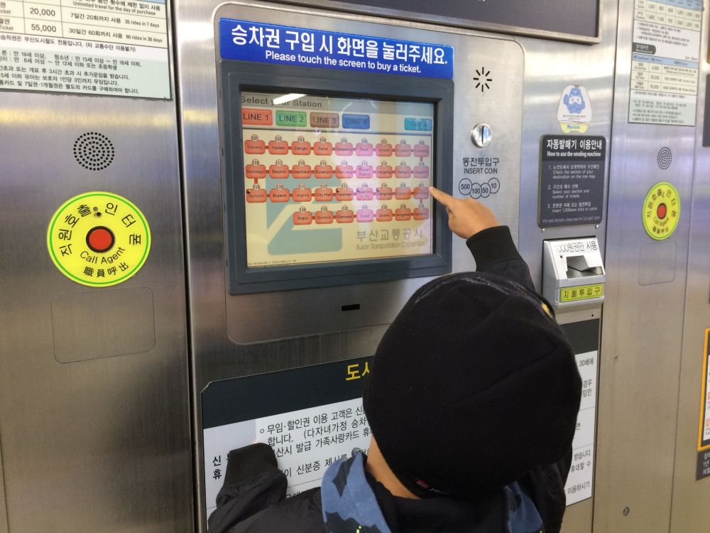 Sidste stop i Sydkorea var Busan, landets næststørste by med knap 4 millioner indbyggere. Byen var et af de få områder, som forblev under sydkoreansk kontrol gennem hele Koreakrigen, og byen var også for en kort stund landets hovedstad.Ebbe-Emil stod for billetbestillingen når vi skulle med metro – det fik han hurtig styr på..Et af de mest interessante områder I Busan er bydelen Gamcheon, en slags kunstnerby hvor de farvede huse ligger på bakkeskråninger på begge sider er dalen.Masser af små detaljer i by- og gadebilledet…og masser af sjove og skæve butikker og caféer.En mosaik der danner et billede af en kæmpe fisk.En tidlig morgen sagde vi farvel til Sydkorea og sejlede fra Busan med hurtigbåden til Japan – Solens Rige. Turen over strædet til Fukuoka i Japan tog blot 3 timer.