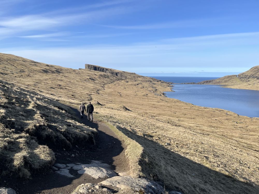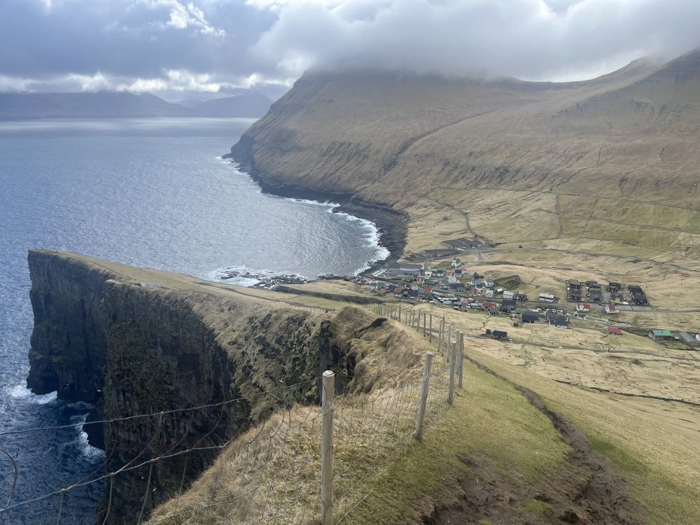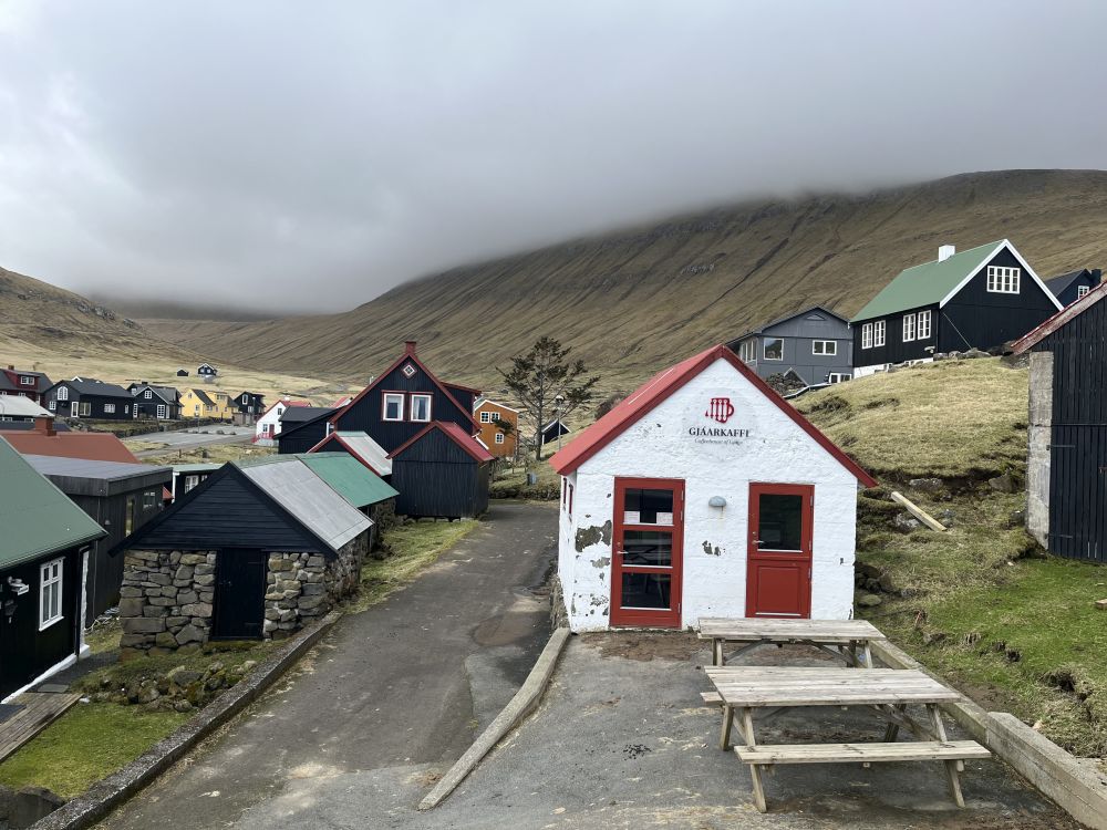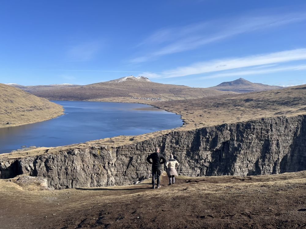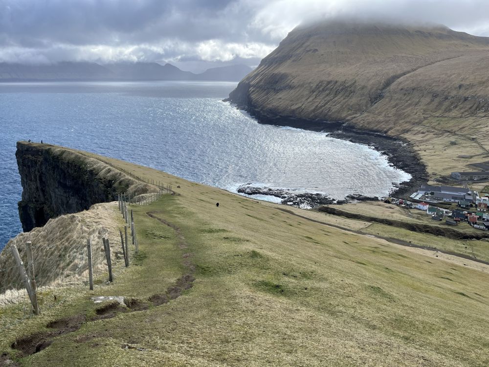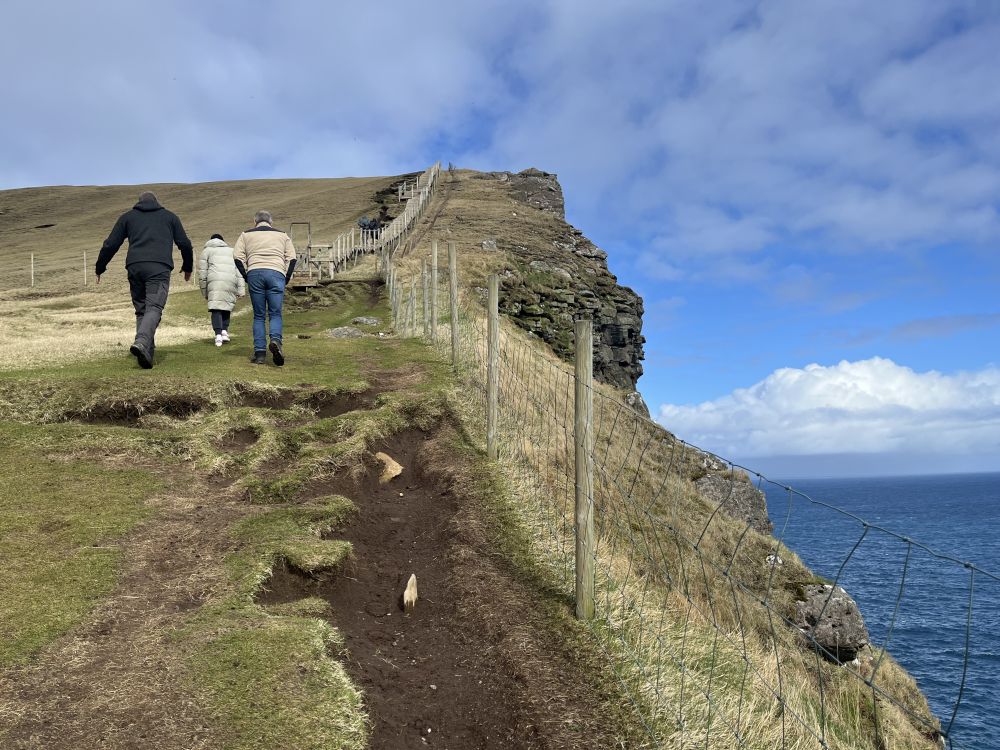 Risin og Kellingin (færøsk for Jætten og Kællingen) er navnet på de to store stensøjler der står ud for øen Eysturoy. Sagnet fortæller at Island havde til hensigt at trække Færøerne tættere hen til sig. Derfor blev kæmperne Risin og Kellingin bedt om at udføre denne opgave. Kæmpen blev stående i havet, mens hans kone klatrede op på bjerget for at binde Færøerne sammen for siden at skubbe dem op på ryggen af kæmpen. Lang historie kort – de nåede ikke at færdiggøre deres arbejde da morgenen begyndte at gry. Hun begav sig hjemad, kæmpen forrest og hans kone bagved. Men da solen steg op af havet forstenede solens stråler dem begge.En fodboldbane der ikke længere er i brug og efter planerne skal laves om til en campingplads. Tænker der er røget nogle bolde i søen/havet igennem årene.Fremme i den lille by Gjógv ligger denne lille lokale lokale coffee shop.Fra den lille café begyndte vores vandretur ad Ambadalur.Målet var toppen af fjeldet – ca. 400 meter over havet.Flot udsigt over byen Gjógv (udtales vist Jackv) der mest kendt for den naturliige havn i bunden af slugten, hvorefter de via en rampe trækkes op på land, så de ligger beskyttet fra bølgerne. Naturhavnen er sandsynligvis allerede blevet benyttet i vikingetiden.I 2005 besøgte Kronprins Frederik og Kronprinsesse Mary Gjógv. Et lokalt par fik den idé at placere en bænk med flot udsigt. Mary indviede bænken og idag kendes bænken som “Marys Bænk”.En del fulgle havde slået sig ned langs kløftens sider, og i sommermånederne kan man se lunderne når de kommer frem fra deres huler og flyver ud på havet efter føde til ungerne. Vi valgte ikke at spise på Anus Steakhouse…