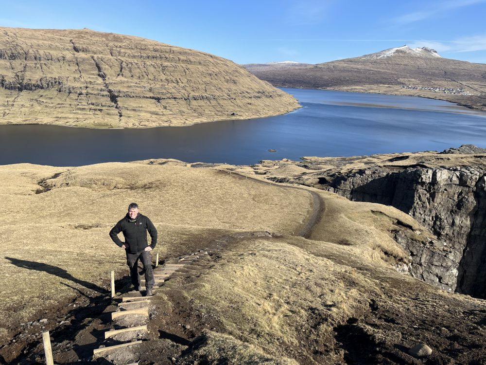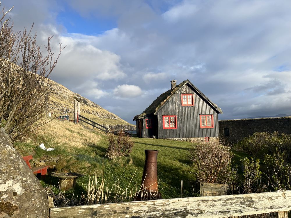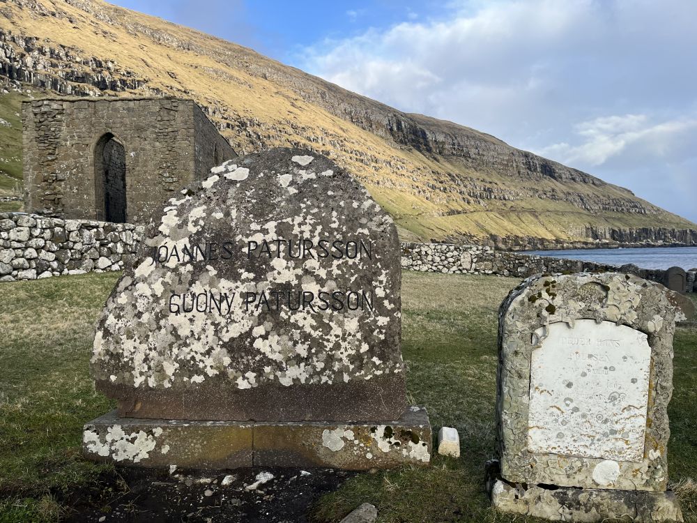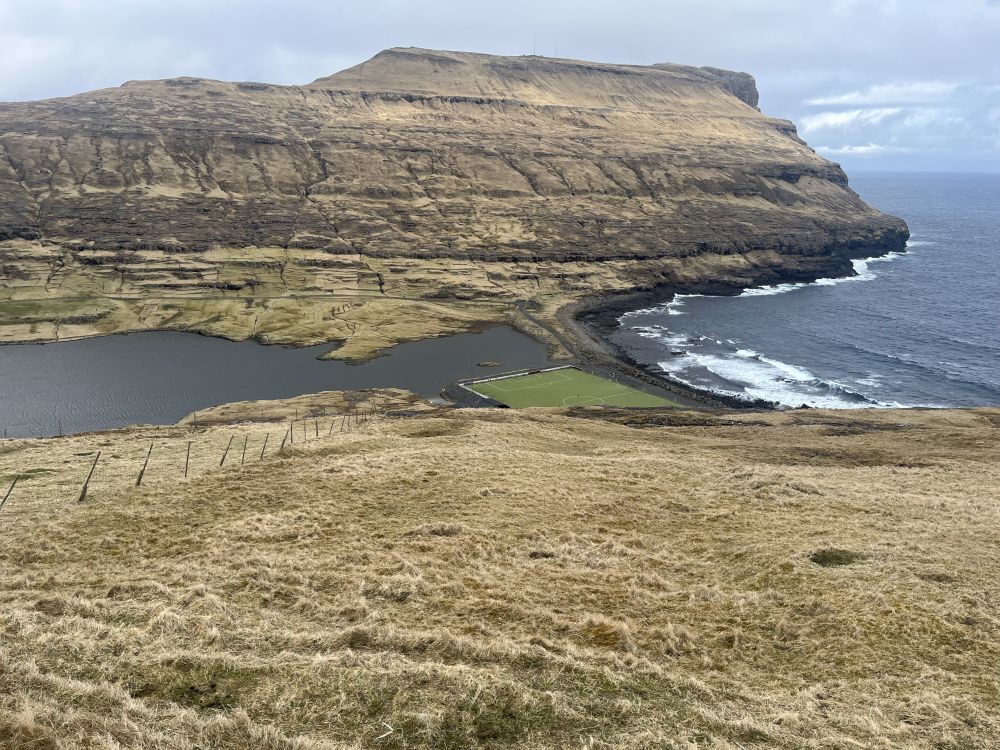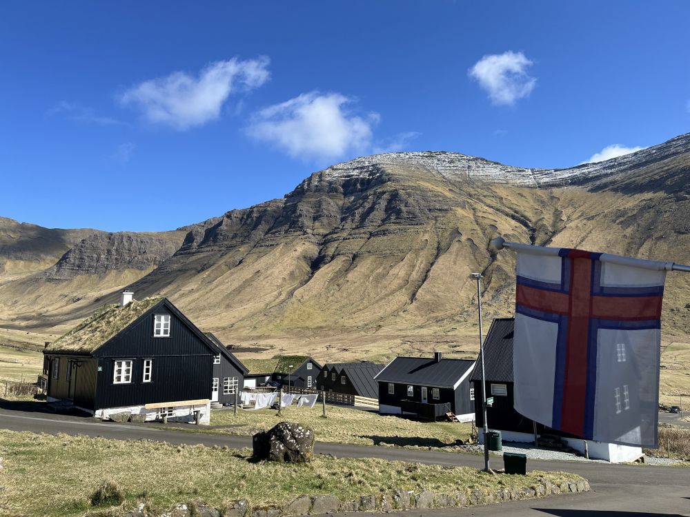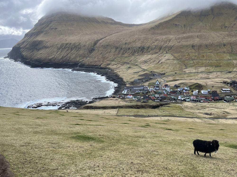 Risin og Kellingin (færøsk for Jætten og Kællingen) er navnet på de to store stensøjler der står ud for øen Eysturoy. Sagnet fortæller at Island havde til hensigt at trække Færøerne tættere hen til sig. Derfor blev kæmperne Risin og Kellingin bedt om at udføre denne opgave. Kæmpen blev stående i havet, mens hans kone klatrede op på bjerget for at binde Færøerne sammen for siden at skubbe dem op på ryggen af kæmpen. Lang historie kort – de nåede ikke at færdiggøre deres arbejde da morgenen begyndte at gry. Hun begav sig hjemad, kæmpen forrest og hans kone bagved. Men da solen steg op af havet forstenede solens stråler dem begge.En fodboldbane der ikke længere er i brug og efter planerne skal laves om til en campingplads. Tænker der er røget nogle bolde i søen/havet igennem årene.Fremme i den lille by Gjógv ligger denne lille lokale lokale coffee shop.Fra den lille café begyndte vores vandretur ad Ambadalur.Målet var toppen af fjeldet – ca. 400 meter over havet.Flot udsigt over byen Gjógv (udtales vist Jackv) der mest kendt for den naturliige havn i bunden af slugten, hvorefter de via en rampe trækkes op på land, så de ligger beskyttet fra bølgerne. Naturhavnen er sandsynligvis allerede blevet benyttet i vikingetiden.I 2005 besøgte Kronprins Frederik og Kronprinsesse Mary Gjógv. Et lokalt par fik den idé at placere en bænk med flot udsigt. Mary indviede bænken og idag kendes bænken som “Marys Bænk”.En del fulgle havde slået sig ned langs kløftens sider, og i sommermånederne kan man se lunderne når de kommer frem fra deres huler og flyver ud på havet efter føde til ungerne. Vi valgte ikke at spise på Anus Steakhouse…